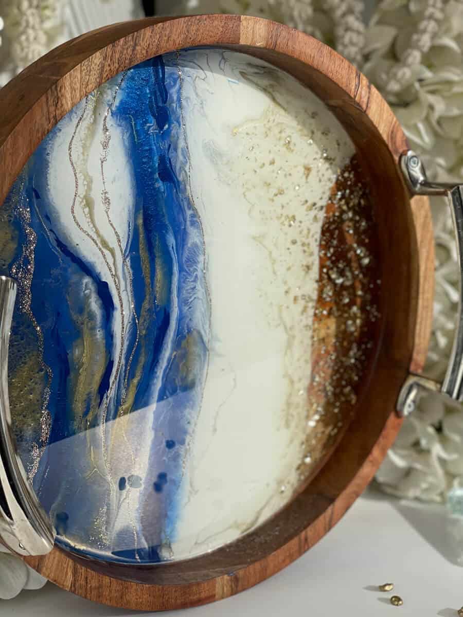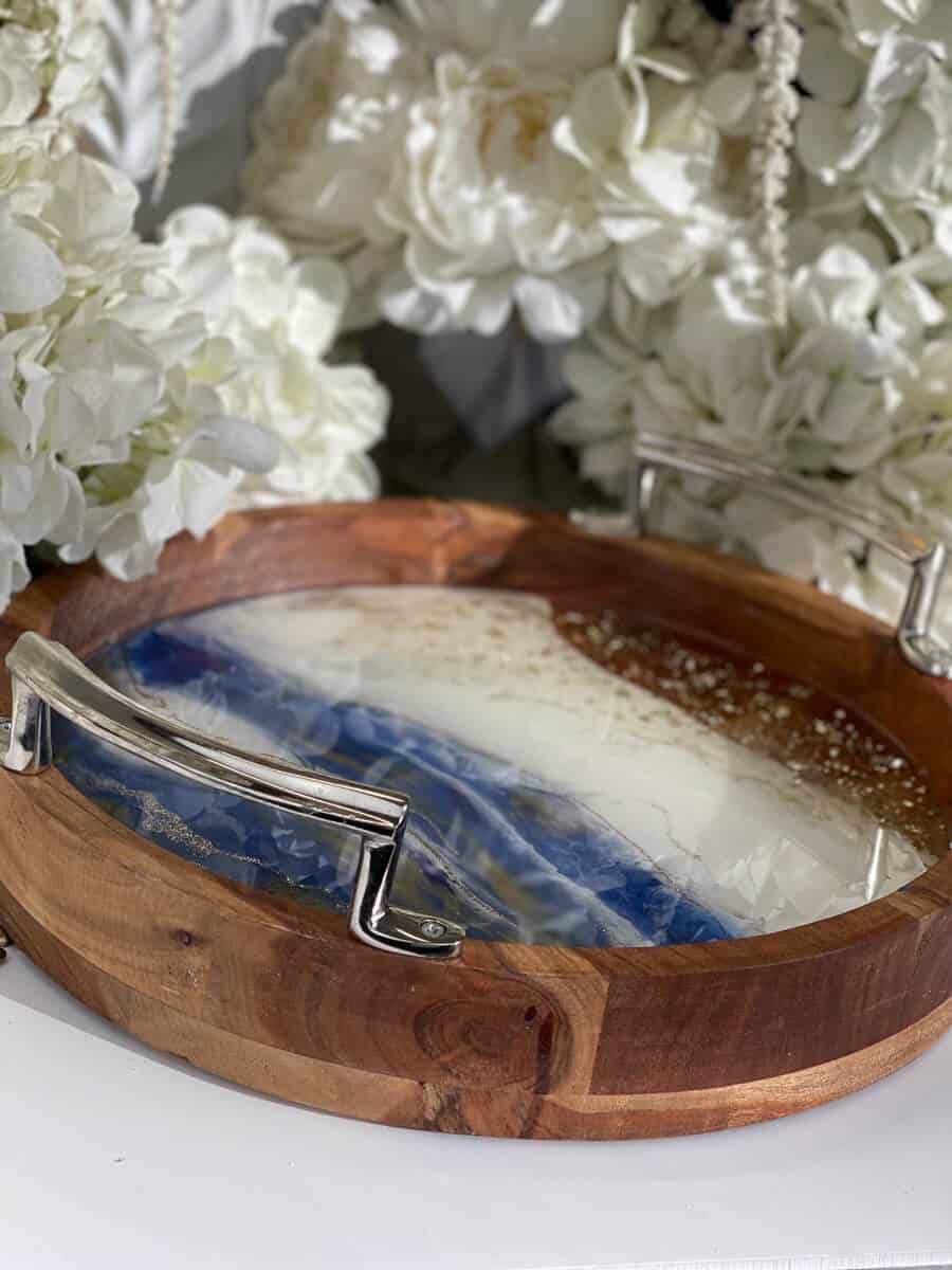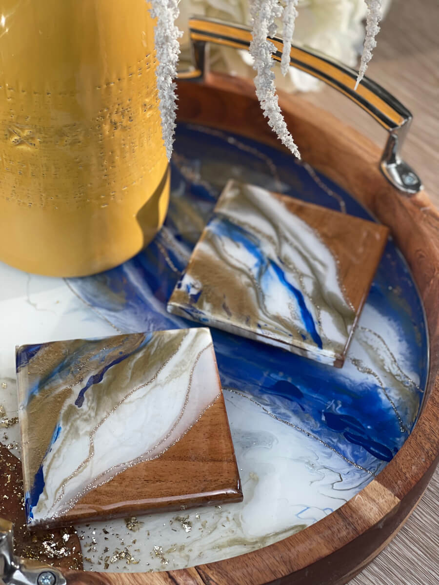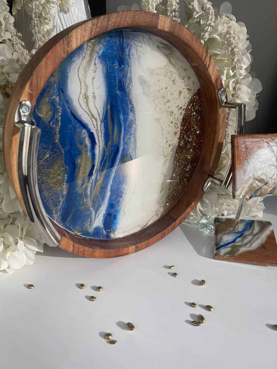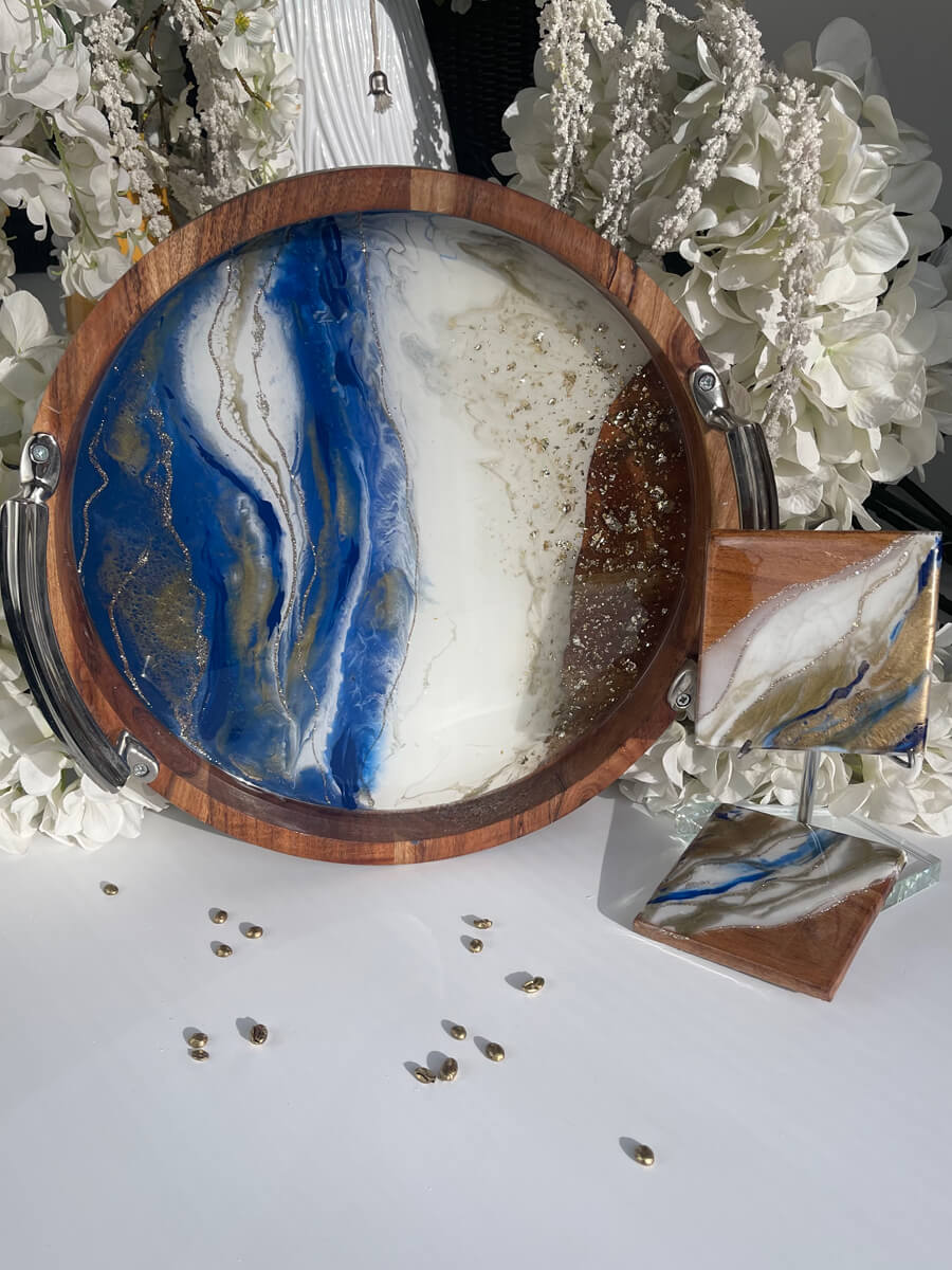 The round blue resin wooden tray with 2 matching coasters is the perfect addition to your home décor! The tray was hand poured in different shades of blue and white with gold flakes details, making it a beautiful piece perfect for serving tapas, enjoying a casual dinner, cheese platters, charcuterie, desserts, and more. Plus, the tray can even be placed on display in your kitchen interior styling! It would also make a great wedding gift, birthday gift, or housewarming gift.