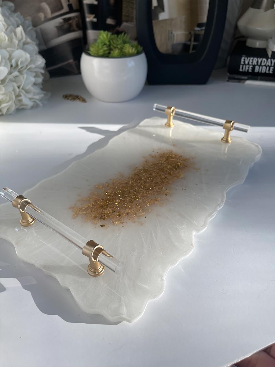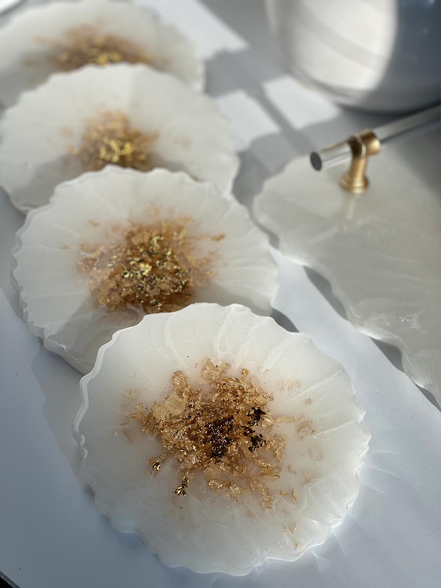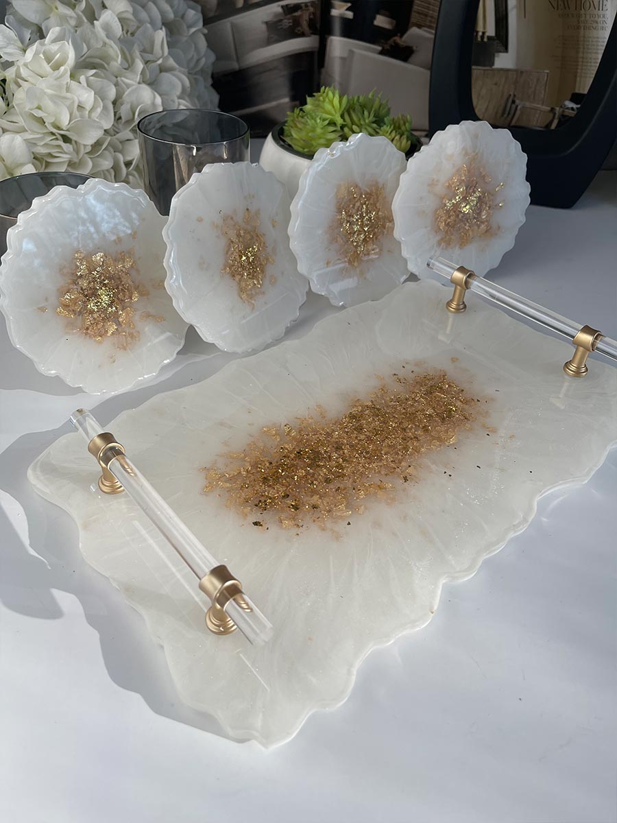 This stylish white resin coaster and tray set is the perfect way to show your personality and style. The beautiful, hand-crafted set is made with a high-quality resin material and the gold foil leafing design makes it a stylish addition to any decor. Plus, the Acrylic handles add a touch of luxury.