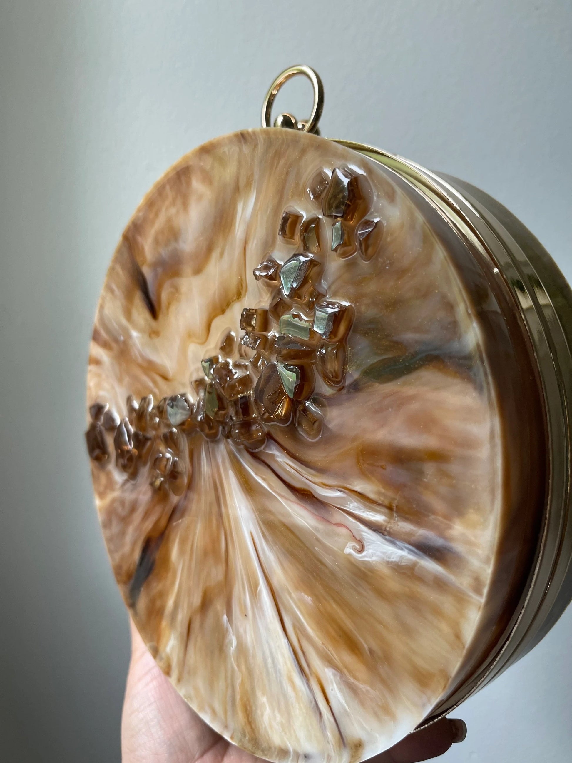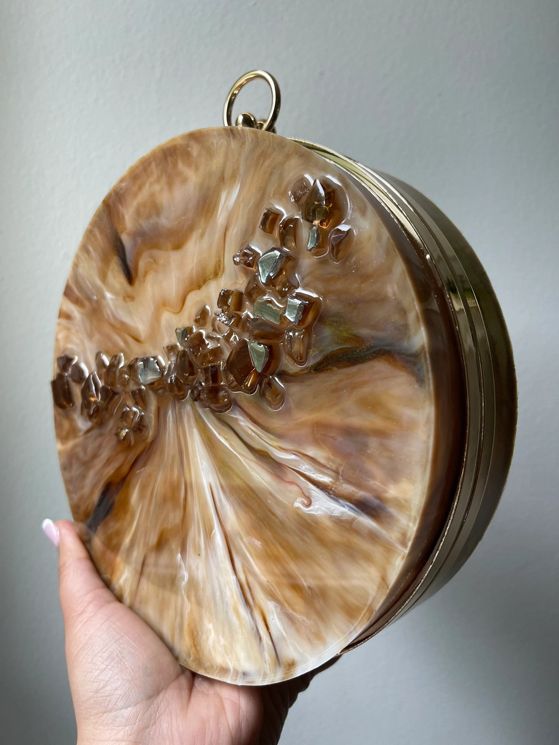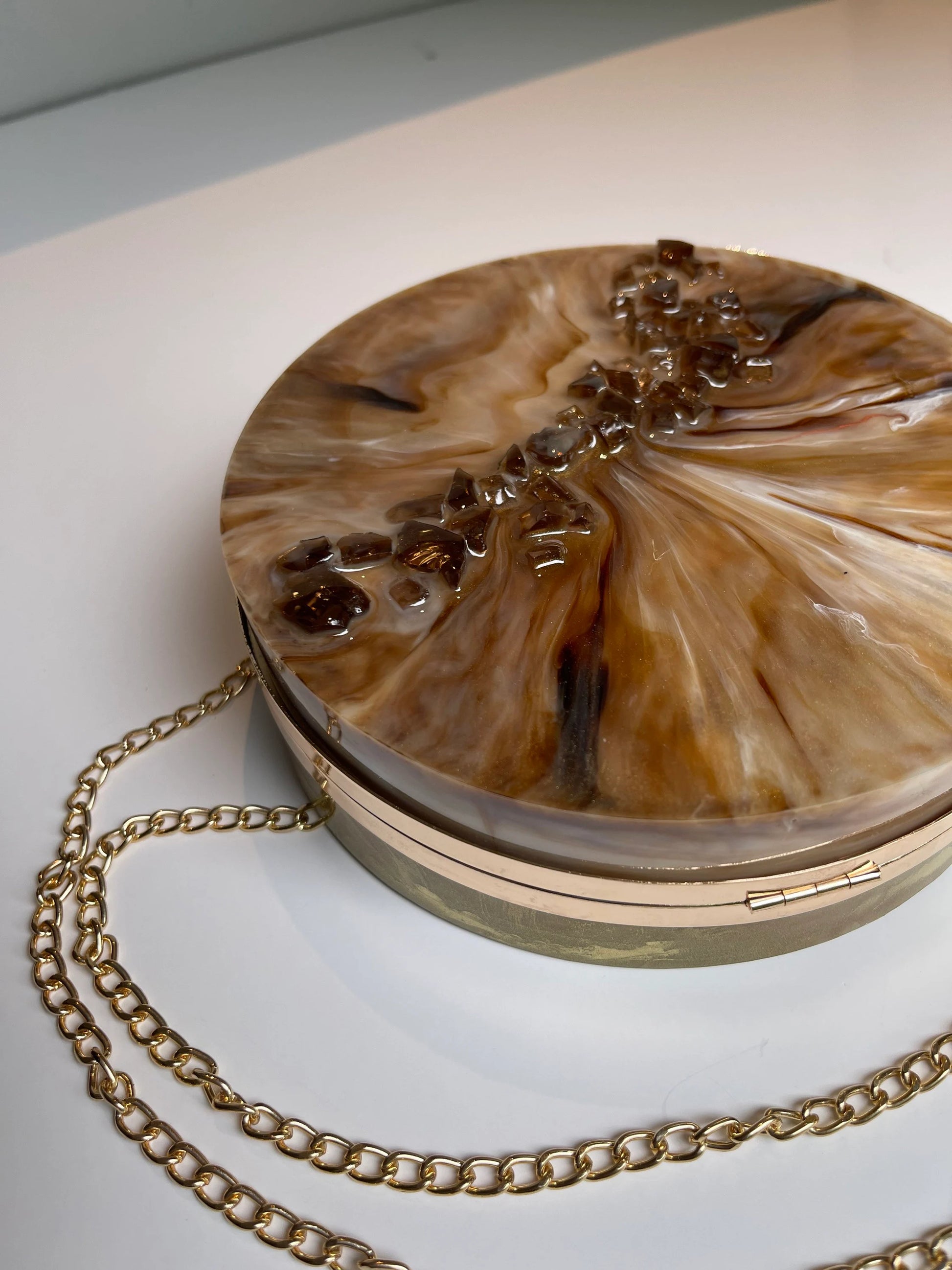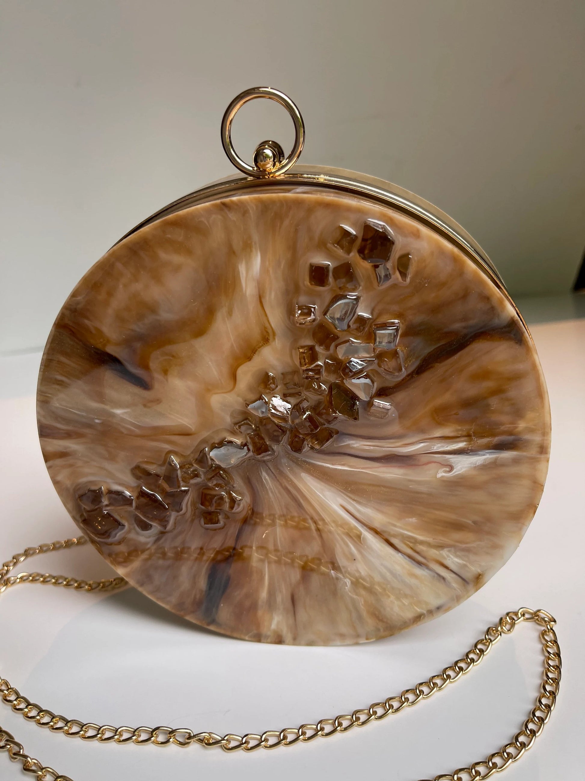 Looking for a unique and stylish purse that can fit all your essentials? Look no further than our bronze, gold, and handbag/clutch. This beautiful purse is handcrafted with a large capacity, making it perfect for carrying your phone, sunglasses, lipstick, wallet, and more. The stylish design is sure to turn heads, and the gold hardware adds a touch of luxury. Whether you're hitting the town or running errands, this purse is a must-have.