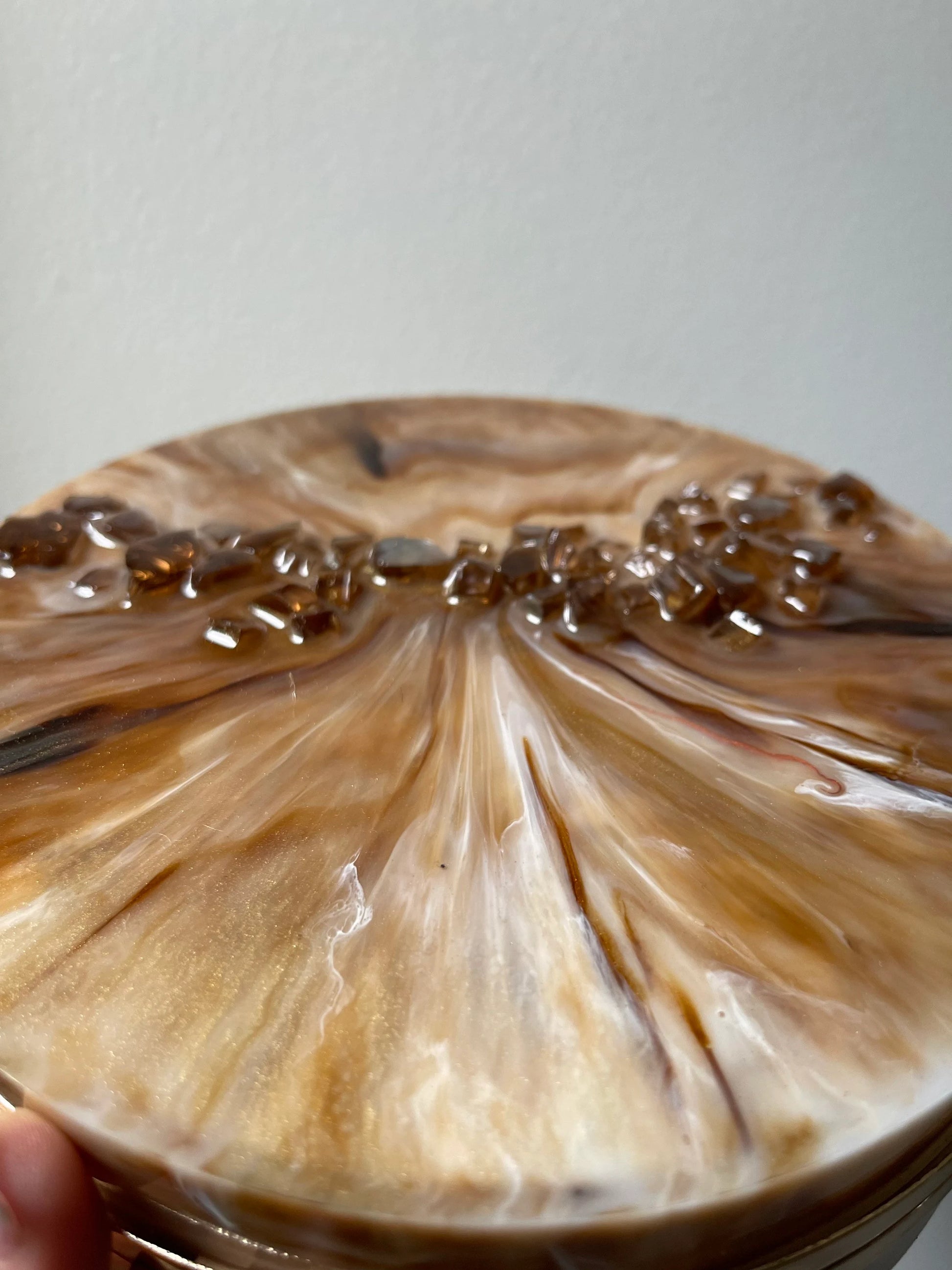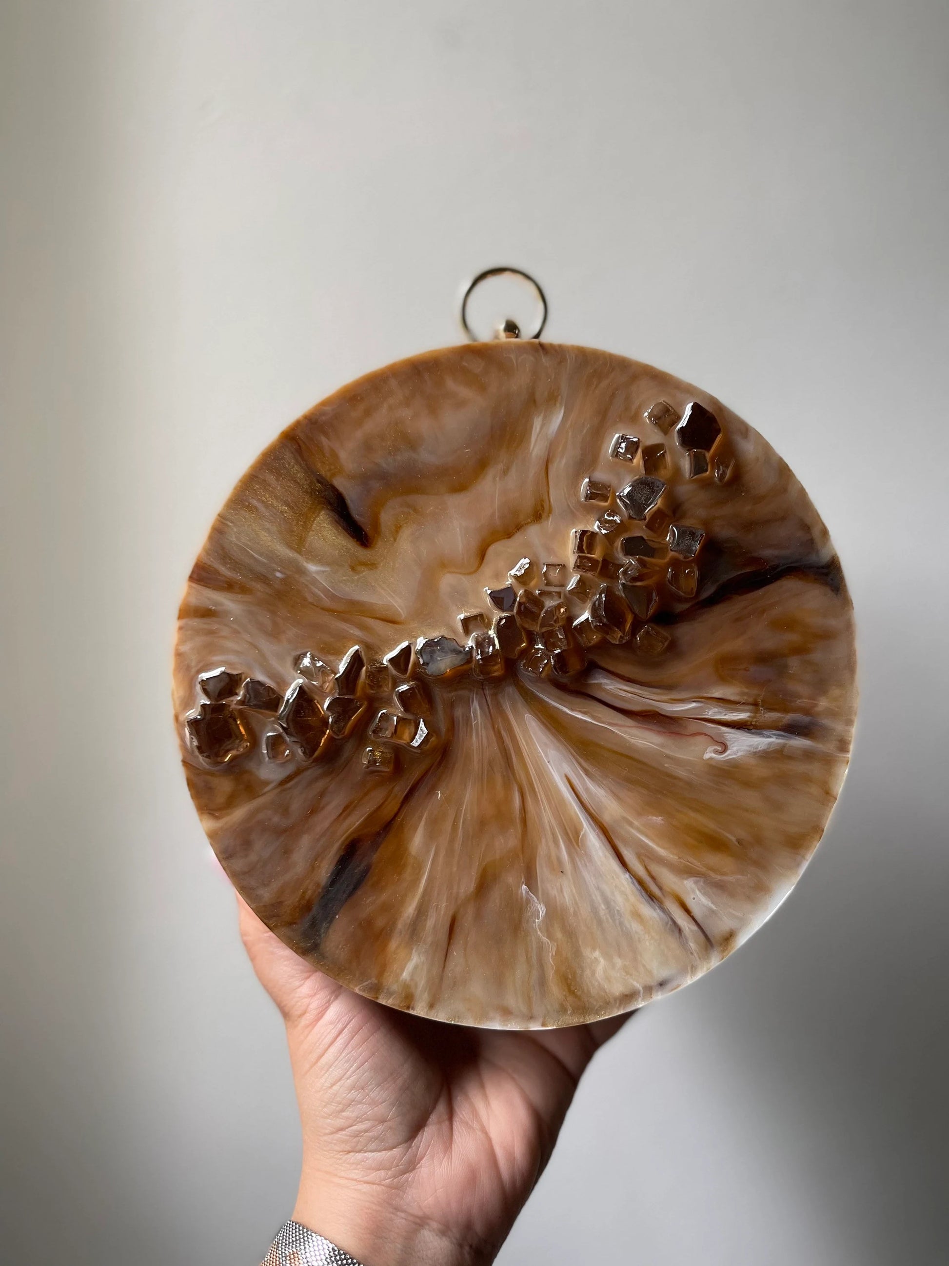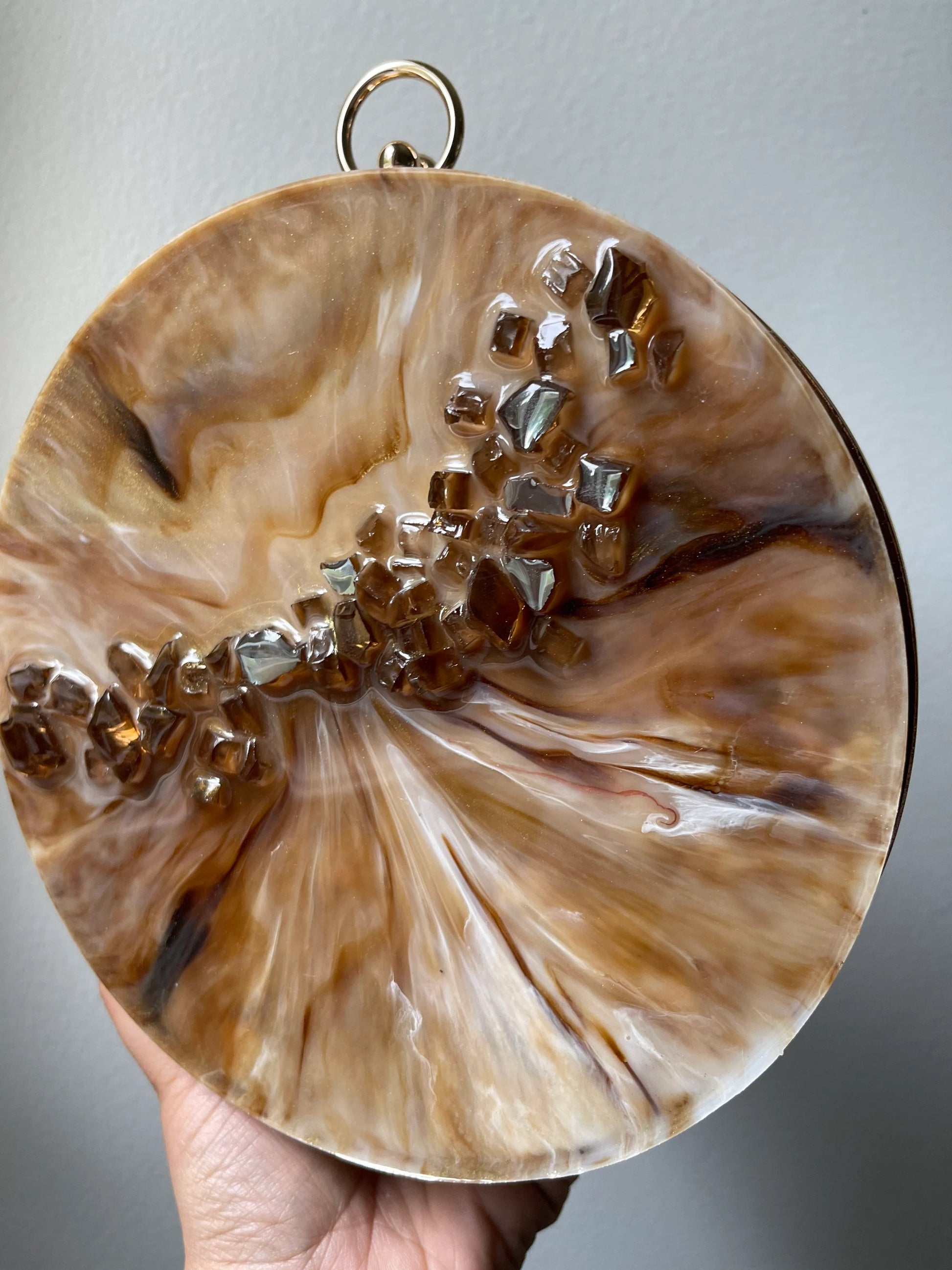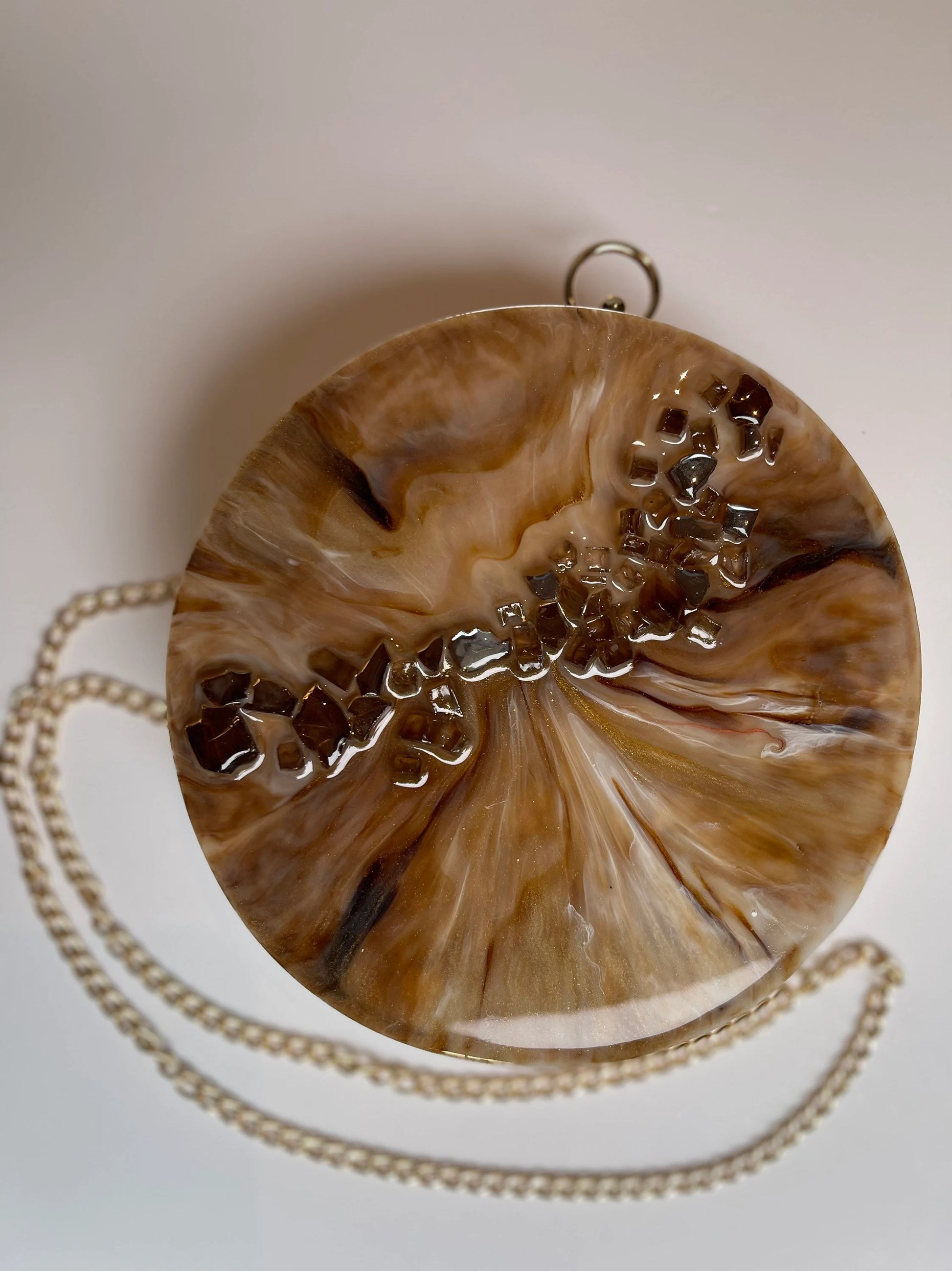 Looking for a unique and stylish purse that can fit all your essentials? Look no further than our bronze, gold, and handbag/clutch. This beautiful purse is handcrafted with a large capacity, making it perfect for carrying your phone, sunglasses, lipstick, wallet, and more. The stylish design is sure to turn heads, and the gold hardware adds a touch of luxury. Whether you're hitting the town or running errands, this purse is a must-have.