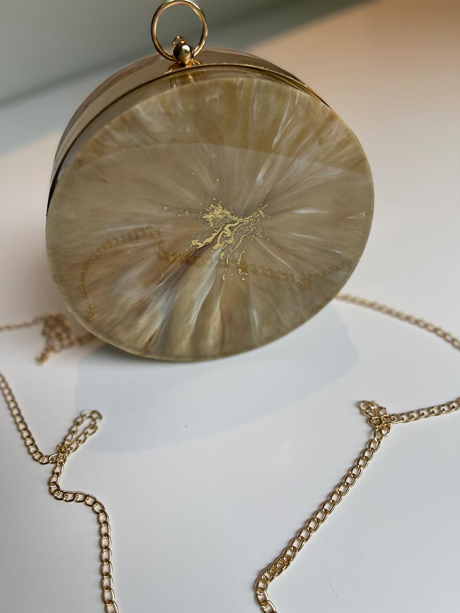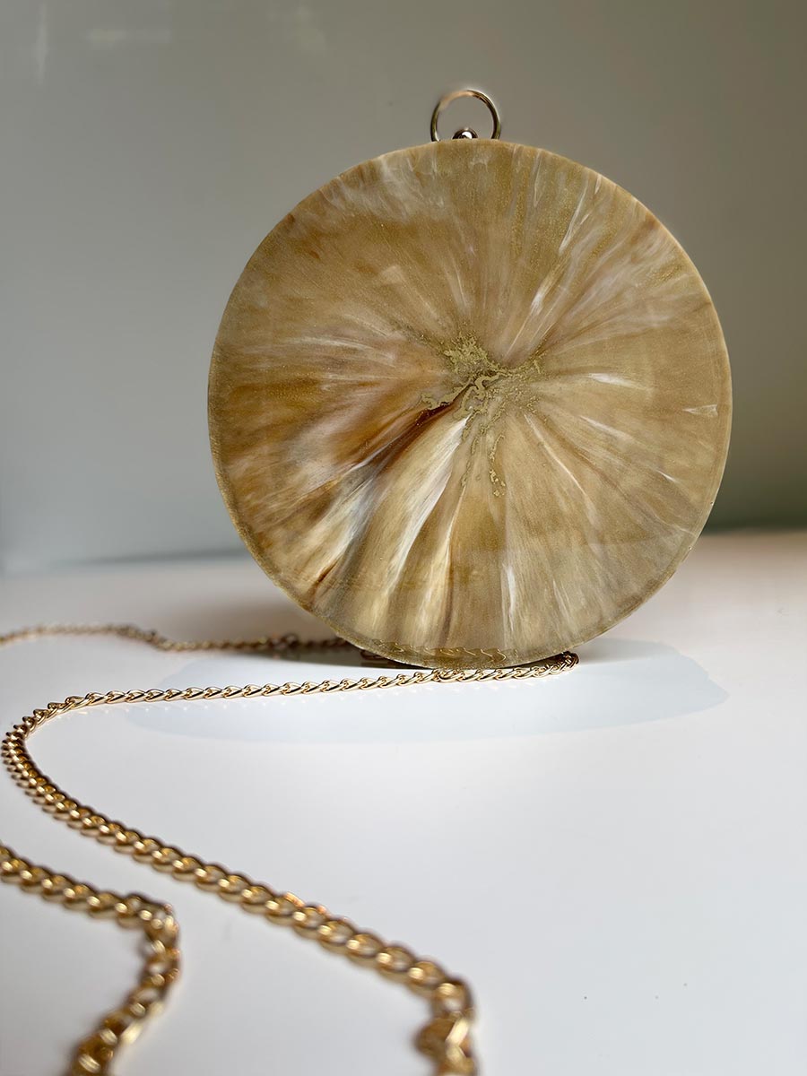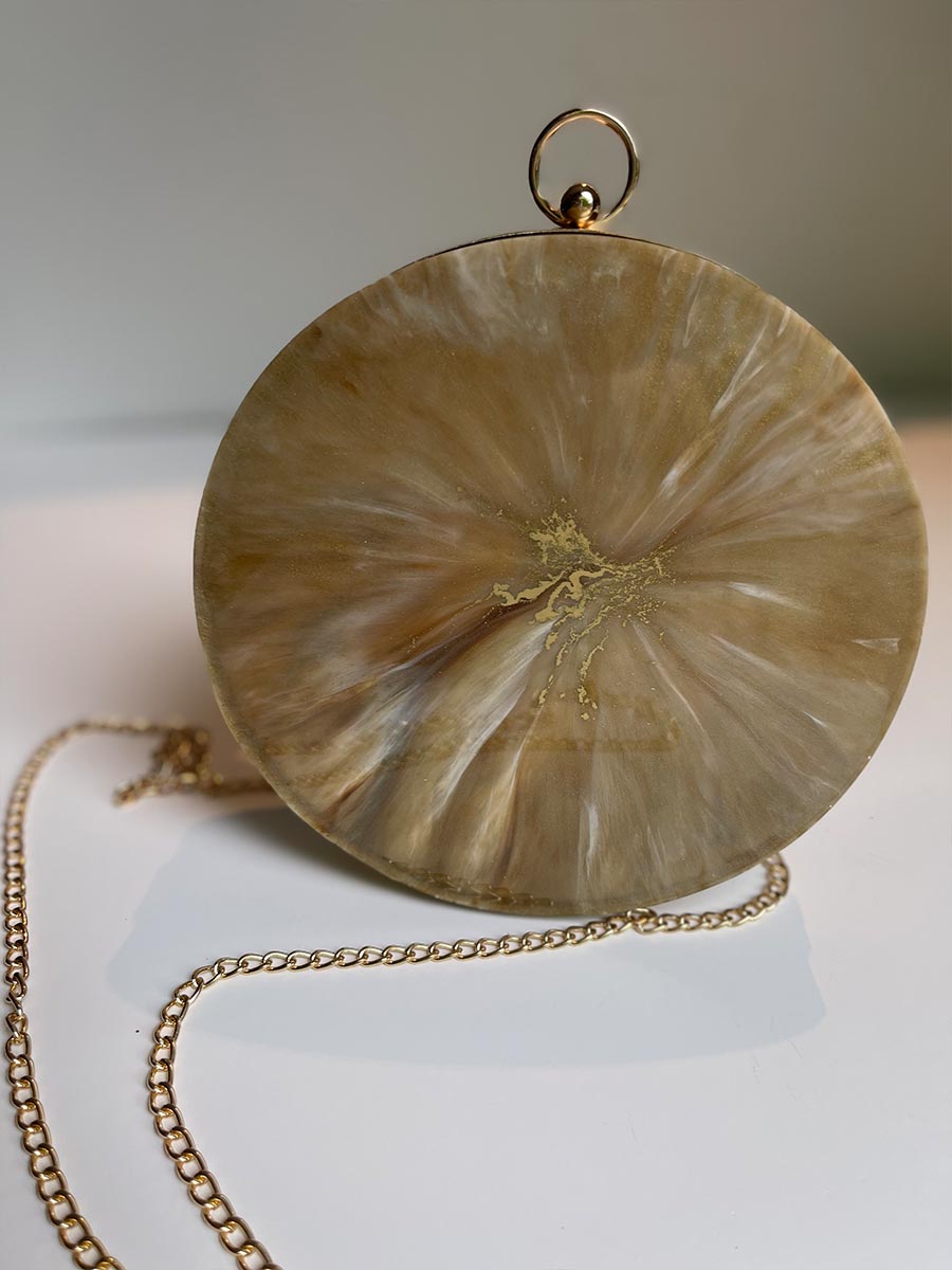The Gold and Brown Round Handbag is a one-of-a-kind design that has been handcrafted. It can fit your phone, sunglasses, lipstick, wallet, and more! This purse’s large capacity will make sure you have enough room to bring everything you need.