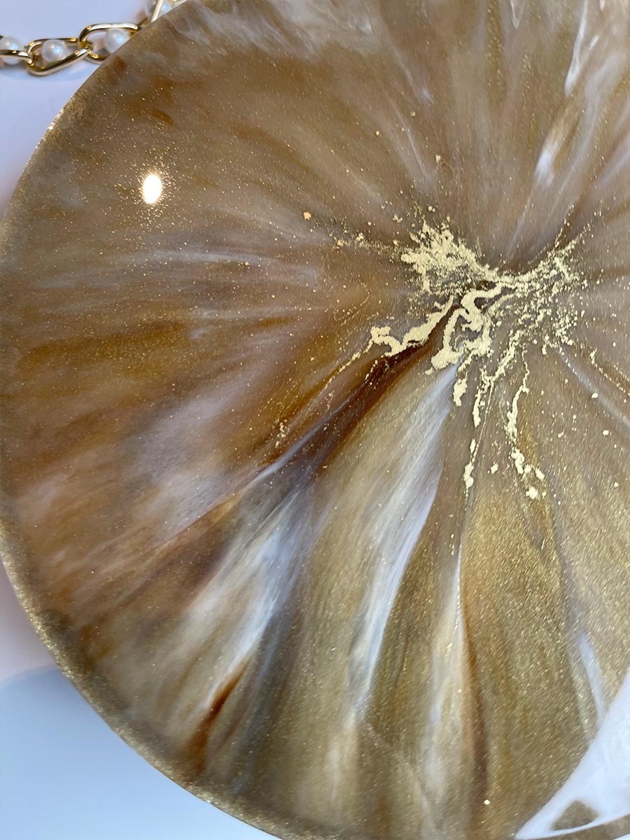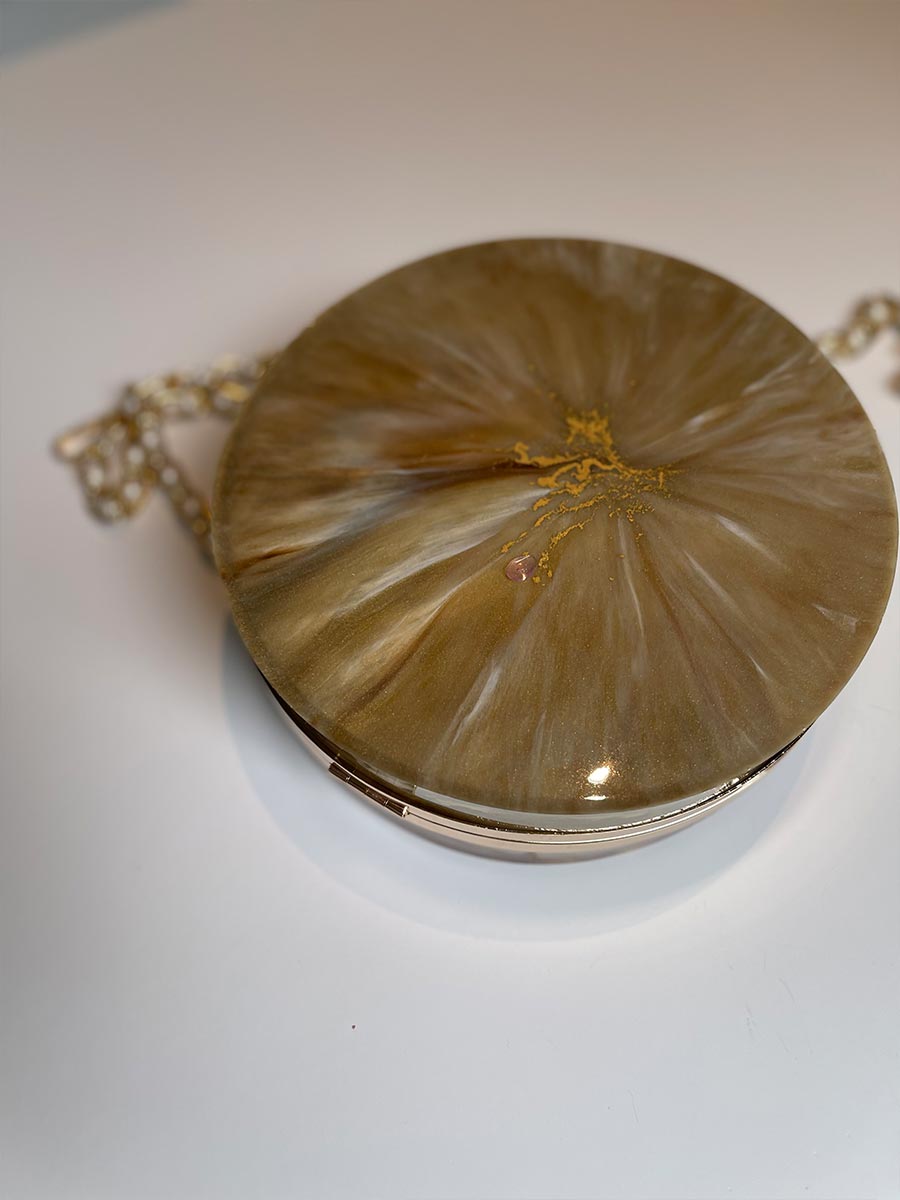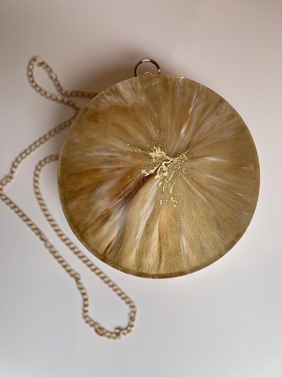 The Gold and Brown Round Handbag is a one-of-a-kind design that has been handcrafted. It can fit your phone, sunglasses, lipstick, wallet, and more! This purse’s large capacity will make sure you have enough room to bring everything you need.