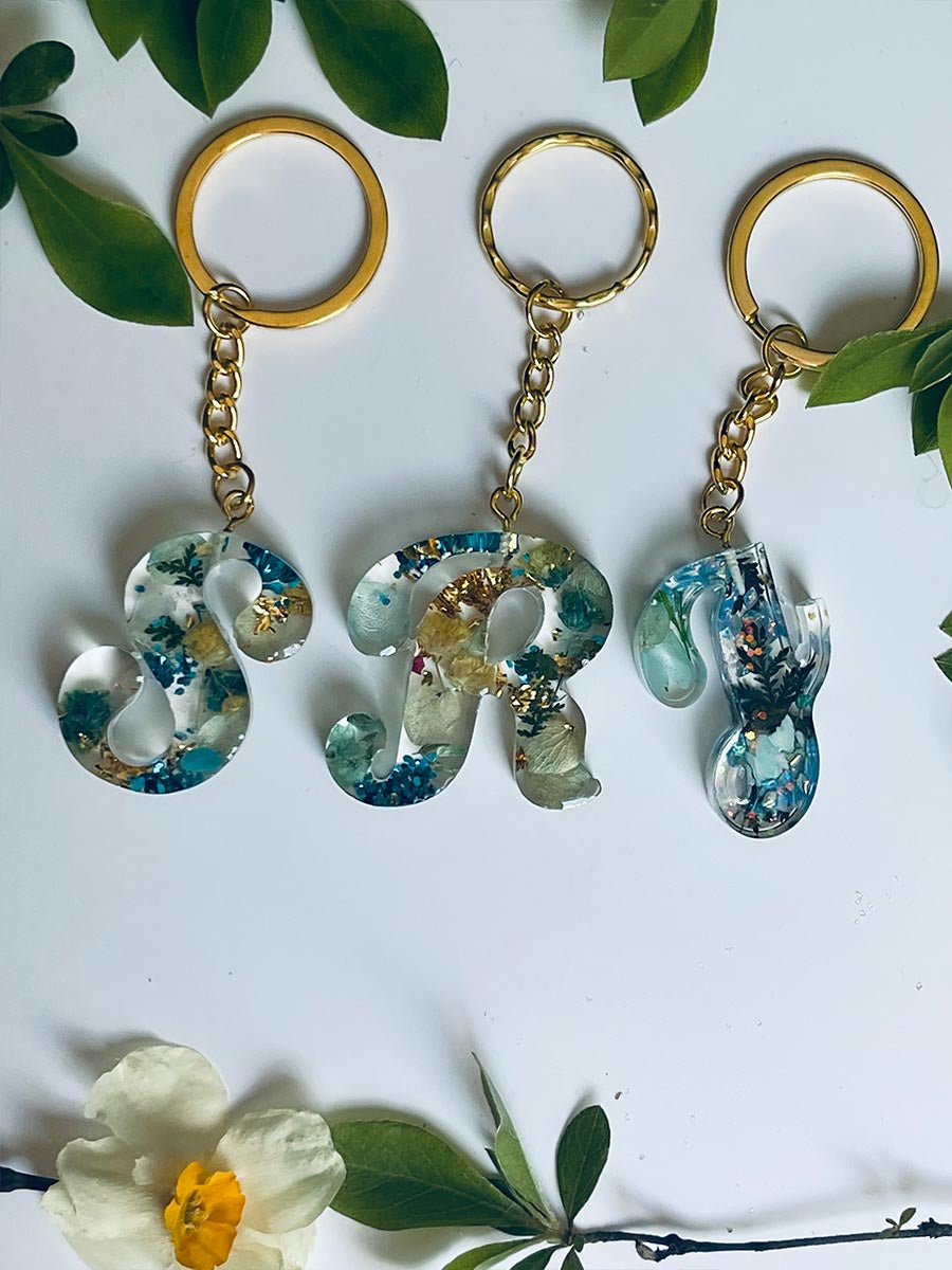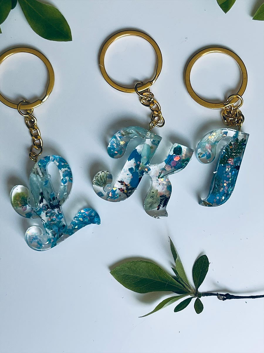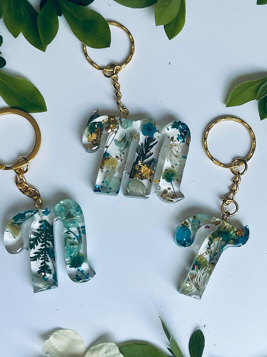 Our beautiful custom letter initials keychains are made with real flowers. Each keychain is unique and one-of-a-kind because we use the natural colors of the flowers to create our stunning teal blue color. Not only are they a great accessory for your keys, but they also make a perfect gift for any occasion! Add some personality to your style with these unique keychains. Order yours today!