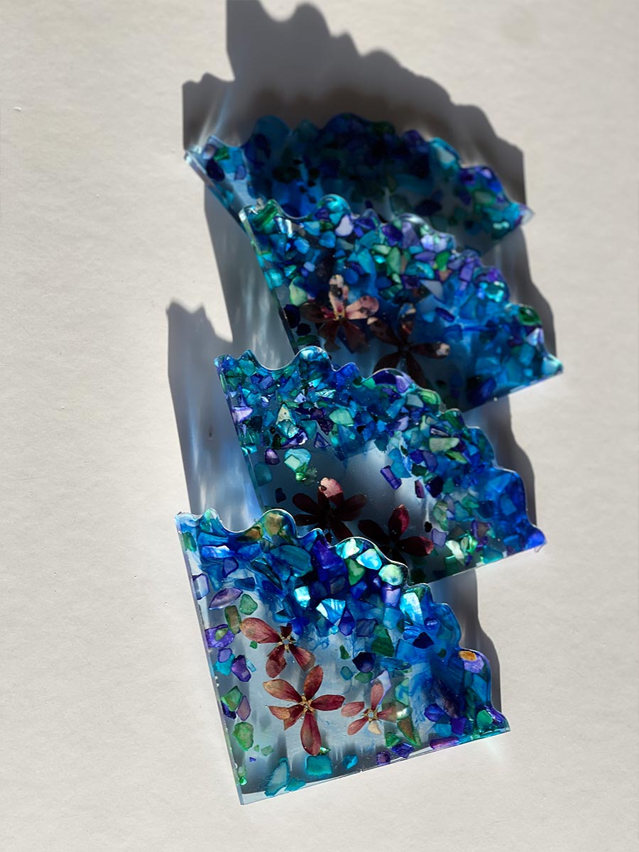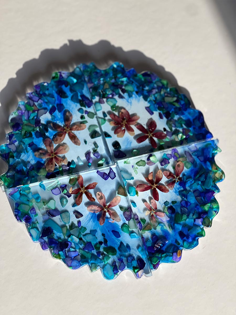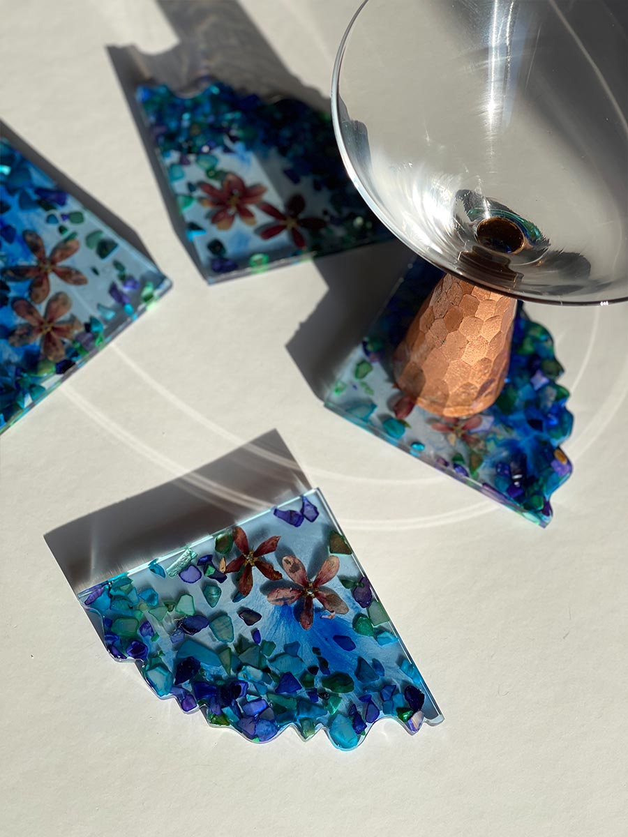 Looking for a unique and beautiful way to protect your surfaces? Look no further than these gorgeous coasters made with real pressed flowers in a stunning teal blue hue. Perfect for holding glasses of wine or other drinks, this coaster set is a must-have for any kitchen or dining room. Not only will it help protect your surfaces from condensation and drips, but it also makes a great conversation starter when entertaining guests. So whether you're hosting a party or simply enjoying a quiet evening at home, this coaster set is sure to make your experience more enjoyable.