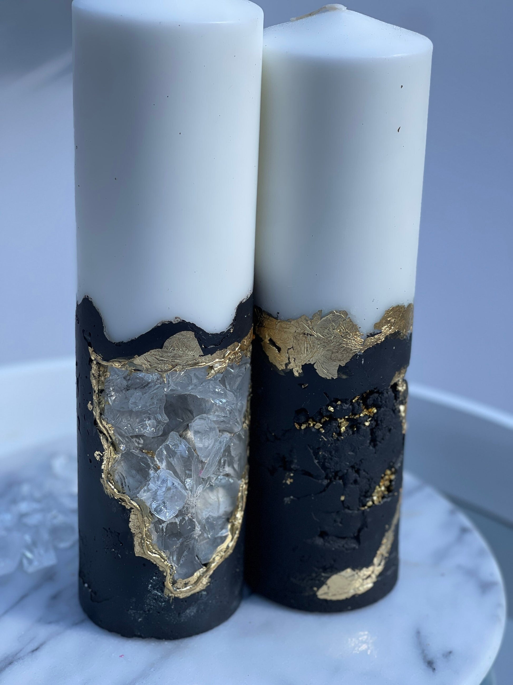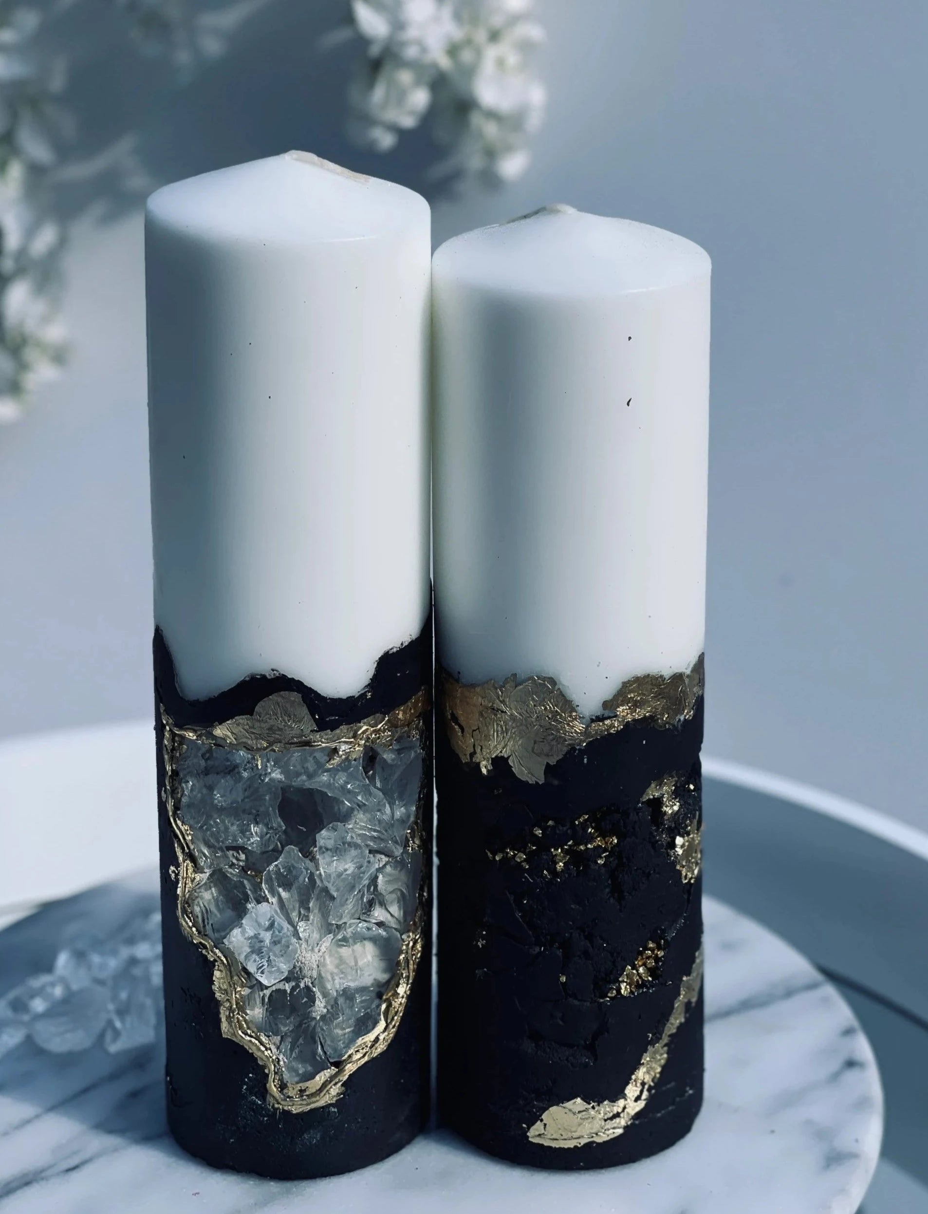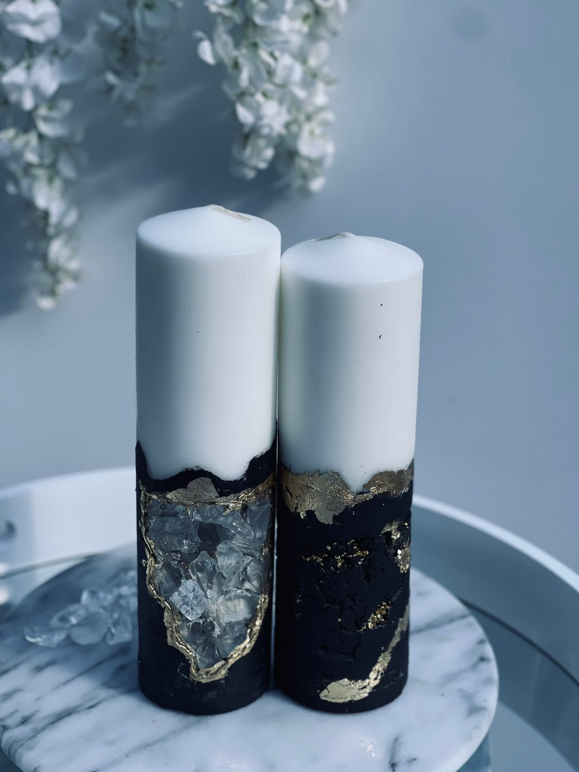 Are you looking for a luxurious gift? Look no further than Luxury Crystal's Black and Gold Pillar Candles. These candles are set in a concrete holder and come with beautiful crystals. They make the perfect present for a housewarming or to treat yourself. Made with high-quality materials, these candles are sure to impress. So why not add them to your cart today?