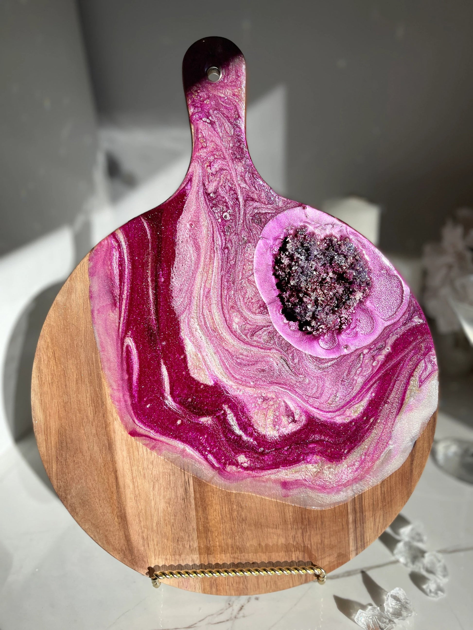 If you're looking for a unique and stylish way to serve cheese and other appetizers, then this Round Purple and Pink Color Geode Marble Design Cheeseboard is the perfect solution! The beautiful resin art is hand-poured in pink and purple colors, and the stone was handmade as well, making this a very one-of-a-kind board. It makes a great present for weddings, birthdays, housewarmings, and more. Plus, it's also perfect for displaying in your kitchen as part of your interior styling.