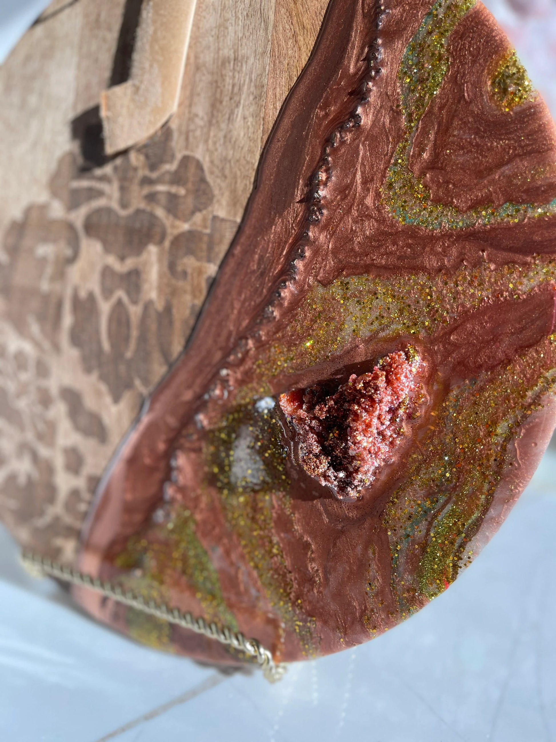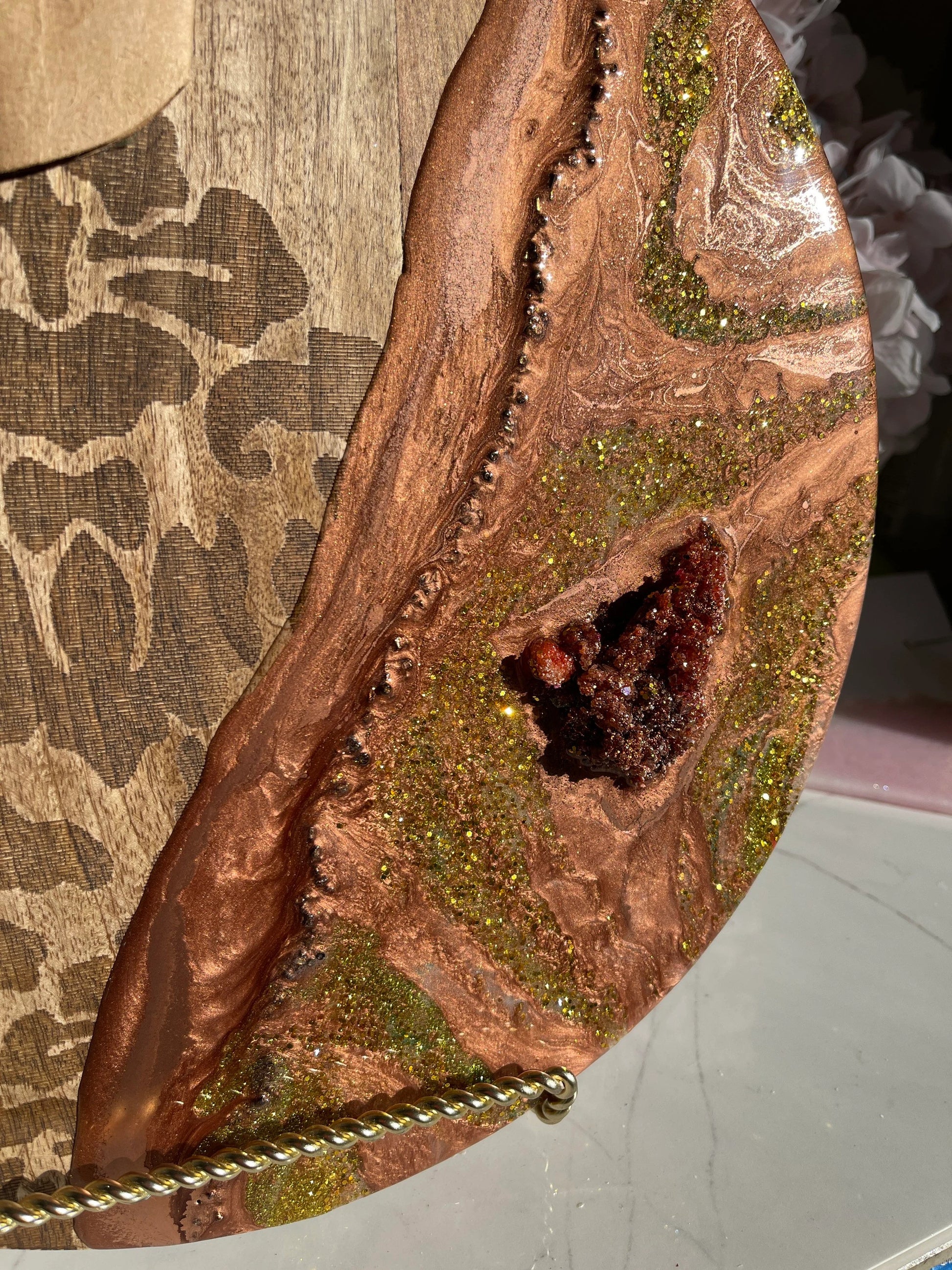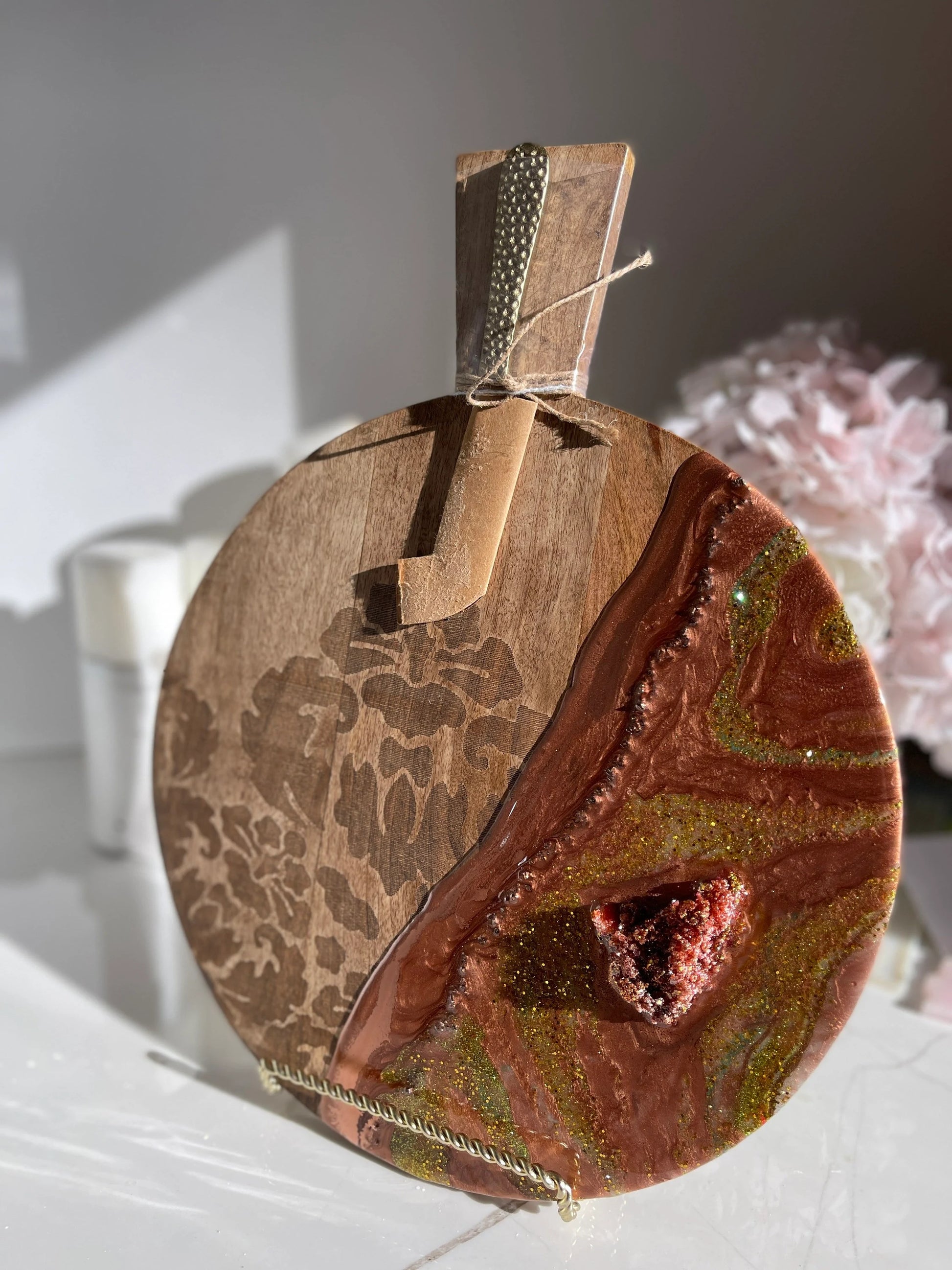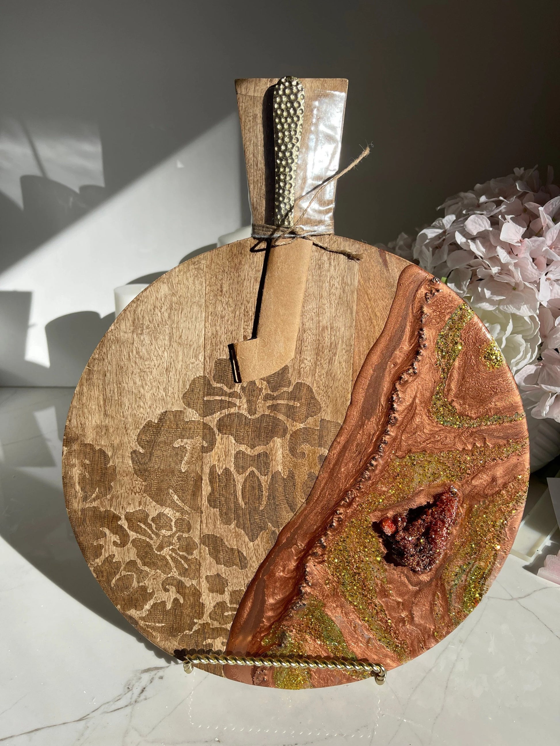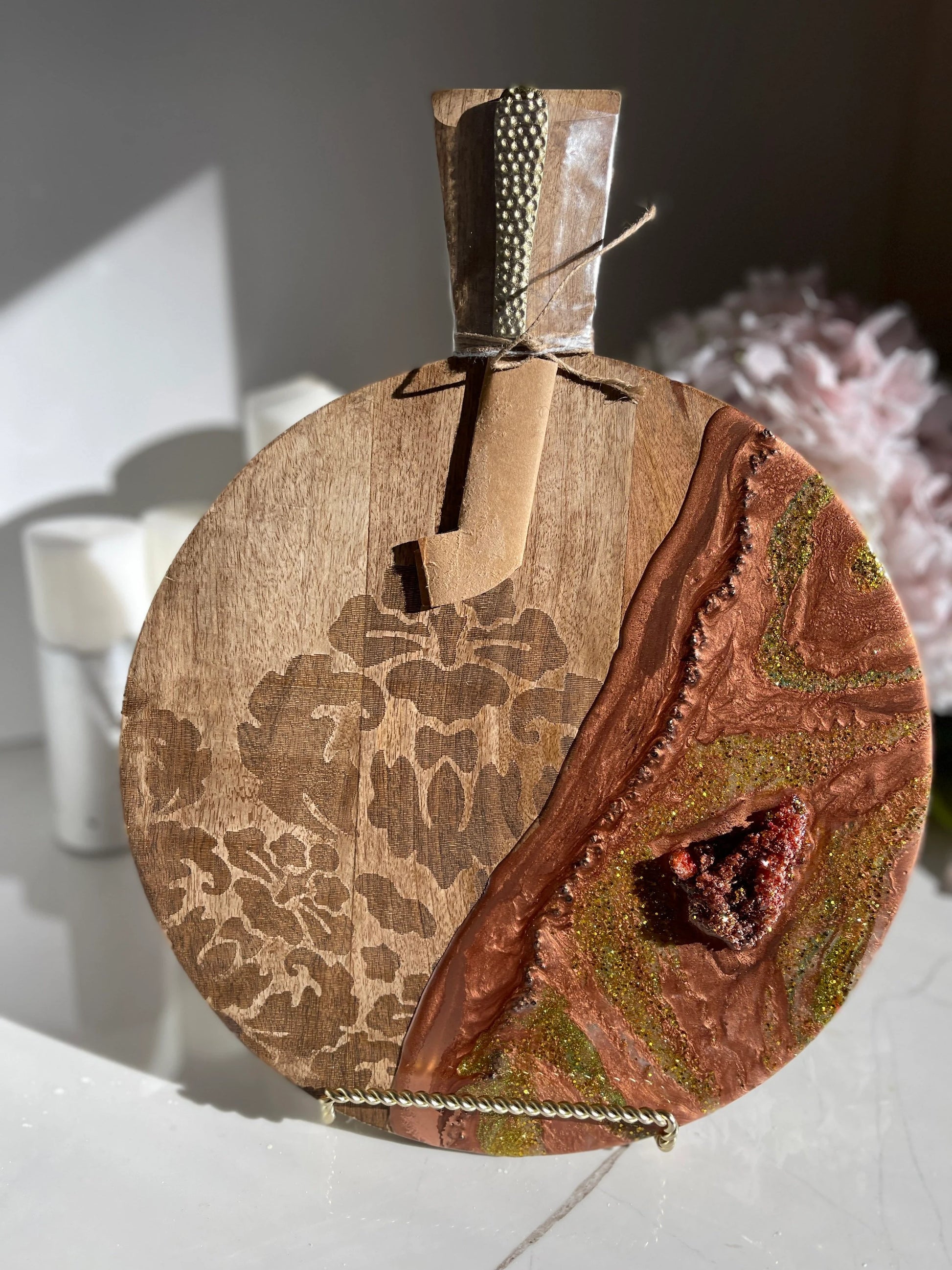 A gorgeous resin cheese board perfect for entertaining. The resin art was hand-poured in copper colors and the stone was handmade making this a very unique and one-of-a-kind board. This set comes with a knife (as seen in the pictures) makes a great present. Perfect as a wedding gift; birthday gift or housewarming gift.