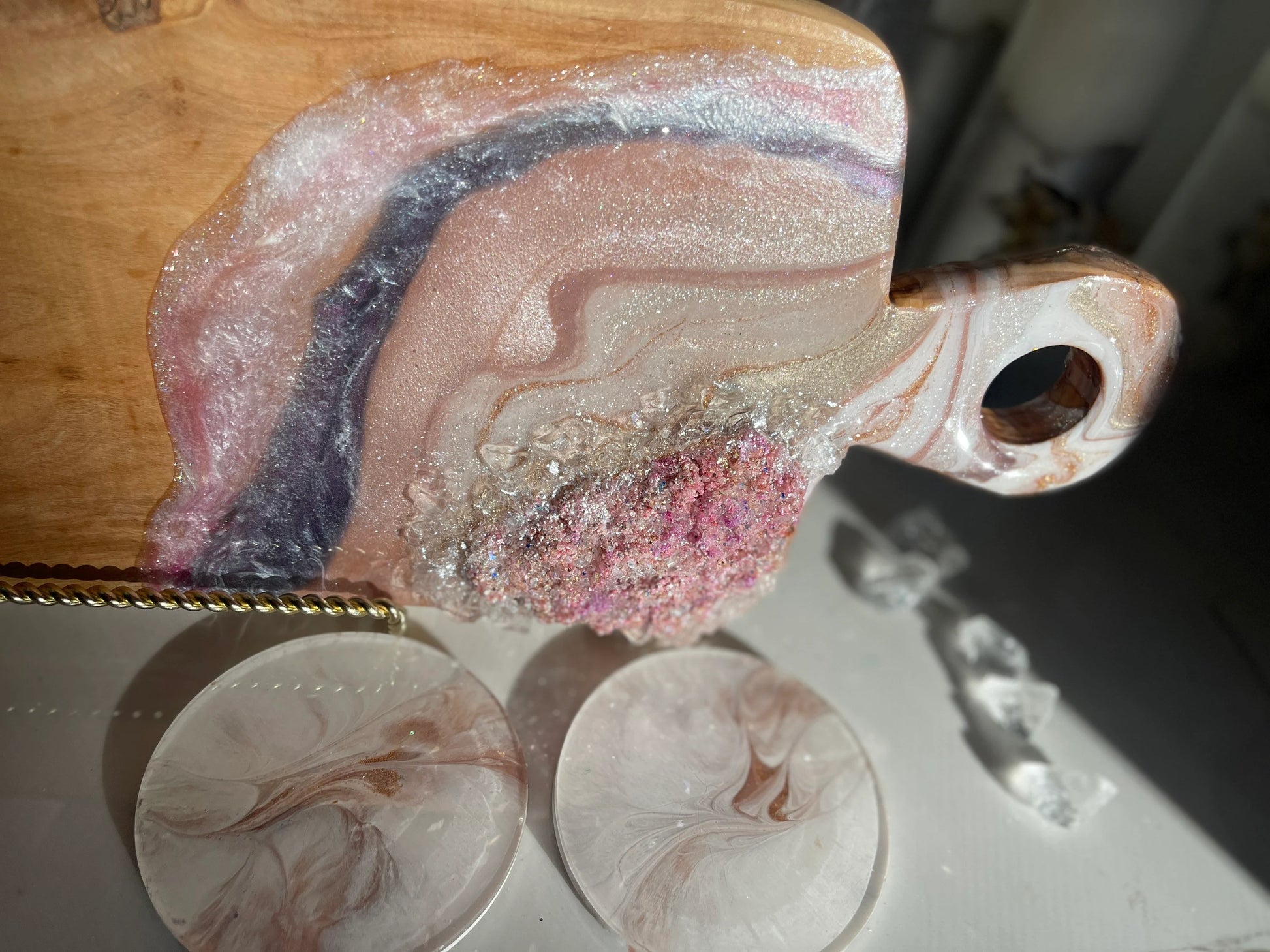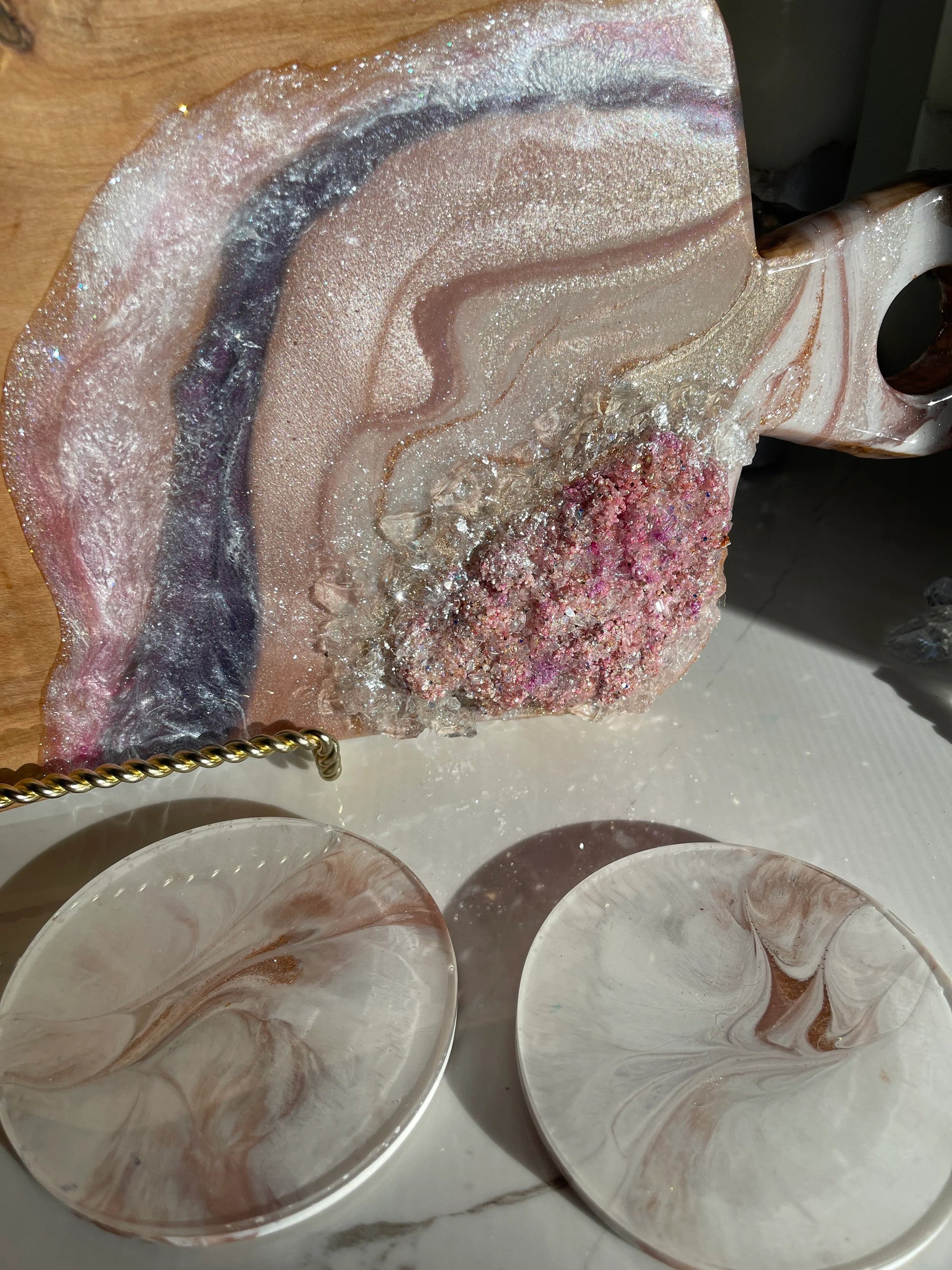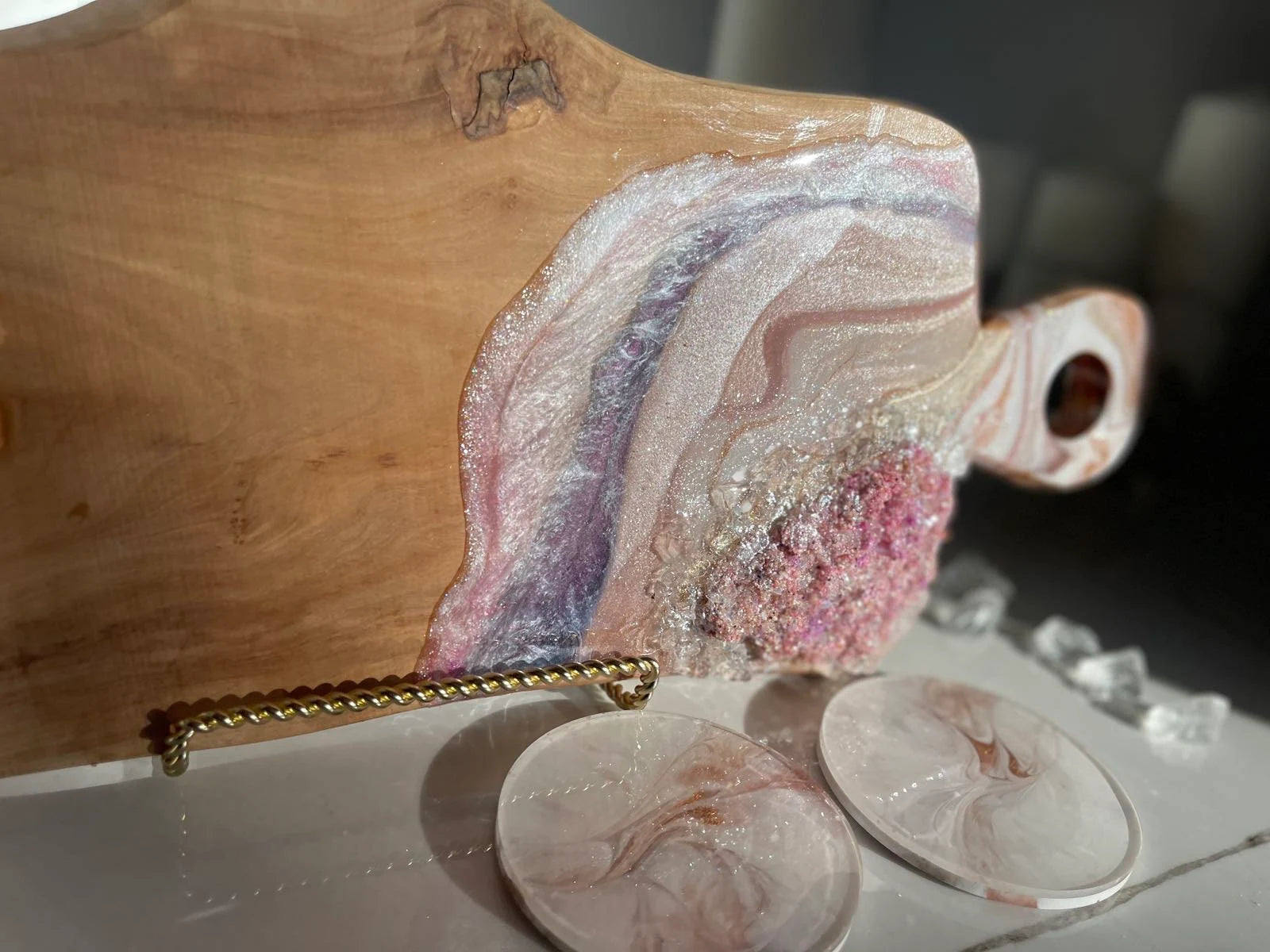 If you're looking for a one-of-a-kind cheeseboard set that will impress your guests, look no further than this Purple, Pink Geode Design Cheeseboard Set. The beautiful resin art is hand-poured in shades of purple and pink, and the stone is handmade, making this set truly unique. The set comes with two matching round coasters, making it a perfect gift for any occasion. Whether you're giving it as a wedding gift, a birthday gift, or a housewarming gift, this set is sure to please.
