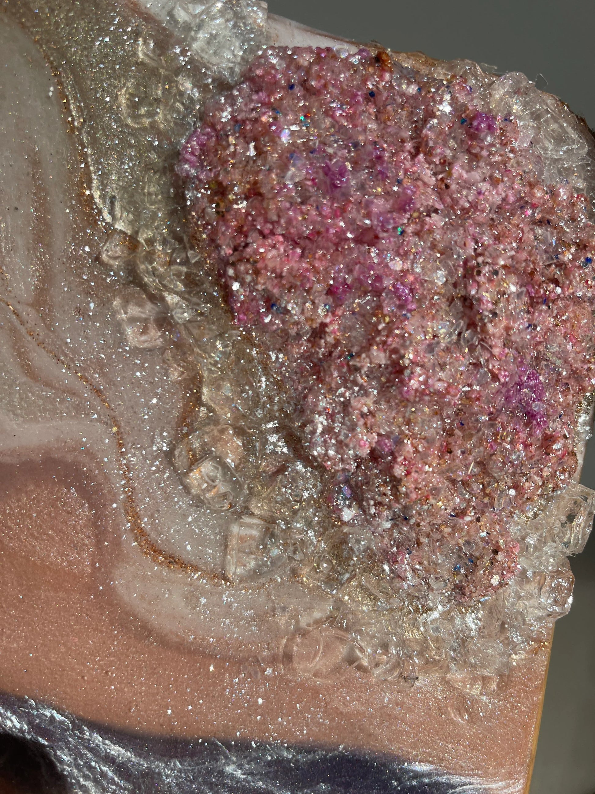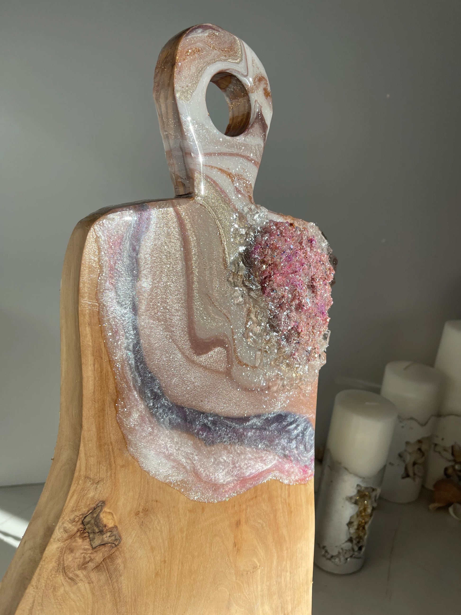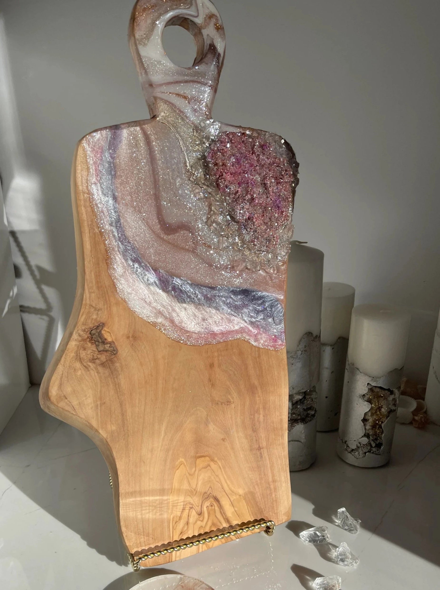 If you're looking for a one-of-a-kind cheeseboard set that will impress your guests, look no further than this Purple, Pink Geode Design Cheeseboard Set. The beautiful resin art is hand-poured in shades of purple and pink, and the stone is handmade, making this set truly unique. The set comes with two matching round coasters, making it a perfect gift for any occasion. Whether you're giving it as a wedding gift, a birthday gift, or a housewarming gift, this set is sure to please.