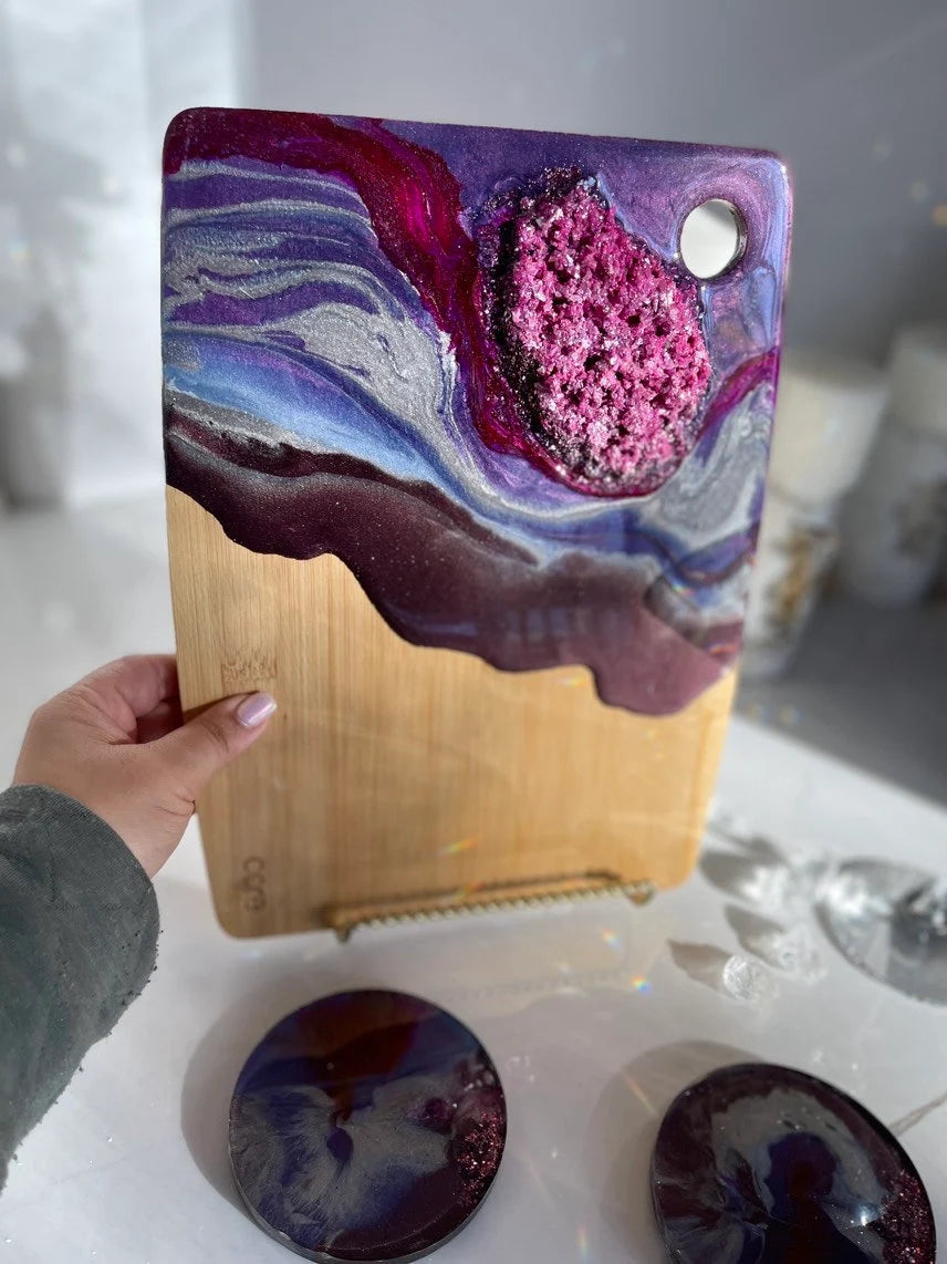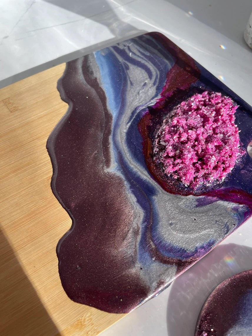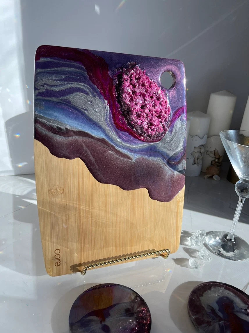 If you're looking for a one-of-a-kind cheeseboard set that will impress your guests, look no further than this Purple, Pink Geode Design Cheeseboard Set. The beautiful resin art is hand-poured in shades of purple and pink, and the stone is handmade, making this set truly unique. The set comes with two matching round coasters, making it a perfect gift for any occasion. Whether you're giving it as a wedding gift, a birthday gift, or a housewarming gift, this set is sure to please.