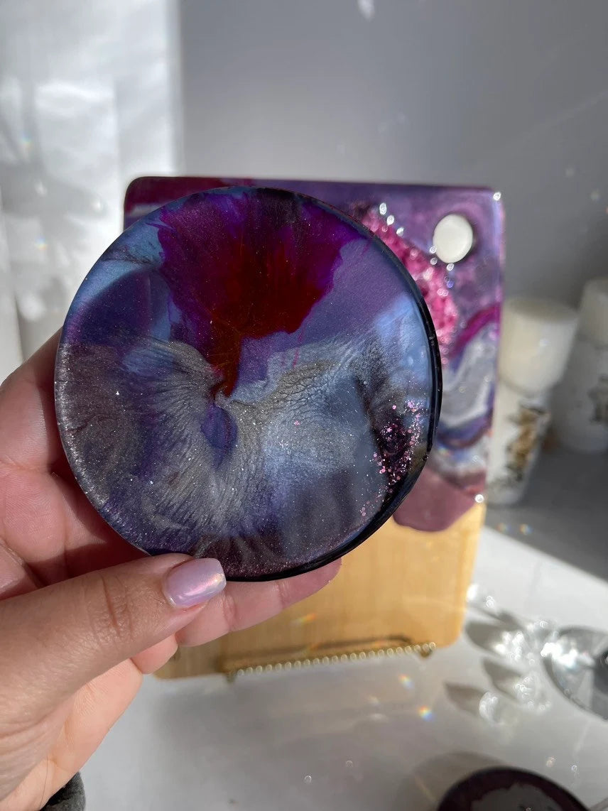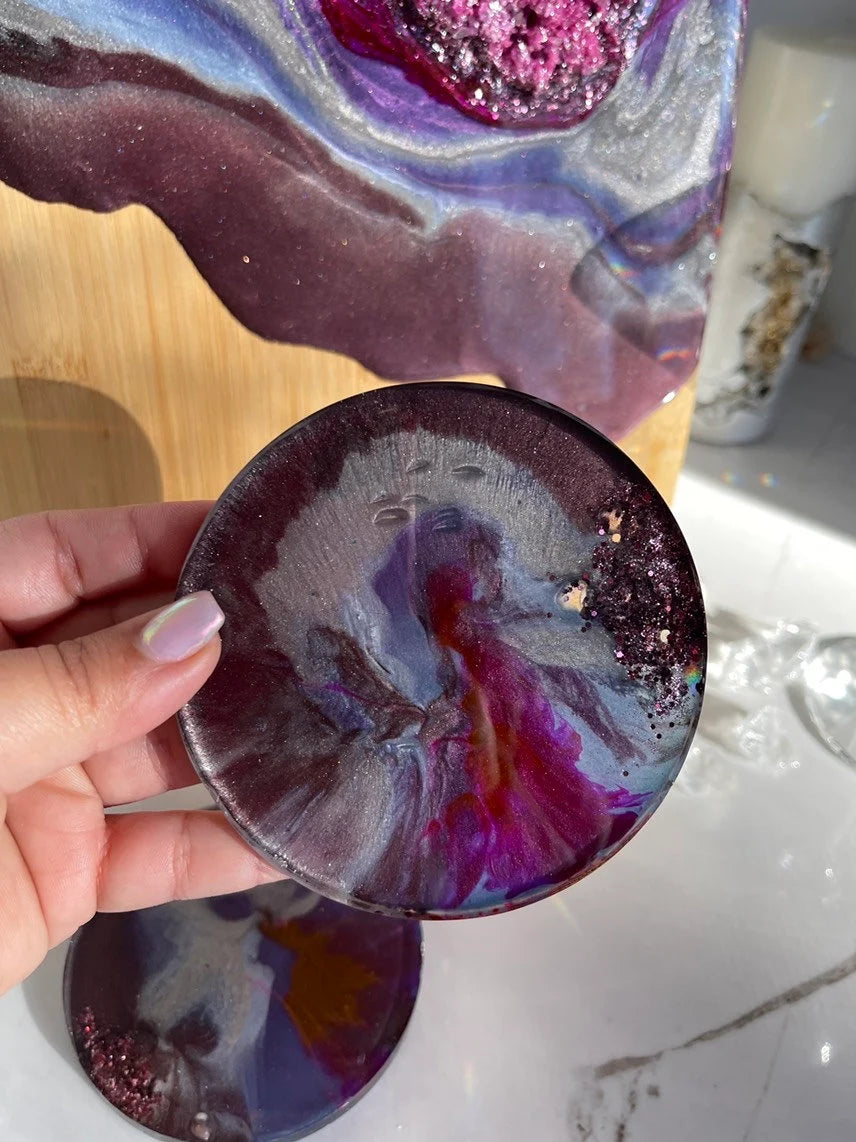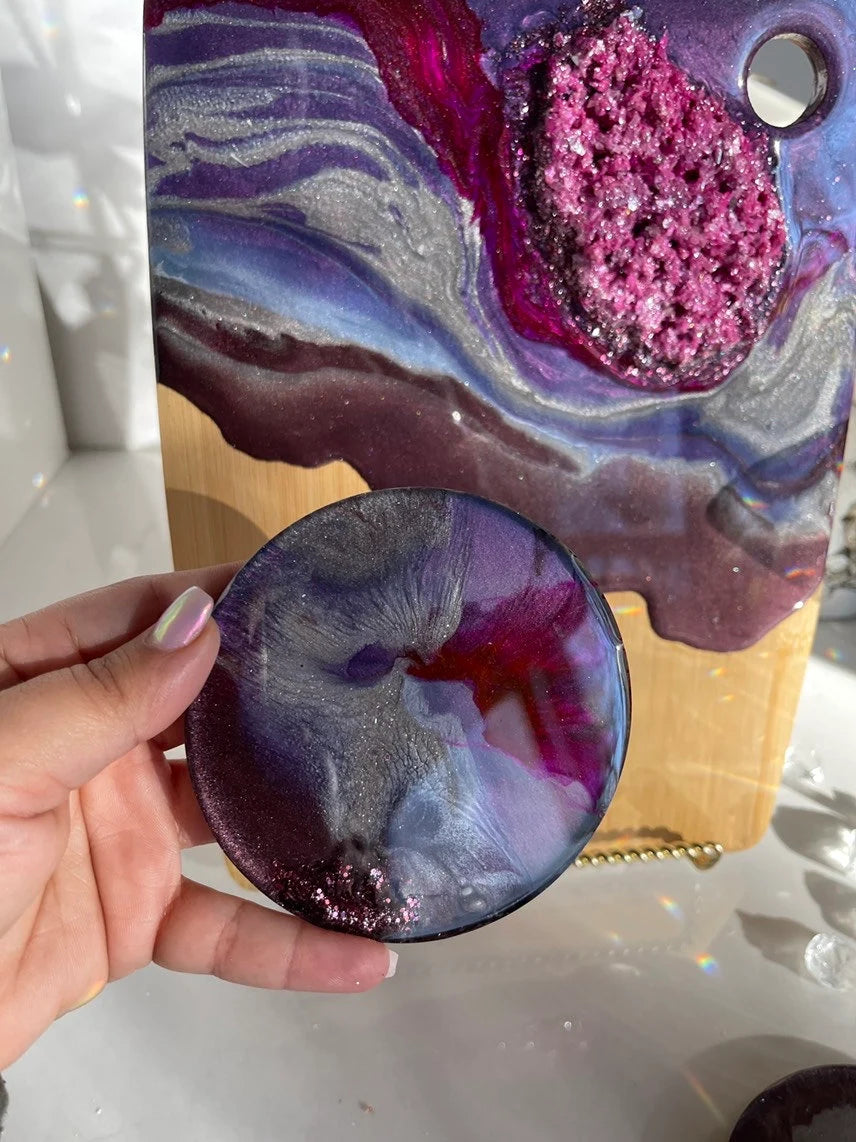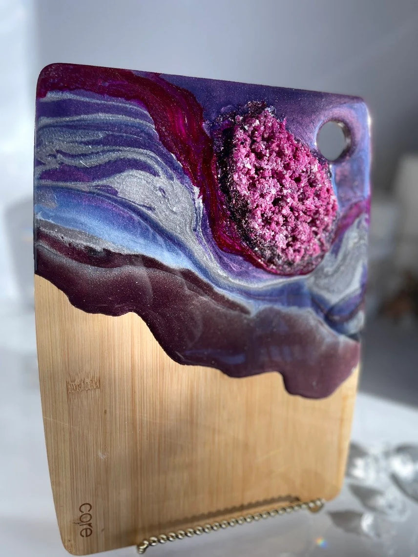 If you're looking for a one-of-a-kind cheeseboard set that will impress your guests, look no further than this Purple, Pink Geode Design Cheeseboard Set. The beautiful resin art is hand-poured in shades of purple and pink, and the stone is handmade, making this set truly unique. The set comes with two matching round coasters, making it a perfect gift for any occasion. Whether you're giving it as a wedding gift, a birthday gift, or a housewarming gift, this set is sure to please.