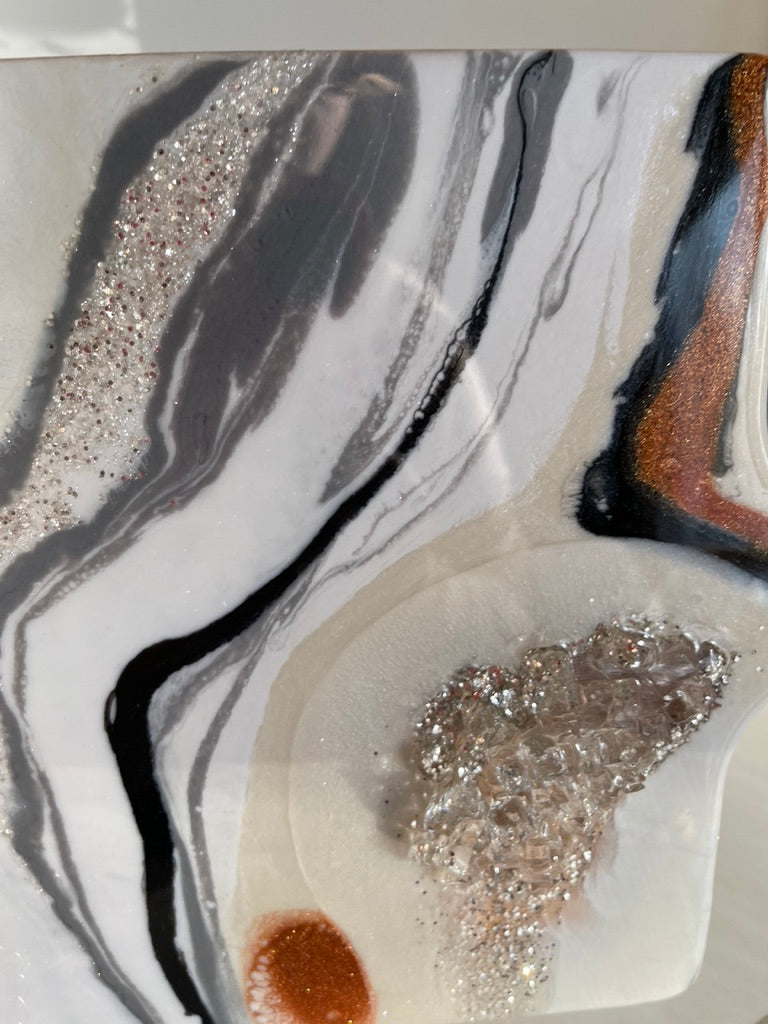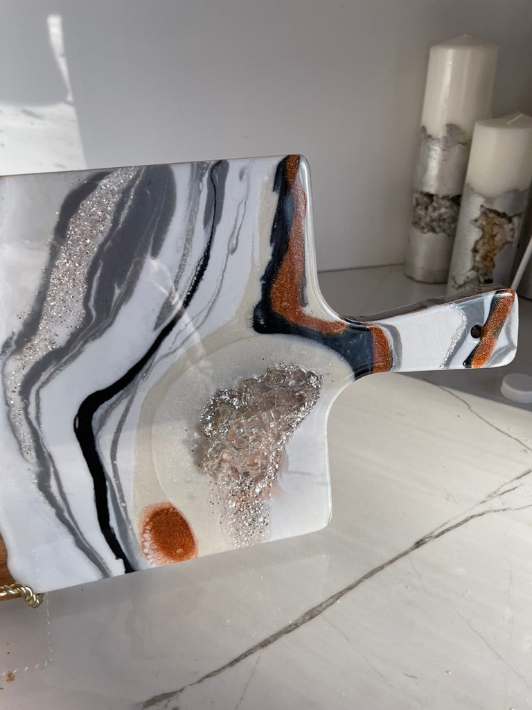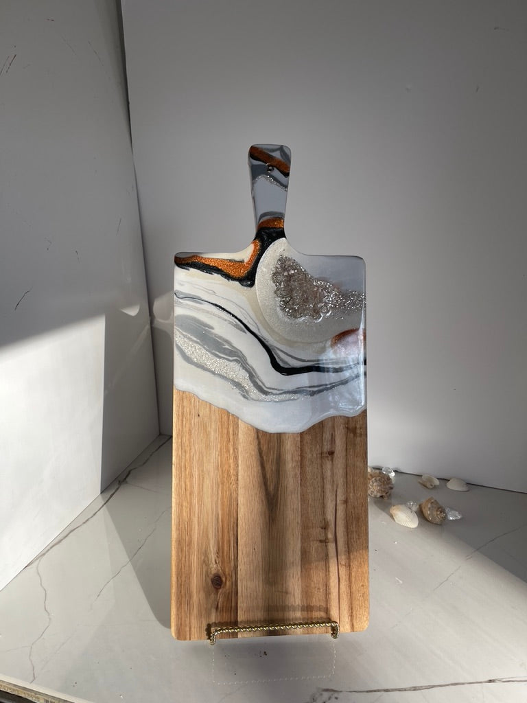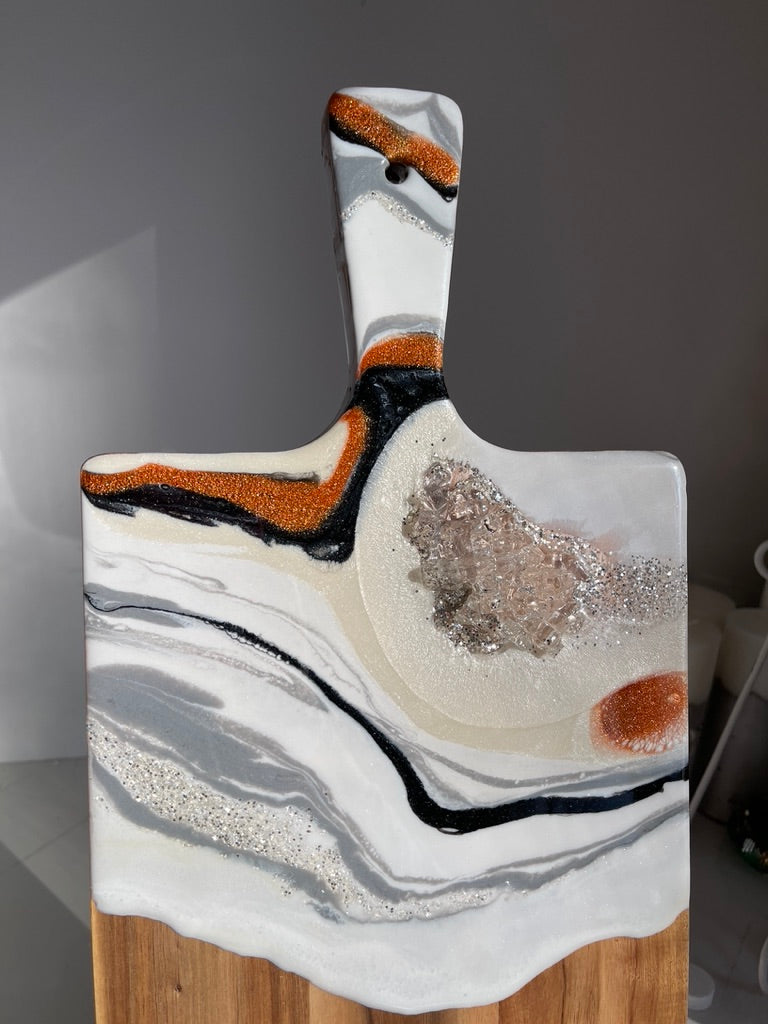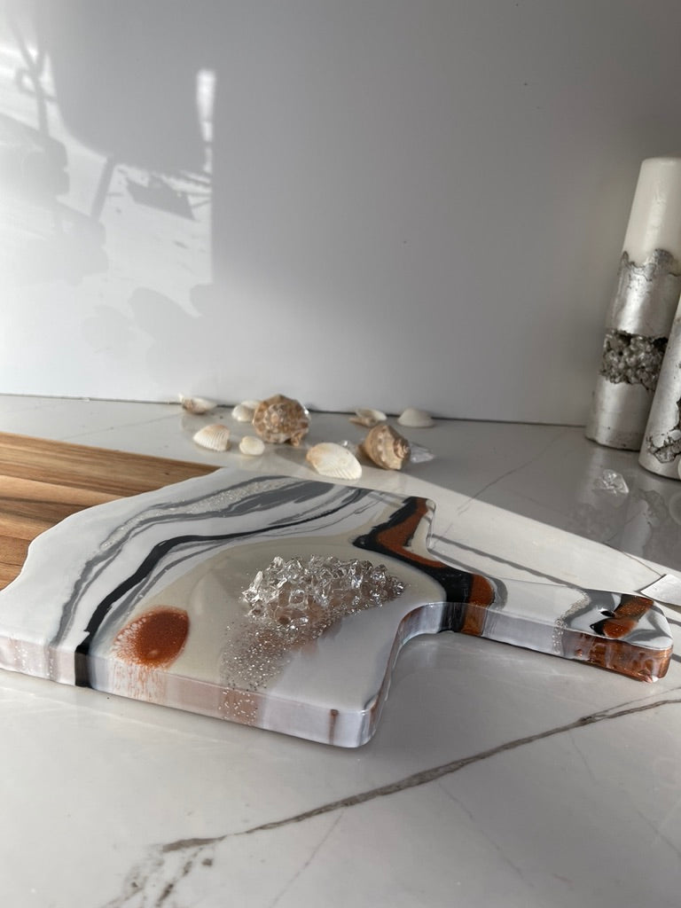 If you're looking for a one-of-a-kind cheeseboard set that will impress your guests, look no further than this white, black Geode Design Cheeseboard Set. The beautiful resin art is hand-poured in shades of Burnt glitter orange, marshmallow white, & gray The stone is handmade, making this set truly unique. Whether you're giving it as a wedding gift, a birthday gift, or a housewarming gift, this set is sure to please.