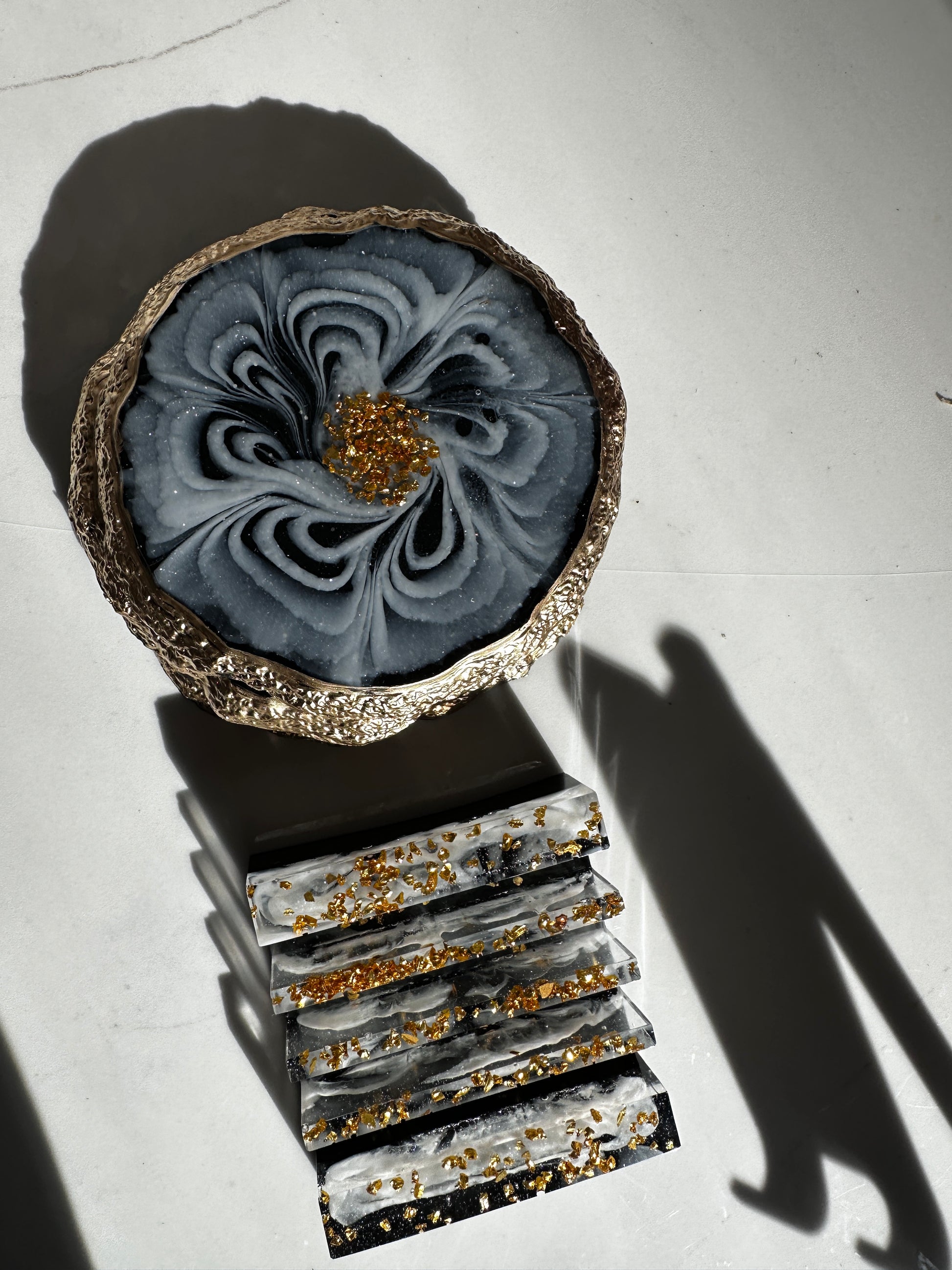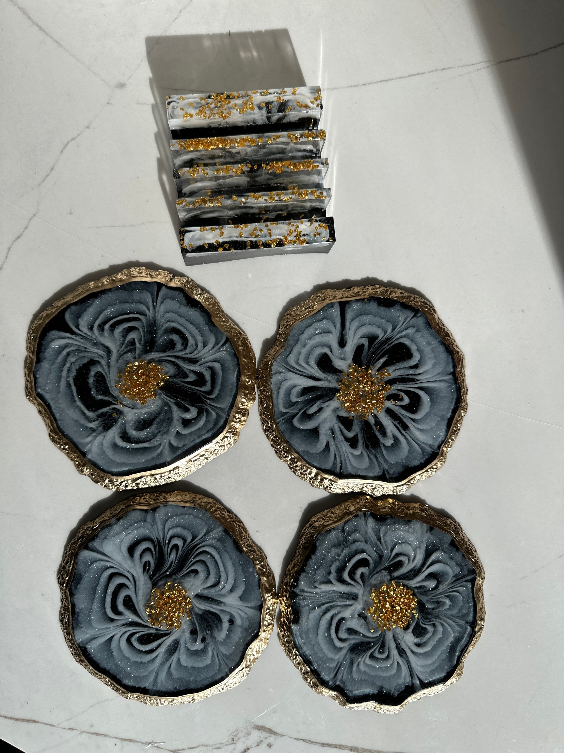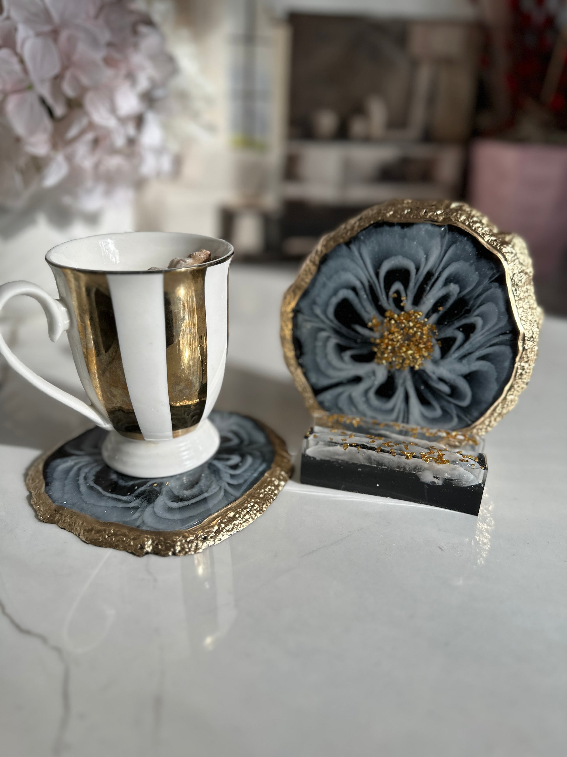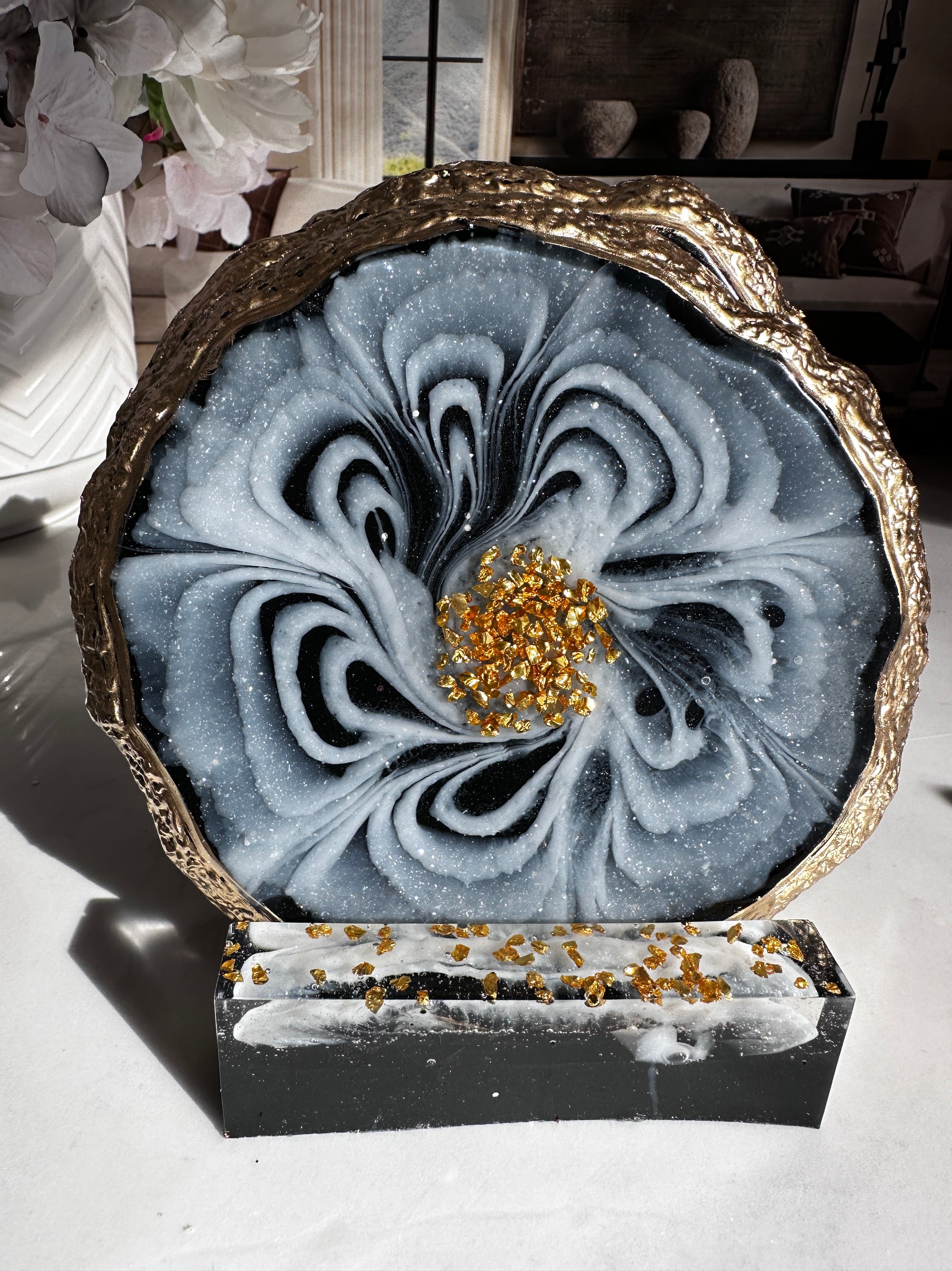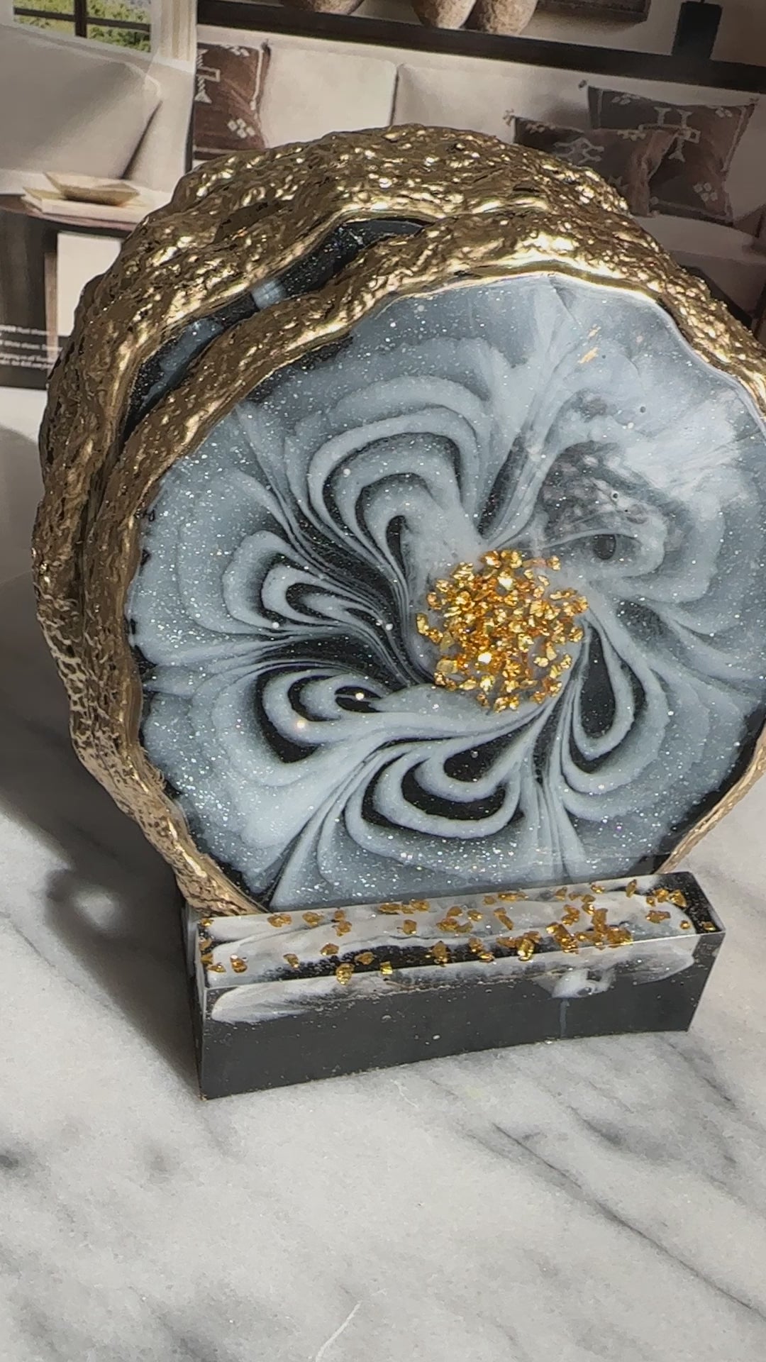 Add a touch of elegance to your home with these beautiful resin coasters. The geode shape is unique, and the gold crushed glass in the center of the flower gives them a luxurious look. Black, gold, and white are elegant colors that complement any decor. These coasters are also functional; they protect your furniture from water rings or scratches. This set of coasters also includes a holder to store them when not in use.