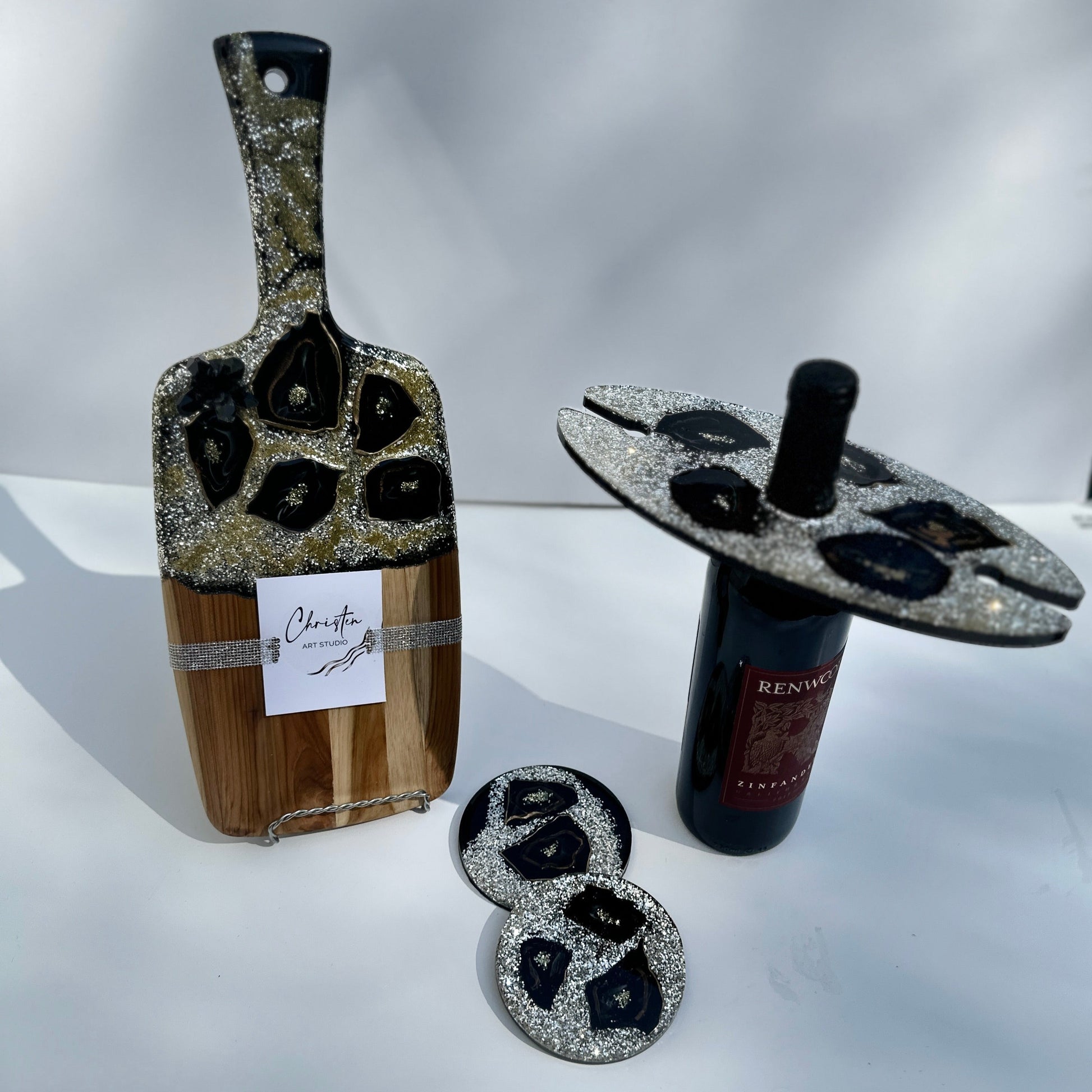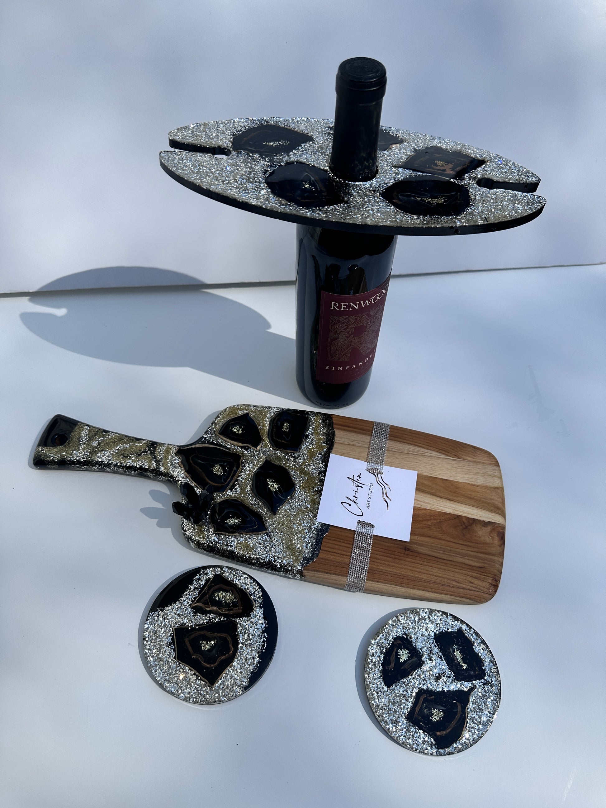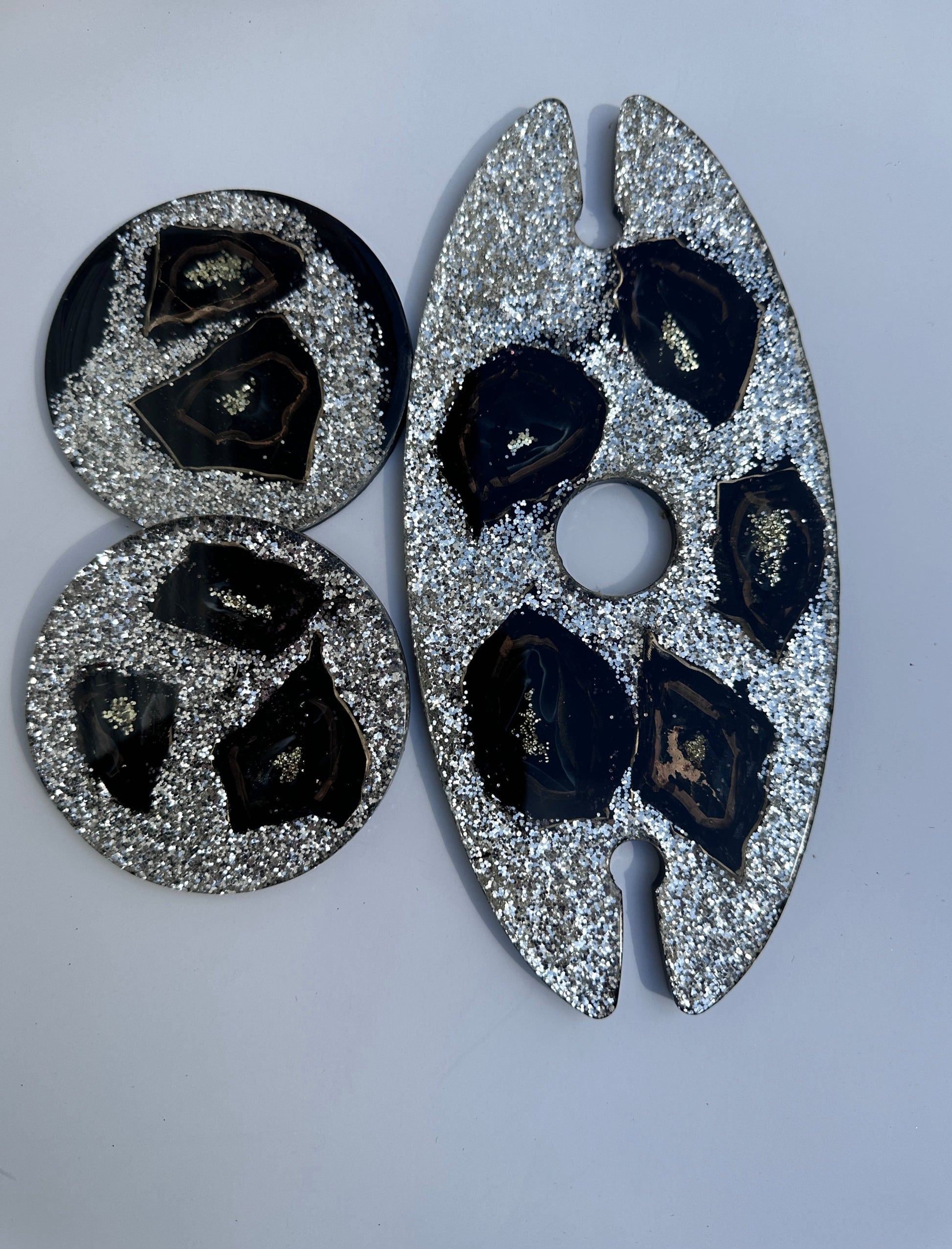 #GeodeWineGlassEleganceSet #HandmadeBoardSet #GeodeDesign #BlackCrystals #EpoxyResin #HomeDecor #NatureInspired #UniqueGiftIdea #ElegantServingBoard #LuxuriousEntertaining #MatchingCoasters #WineGlassHolders
