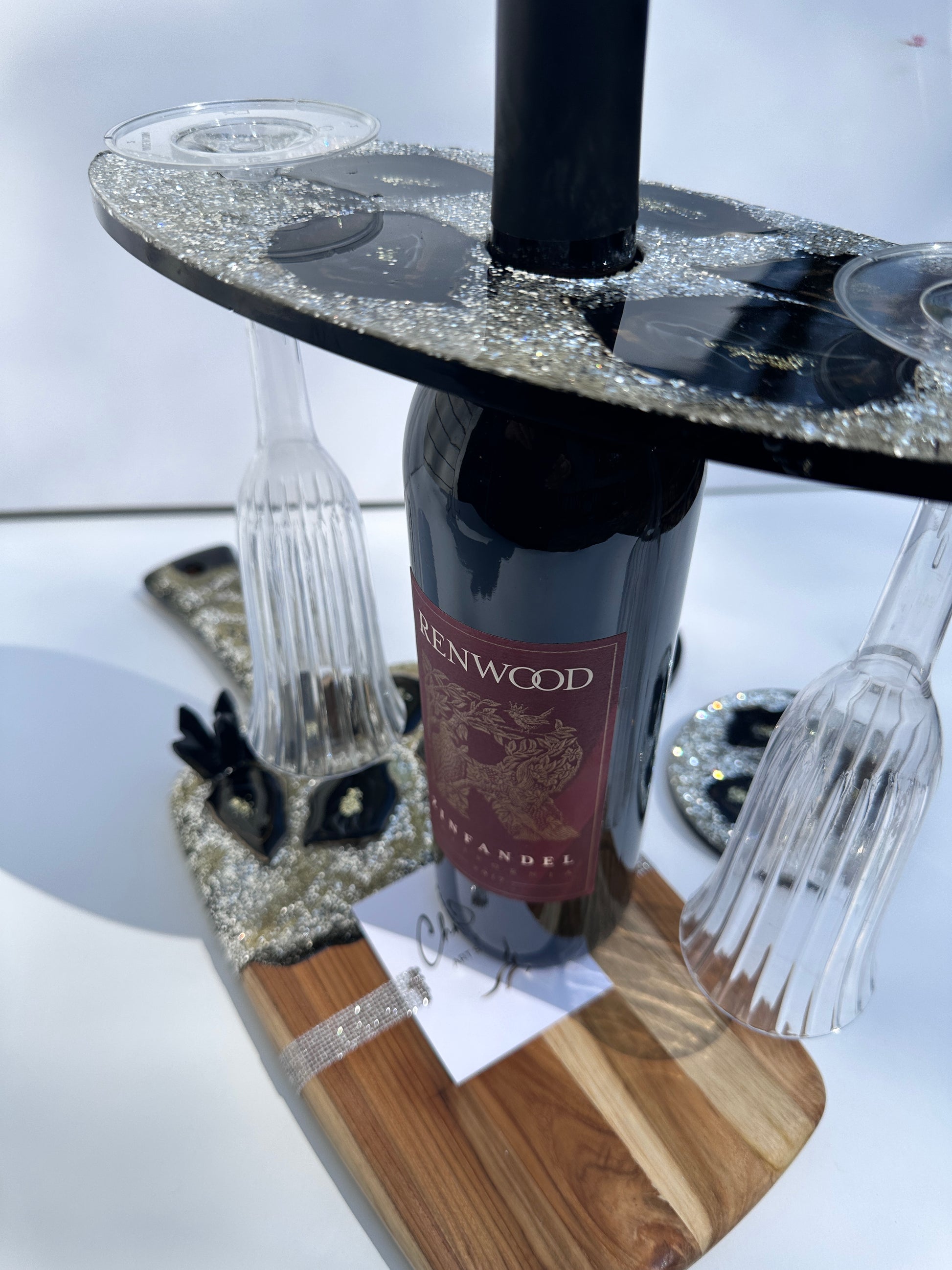 Presenting the exquisite Geode Wine Glass Elegance Set, meticulously handcrafted from epoxy resin, black crystals, and a wooden board. This elegant and unique set adds a touch of nature-inspired glamour to your entertaining experience.