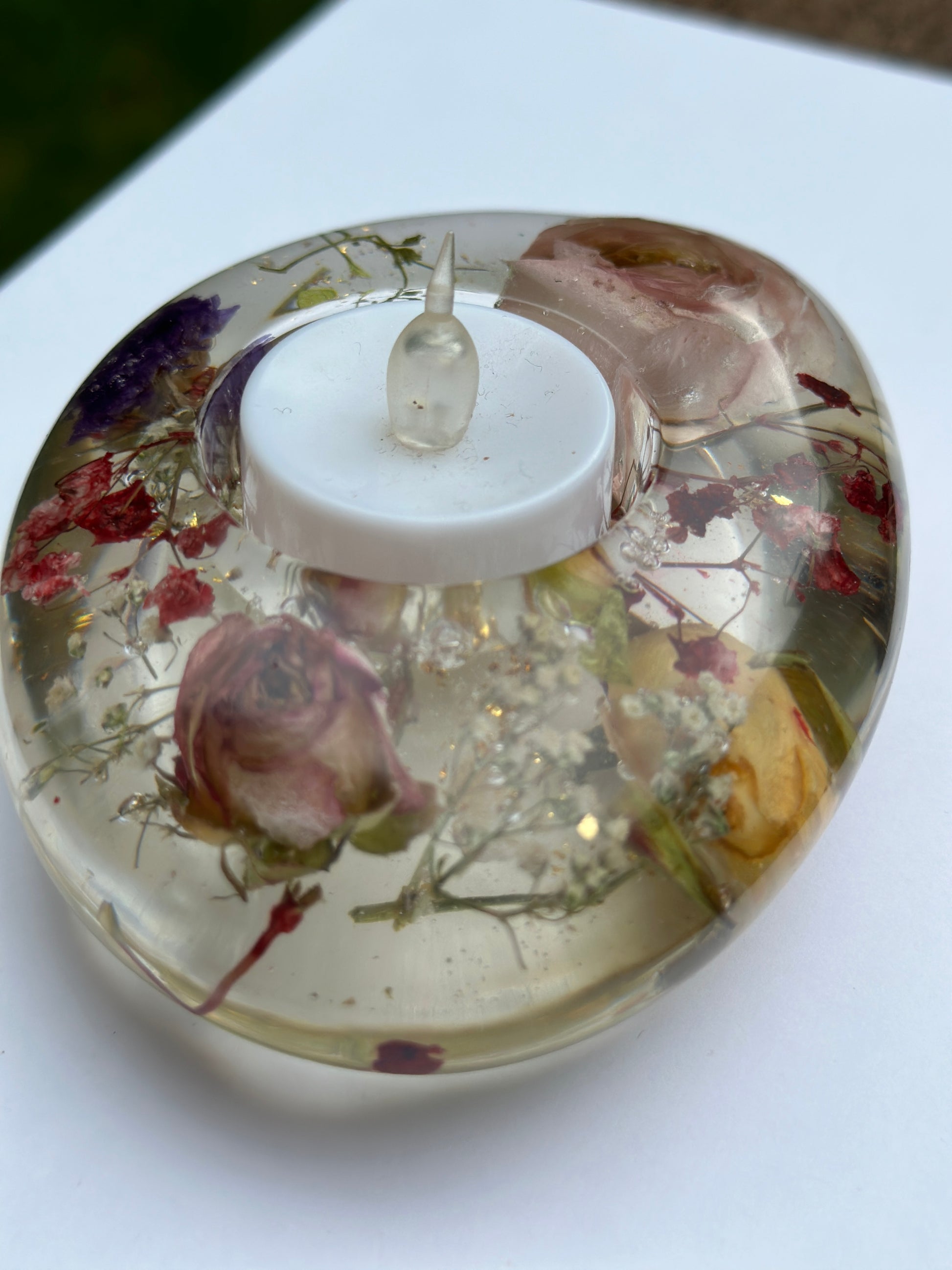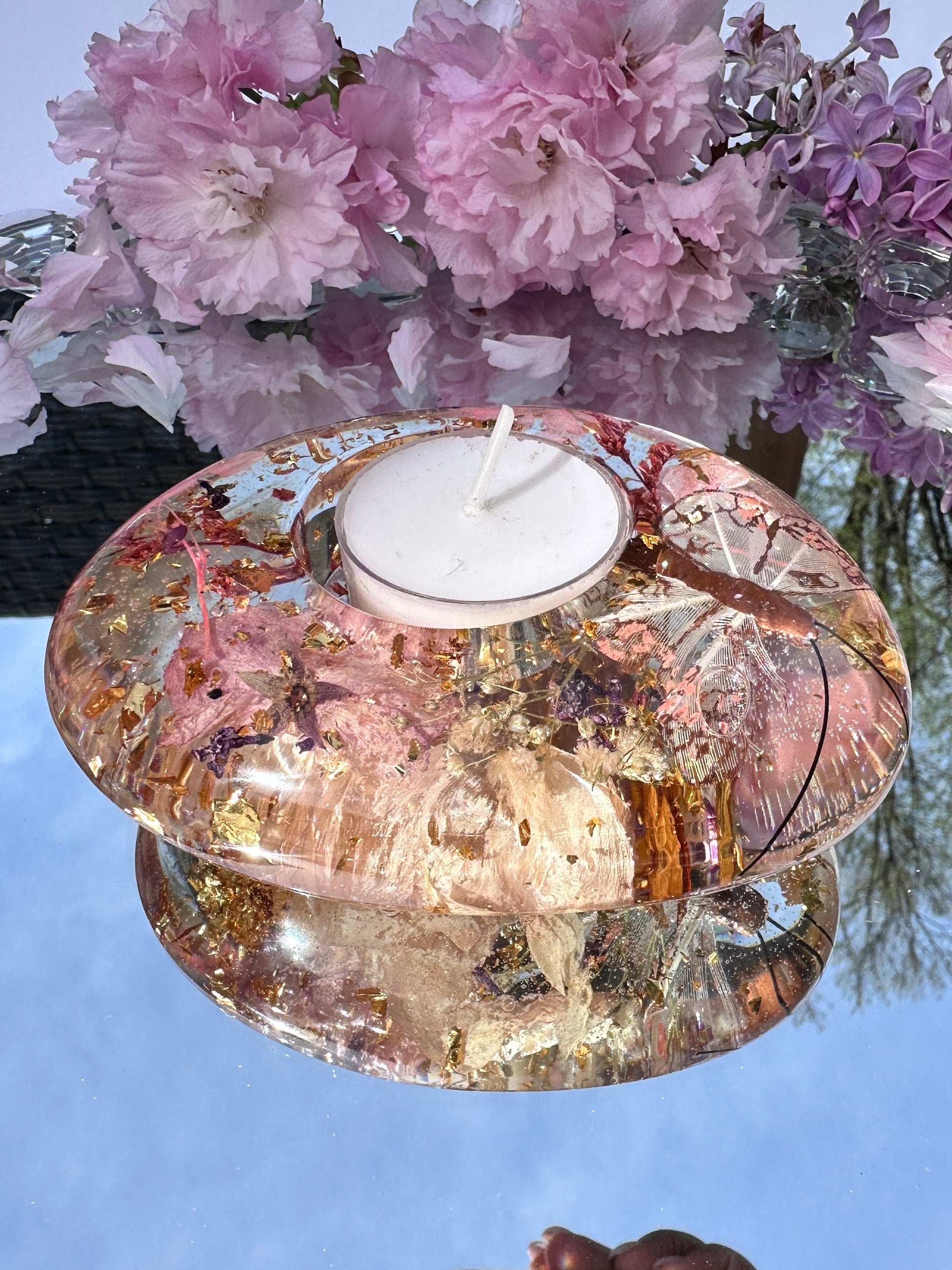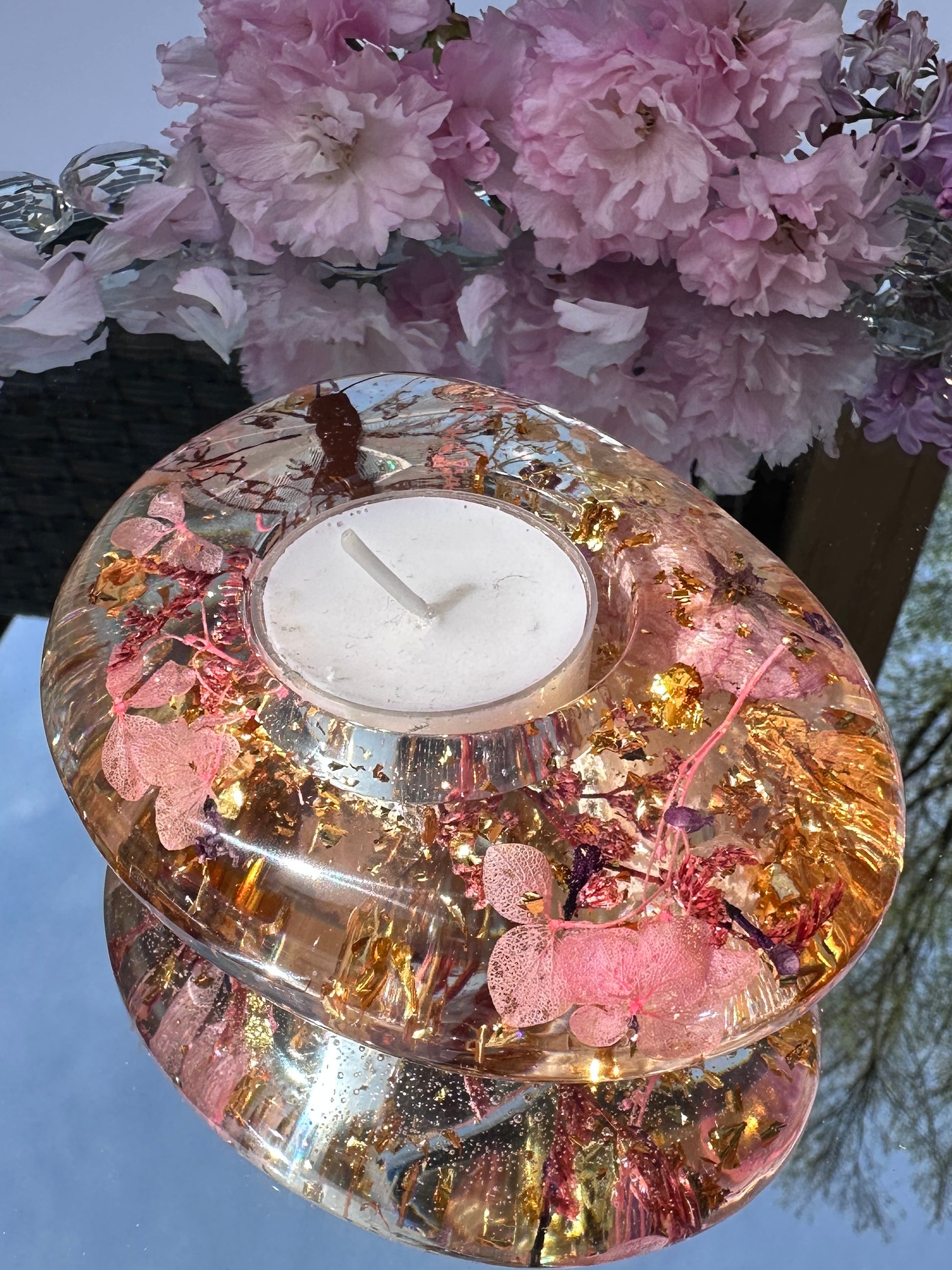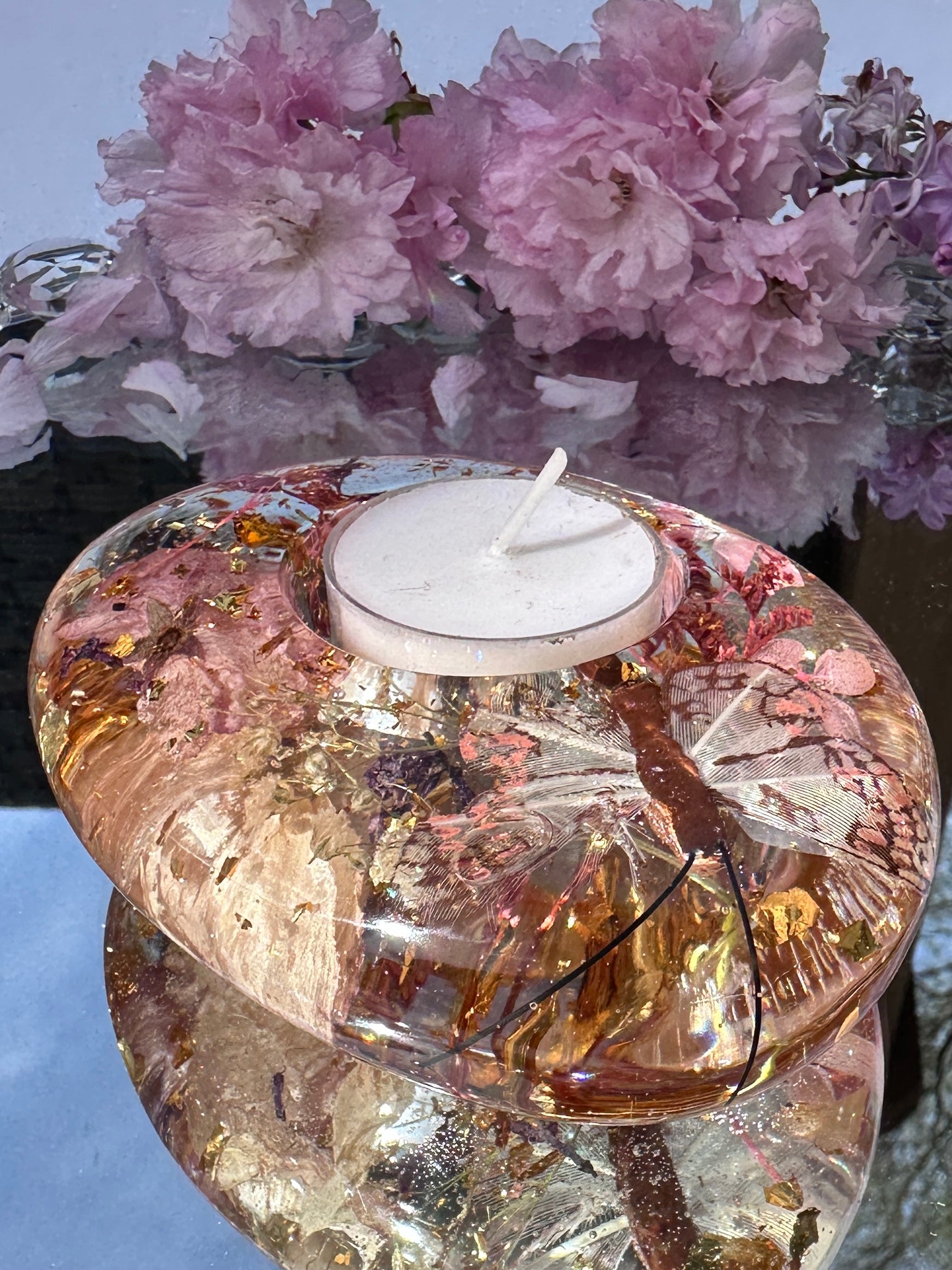 #FlowerTeaLightHolder #HandmadeCandleHolder #DryFlowerDesign #GoldFlakes #EpoxyResin #HeatResistant #HomeDecor #NatureInspired #UniqueGiftIdea