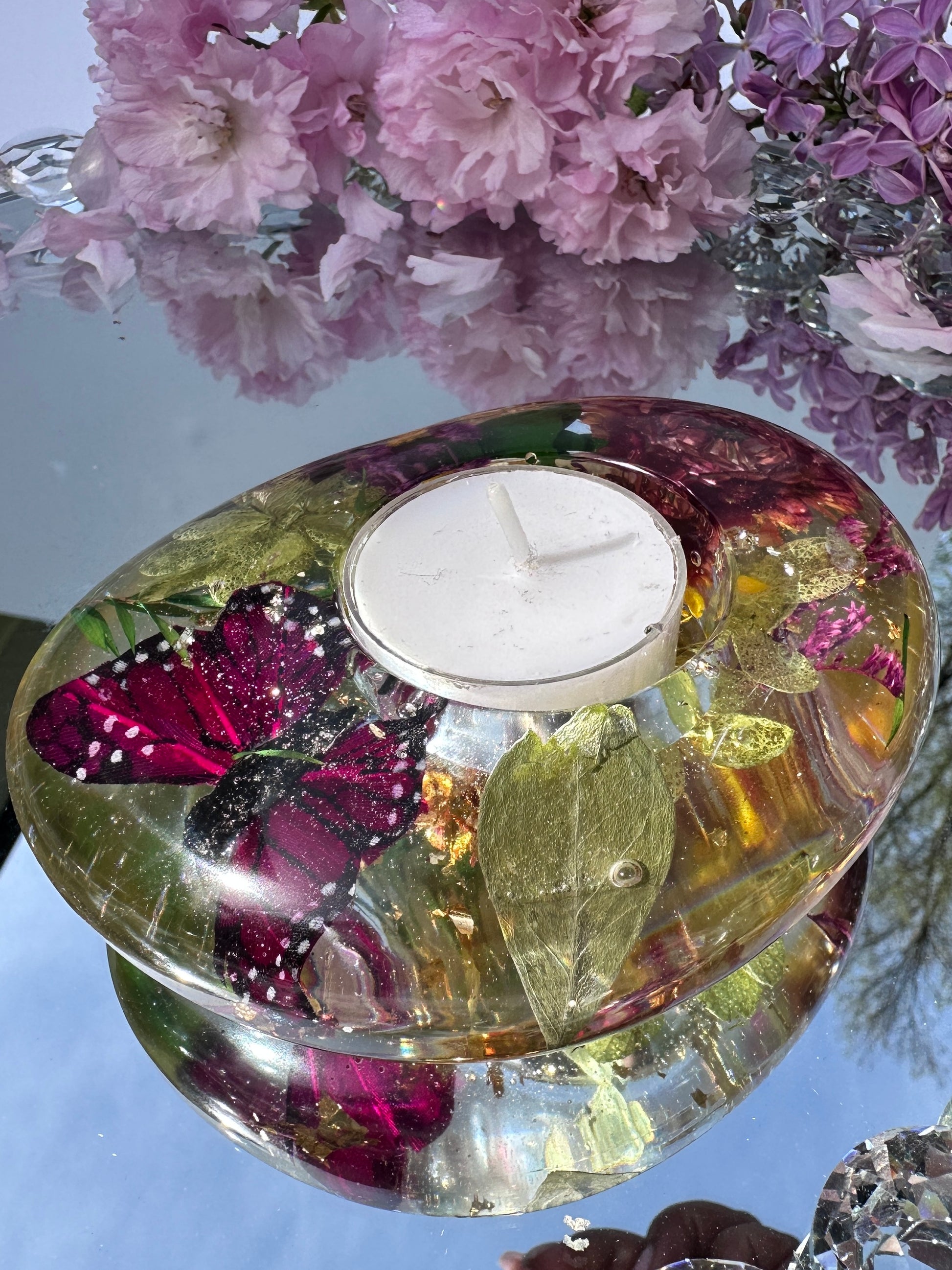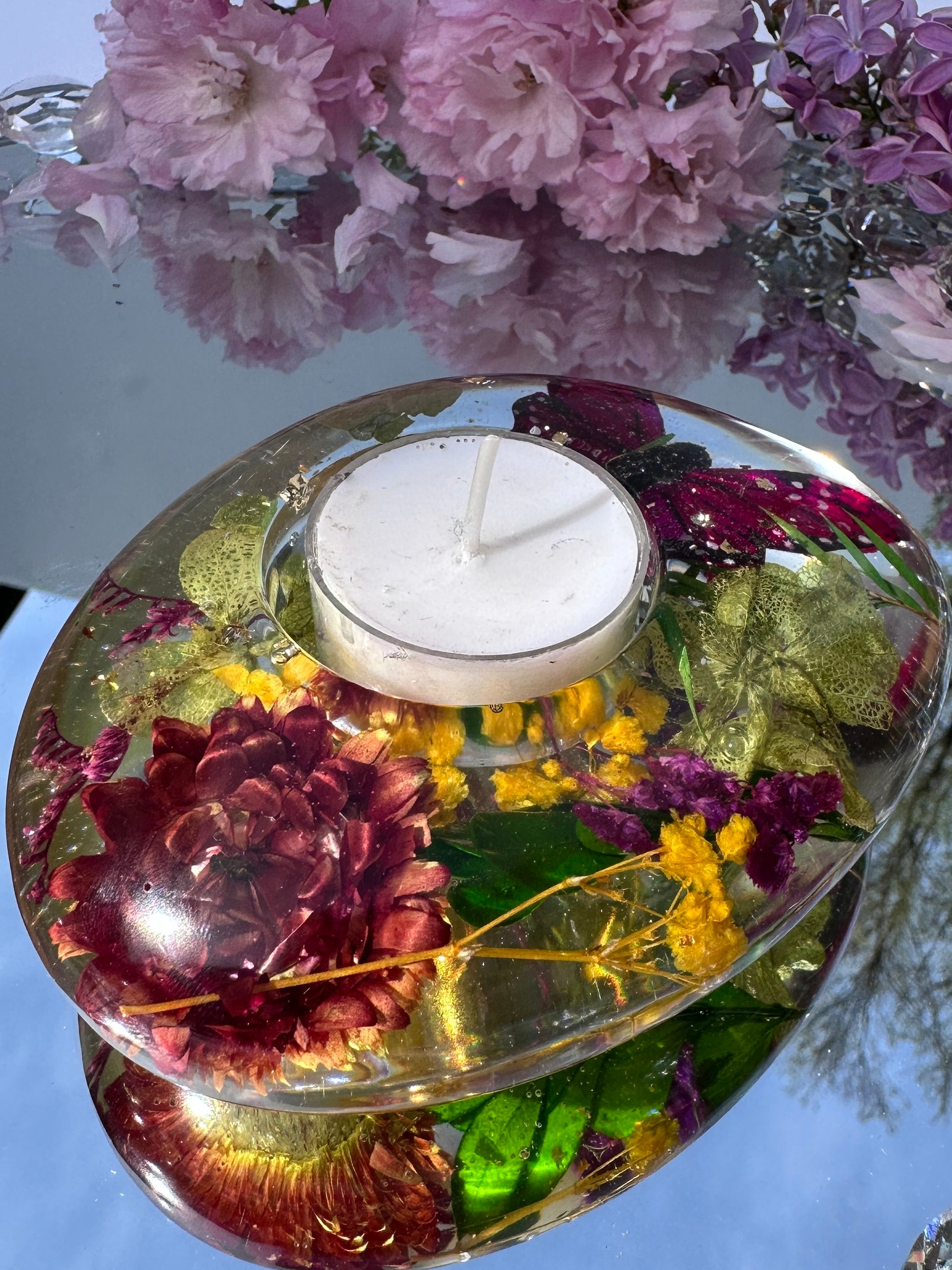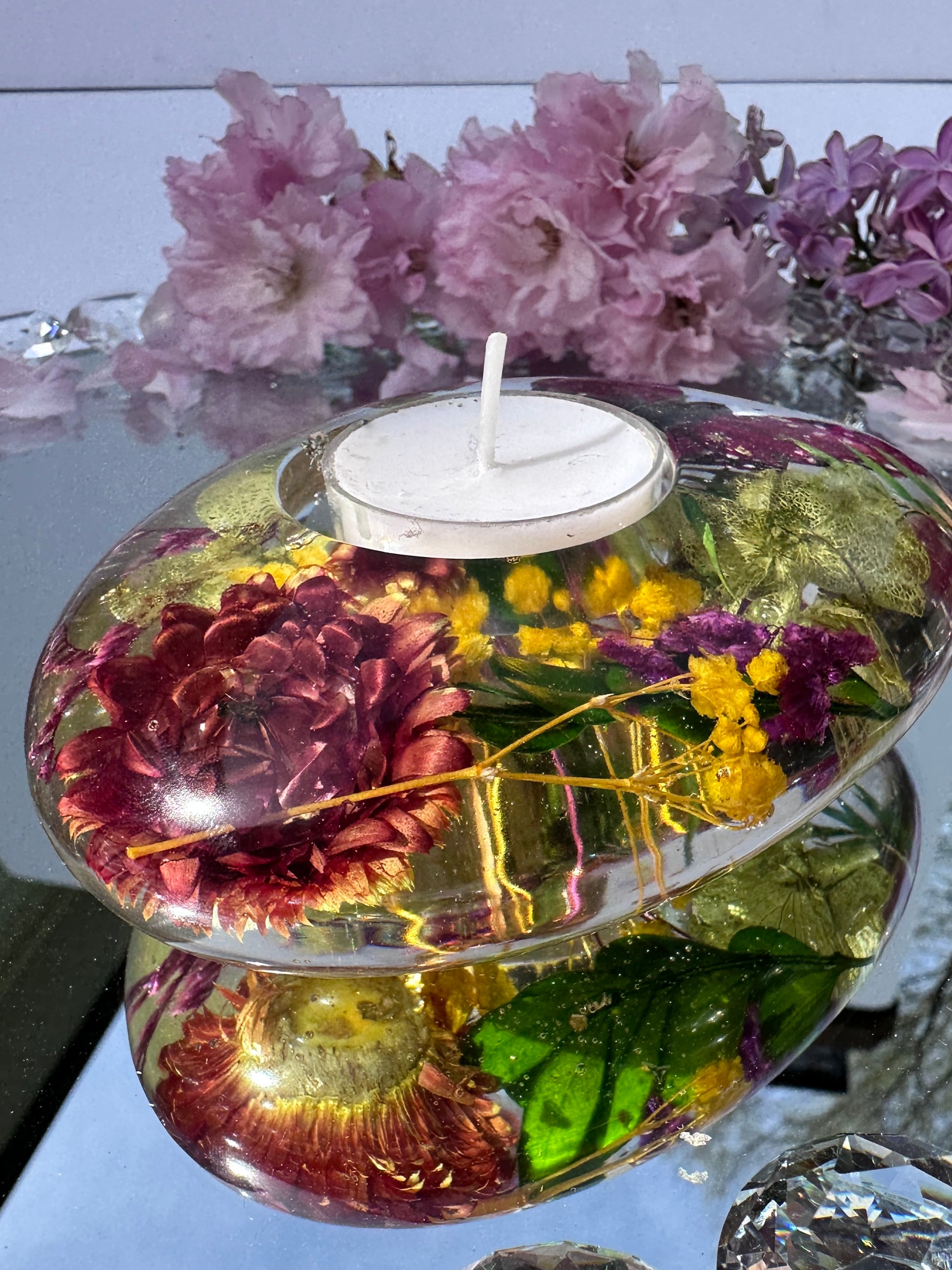 Illuminate your space with the enchanting Blossoming Glow Tea Light Candle Holder, handcrafted with epoxy resin, real dry flowers, and gold flakes. This 4.4-inch diameter and 1.4-inch tall round candle holder showcases a colorful, unique flower design, adding a touch of nature-inspired beauty to any room.