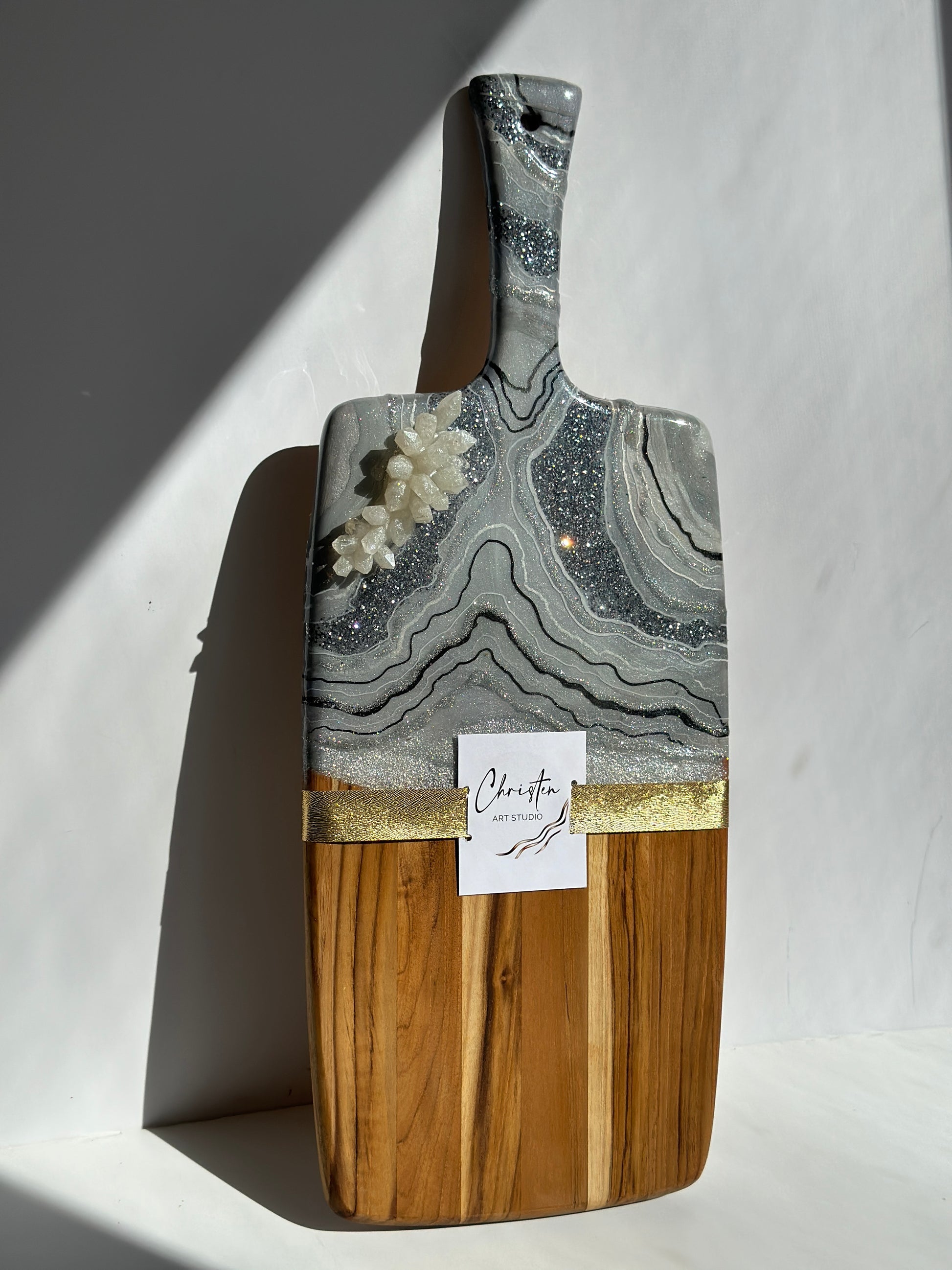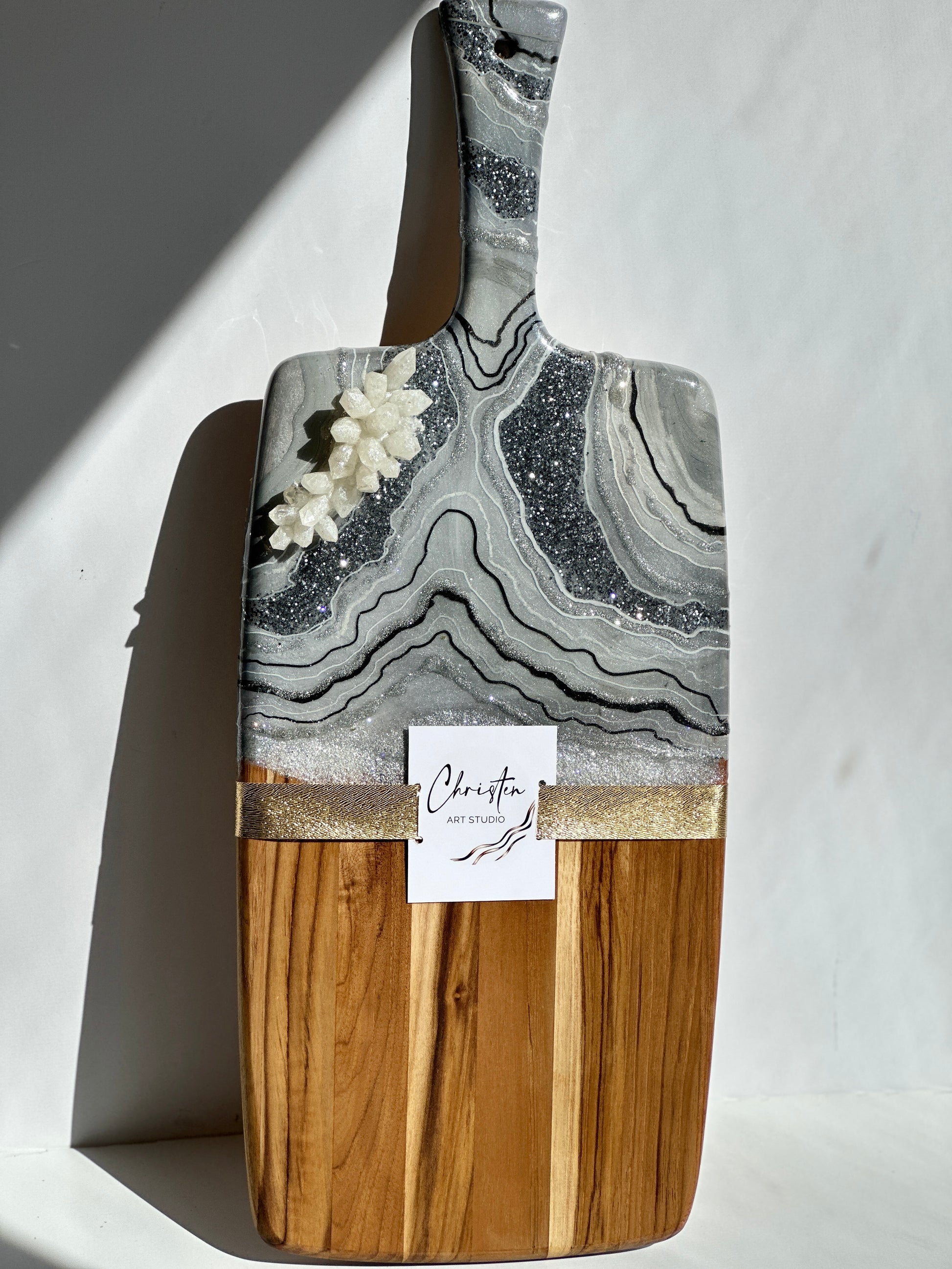 Introducing the Gray Geode Pearl Elegance Cheese Board, expertly handcrafted from epoxy resin, white pearl-colored crystals, and a wooden board. This elegant and unique board adds a touch of nature-inspired glamour to your entertaining experience.