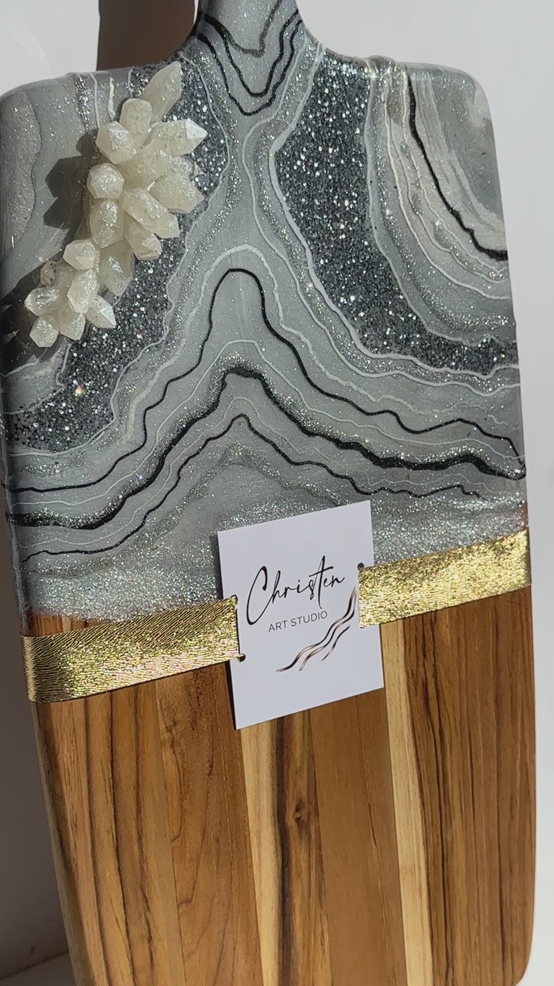 #GrayGeodePearlEleganceCheeseBoard #HandmadeBoard #GeodeDesign #WhitePearlCrystals #EpoxyResin #HomeDecor #NatureInspired #UniqueGiftIdea #ElegantServingBoard #LuxuriousEntertaining #CharcuterieBoard