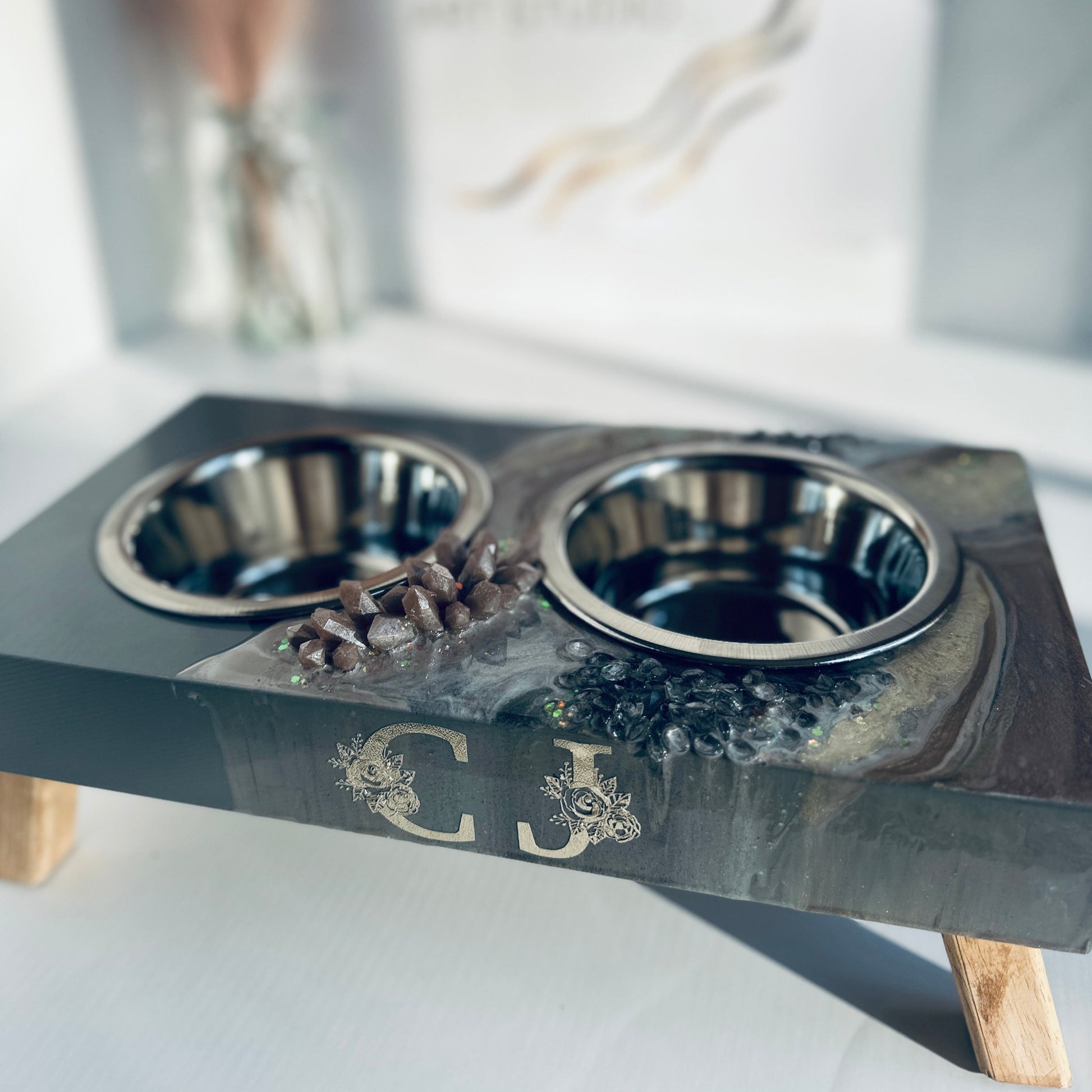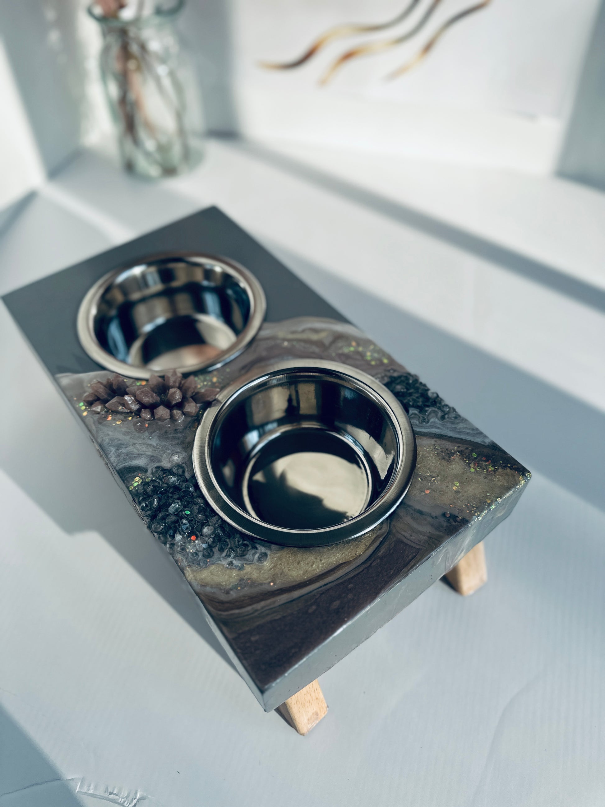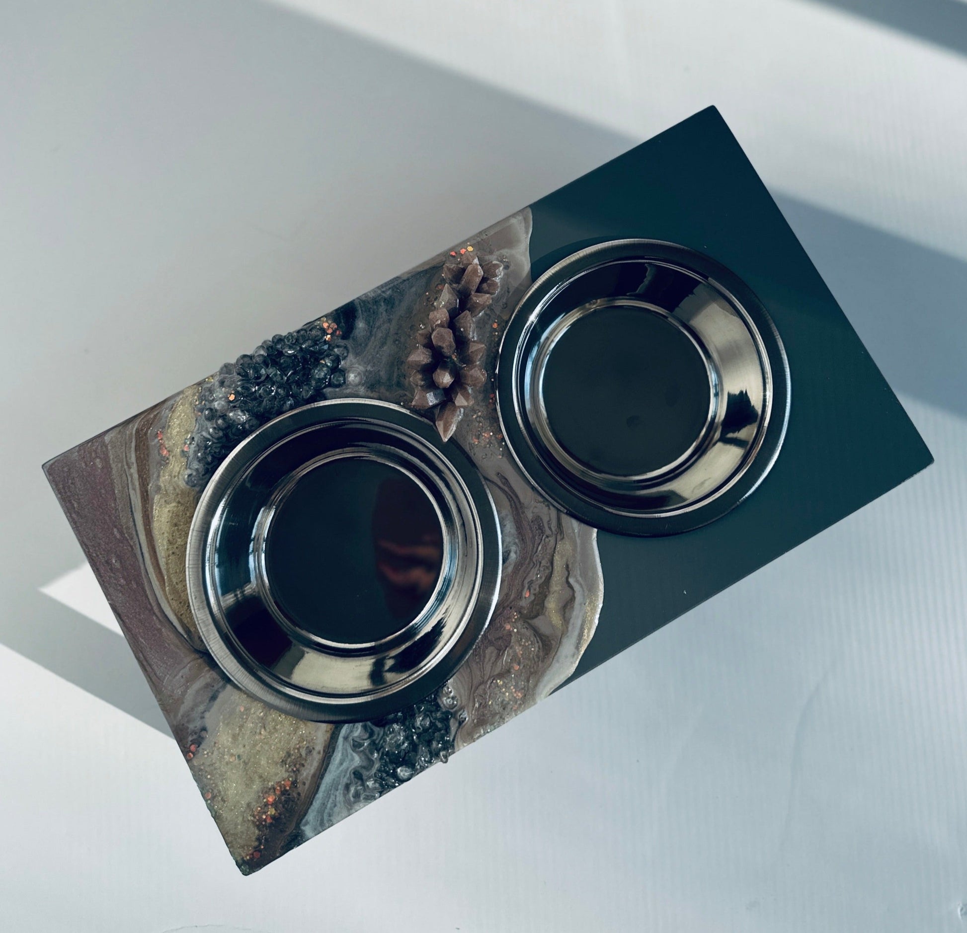 Looking for a unique pet feeder that is also high-quality and functional? Look no further than this handmade wooden pet feeder! Made with beautiful craftsmanship, this feeder is perfect for displaying your pet's food in a stylish way. The hand-poured resin design is food-safe and looks great, while the stainless steel bowl is durable and easy to clean.