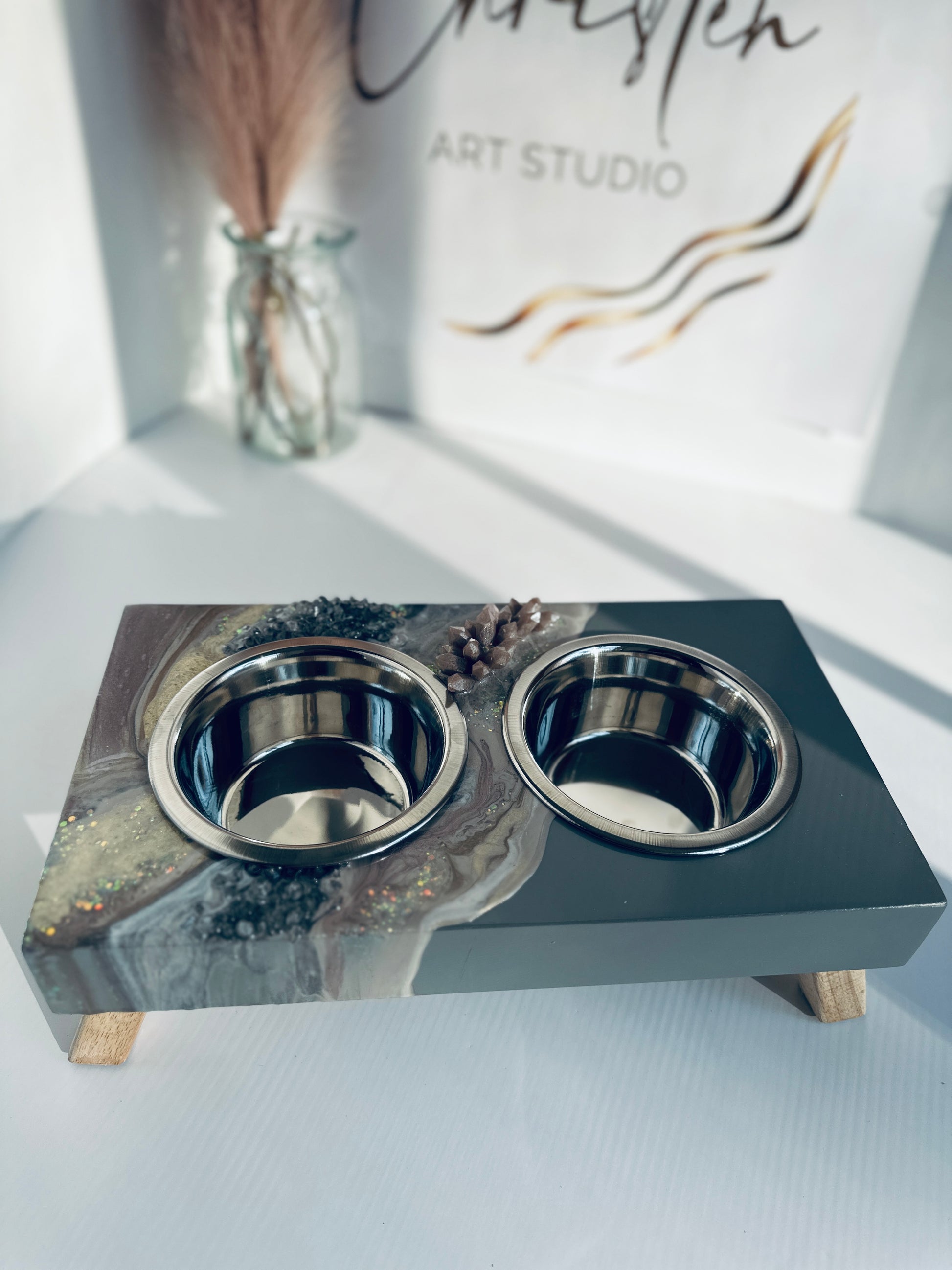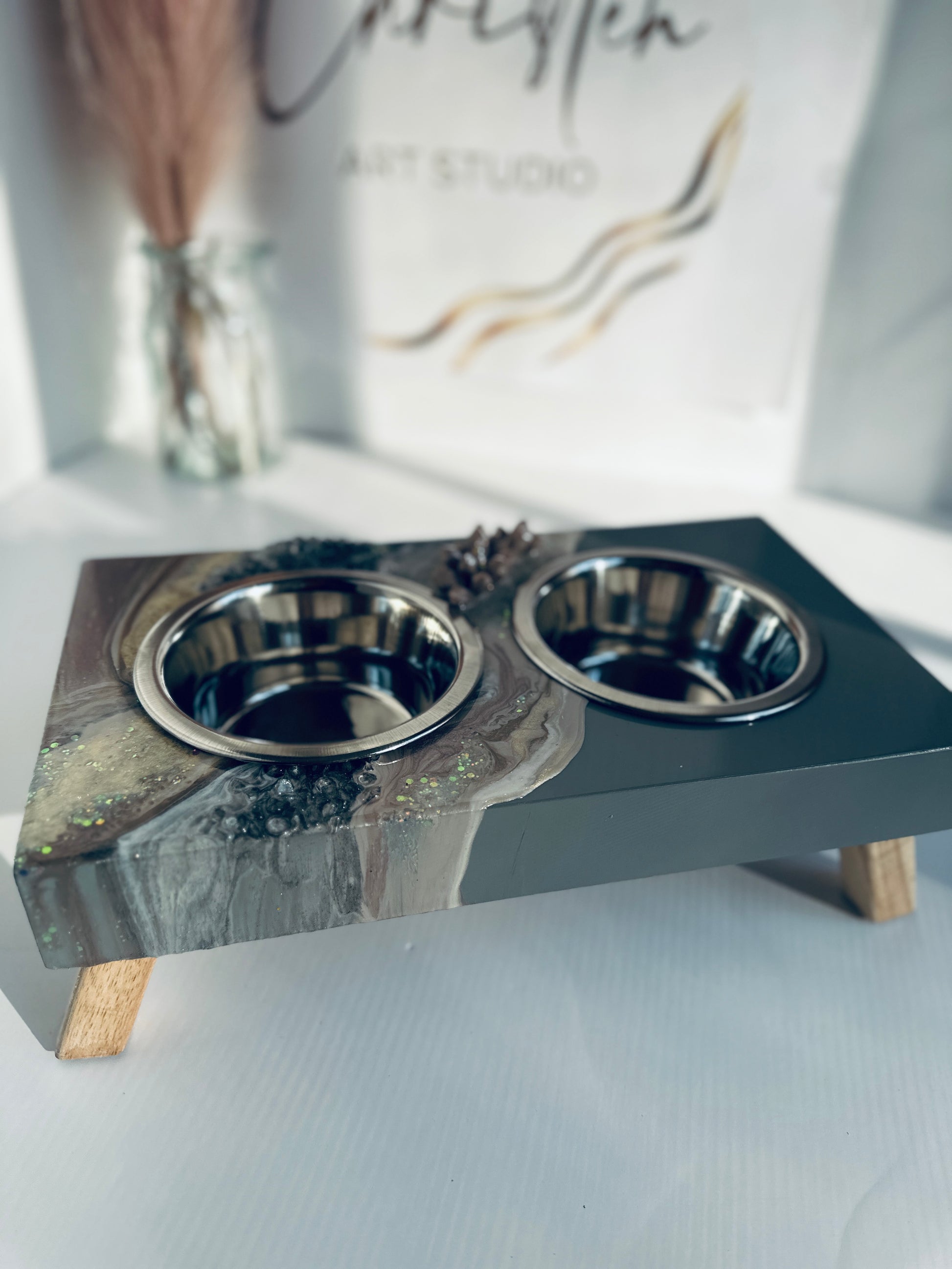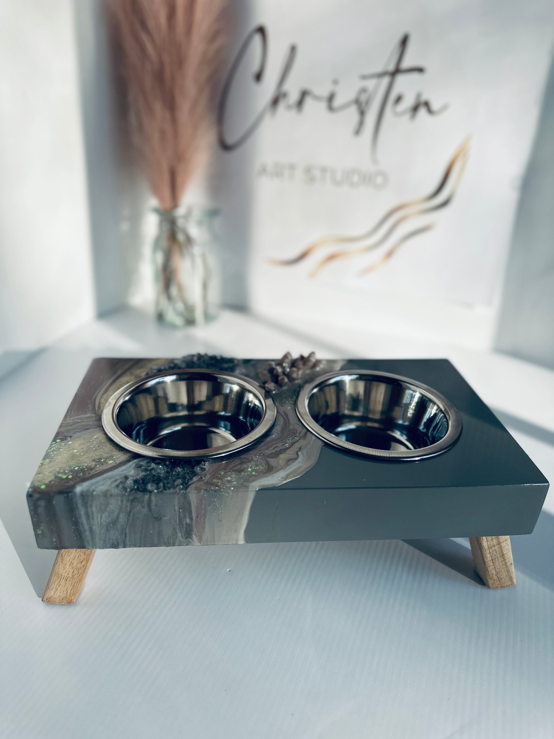 Looking for a unique pet feeder that is also high-quality and functional? Look no further than this handmade wooden pet feeder! Made with beautiful craftsmanship, this feeder is perfect for displaying your pet's food in a stylish way. The hand-poured resin design is food-safe and looks great, while the stainless steel bowl is durable and easy to clean.