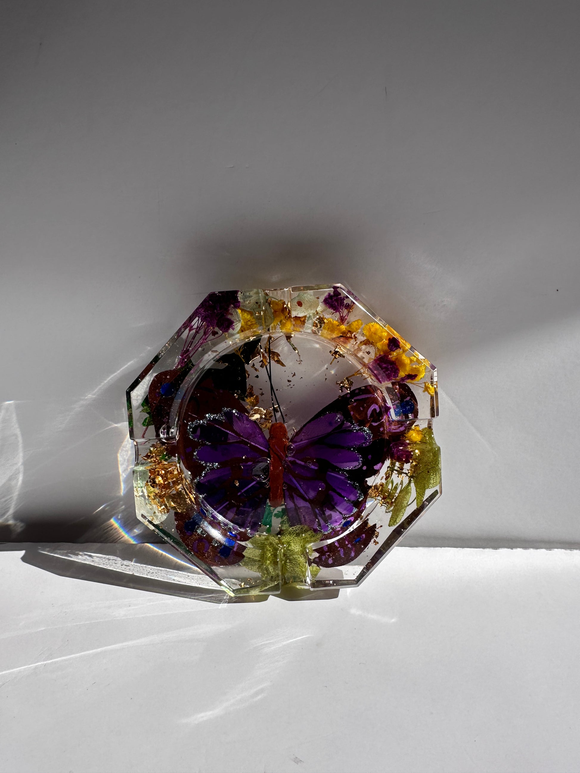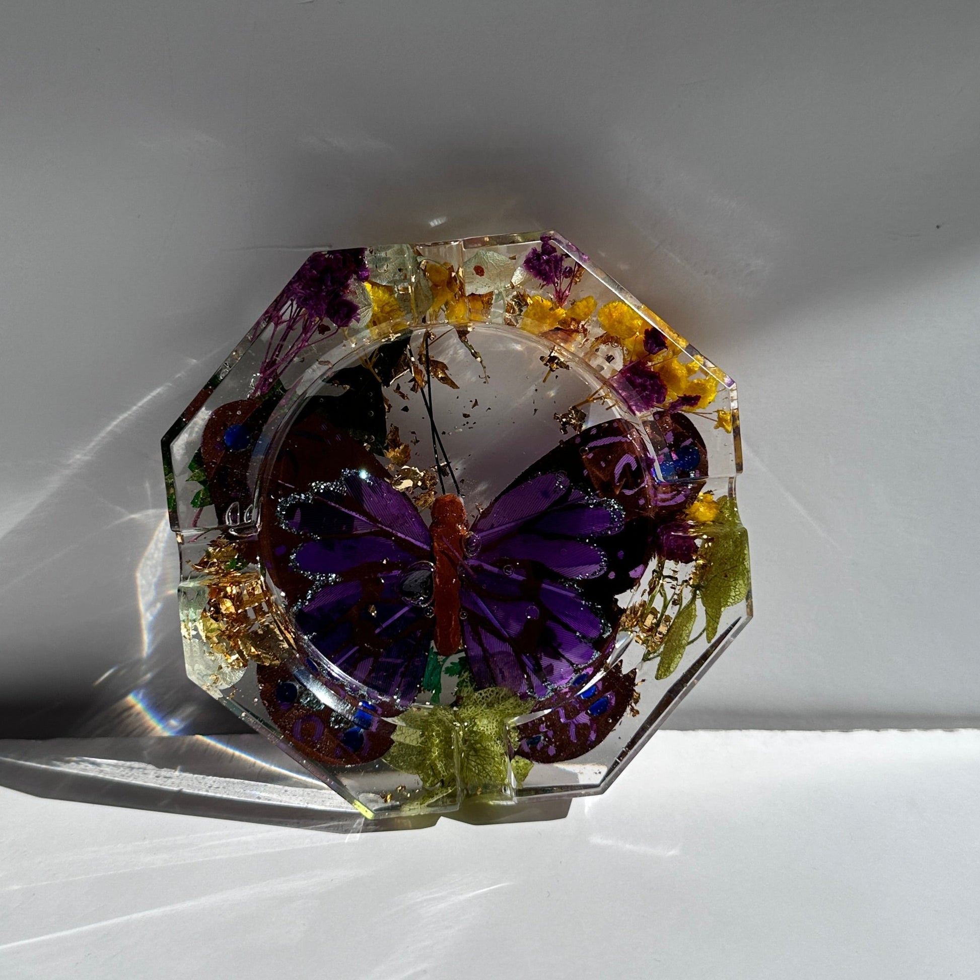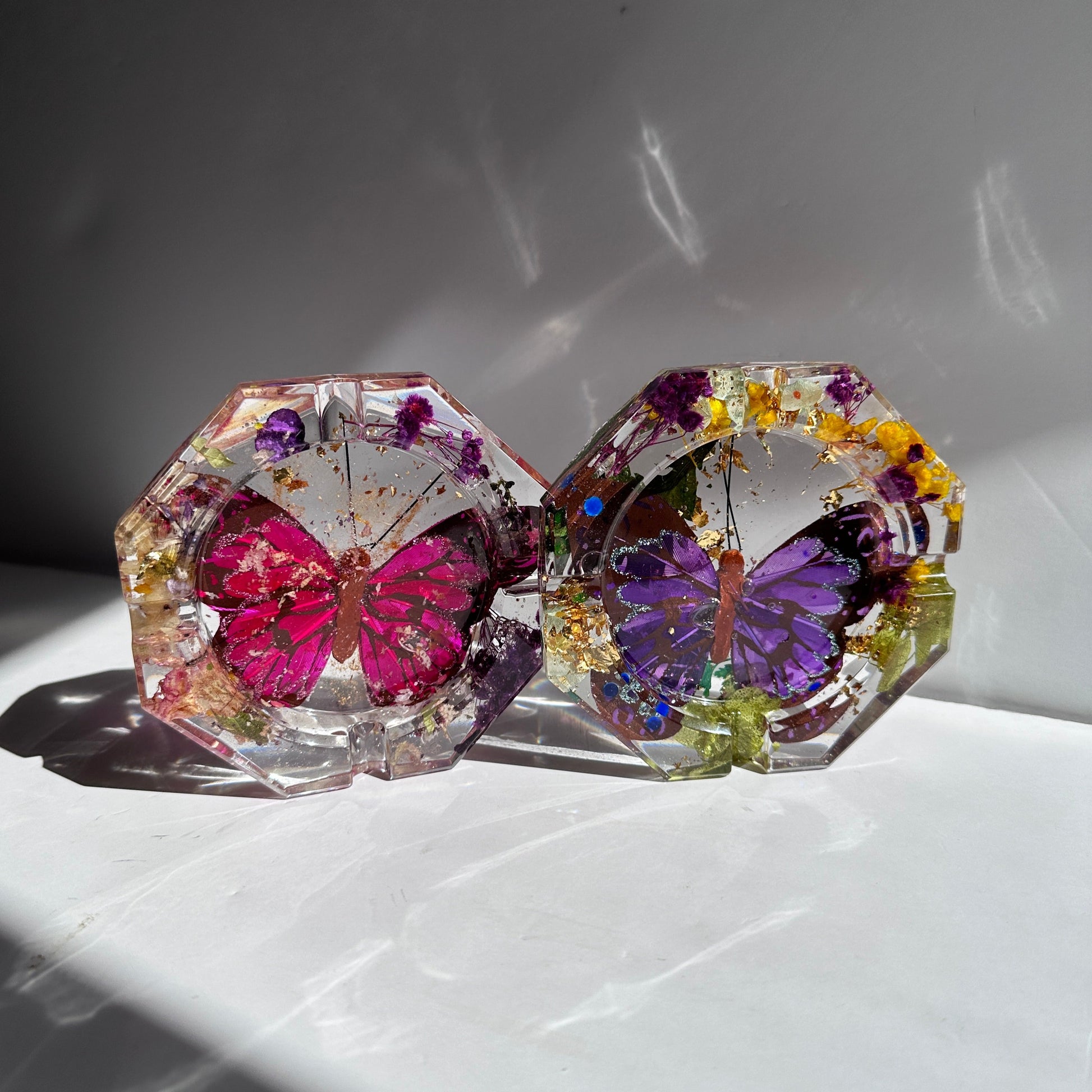 #FloralButterflyAshtray #HandmadeAshtray #DryFlowerDesign #GoldFlakes #EpoxyResin #HeatResistant #HomeDecor #NatureInspired #UniqueGiftIdea #ColorfulAshtray