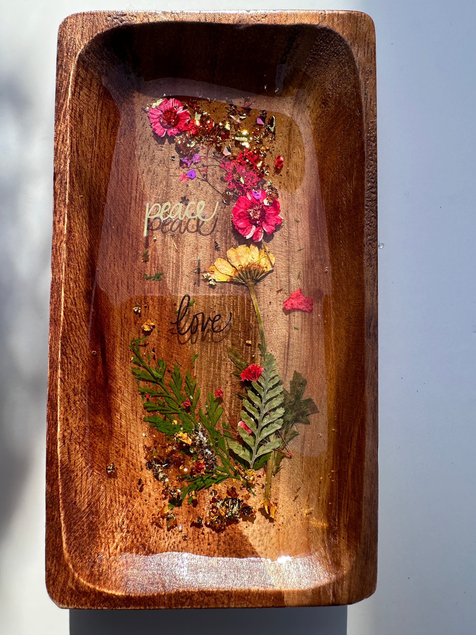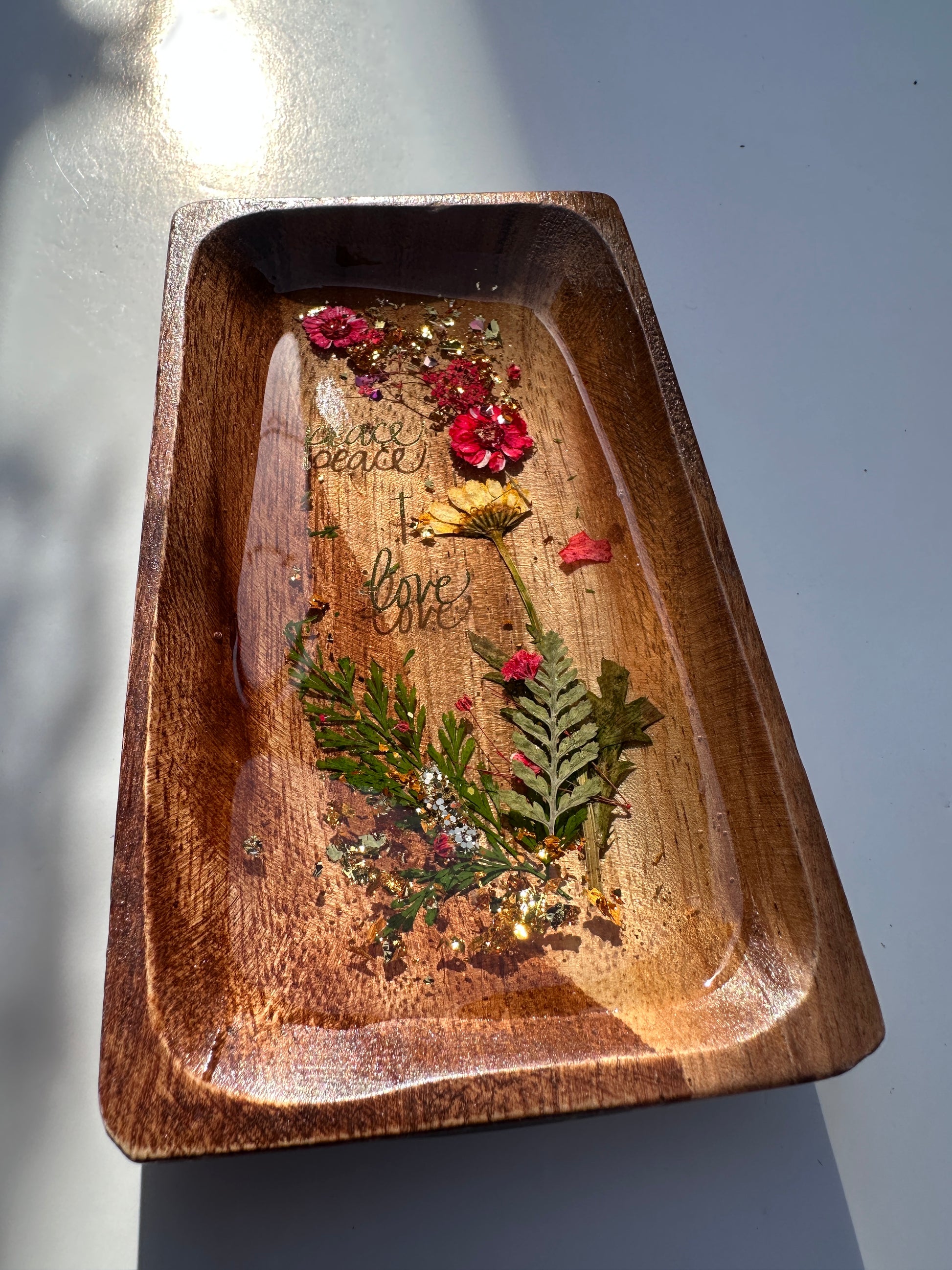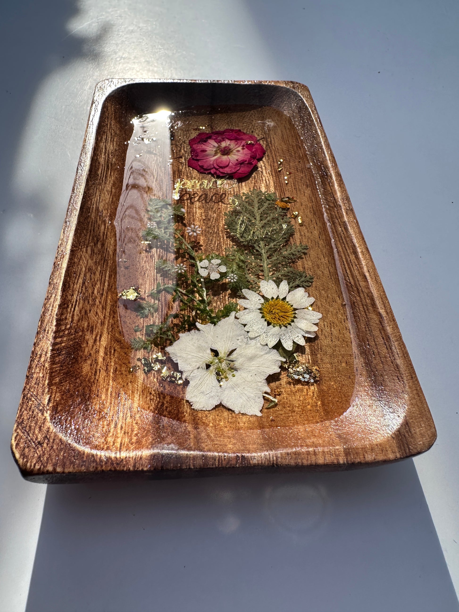 Introducing the Inspirational Blossom Trinket Trays, expertly handcrafted from epoxy resin, real dry flowers, gold flakes, and wood. These colorful and unique trays add a touch of nature-inspired charm to your space while serving as stylish storage solutions.