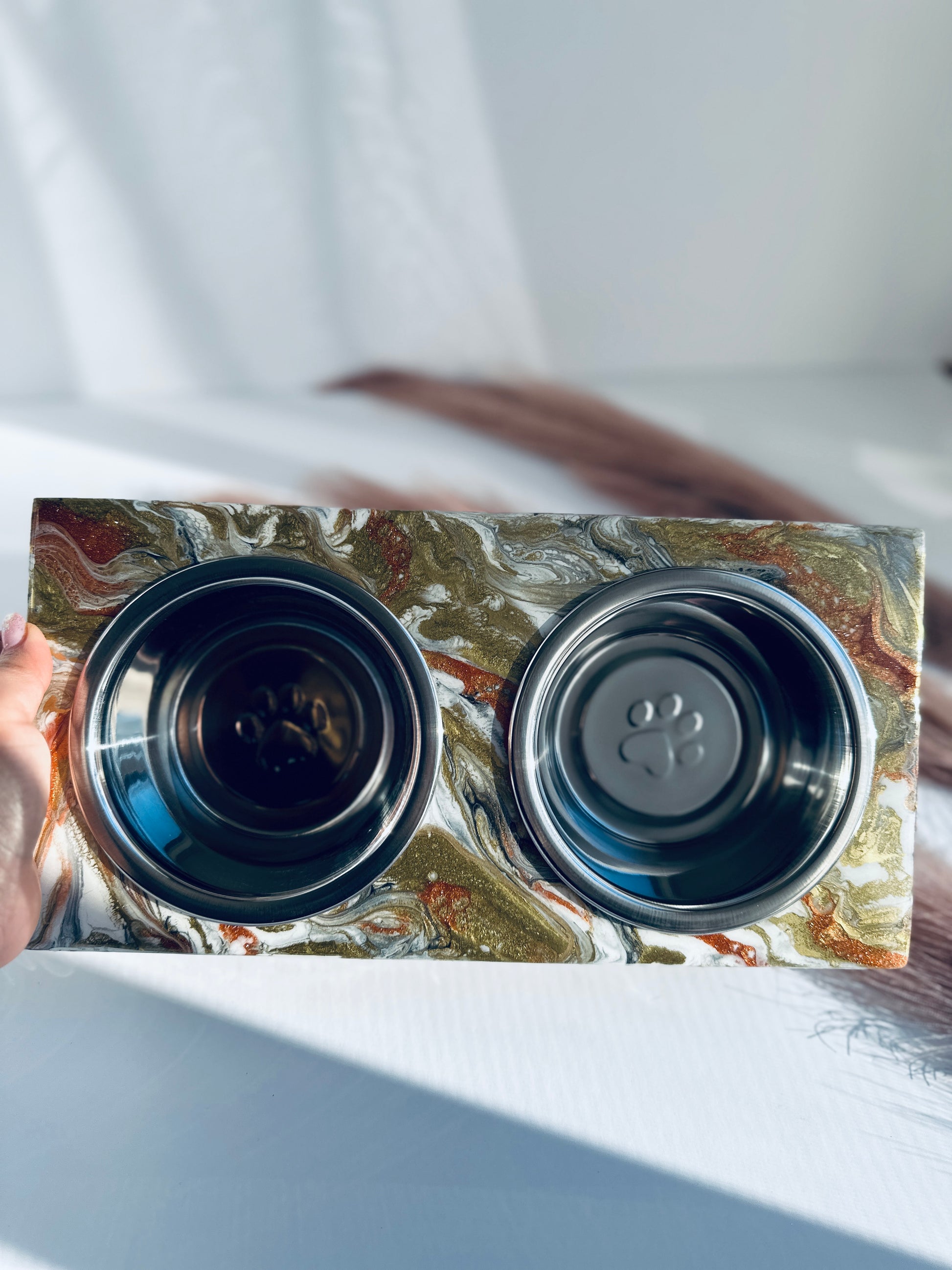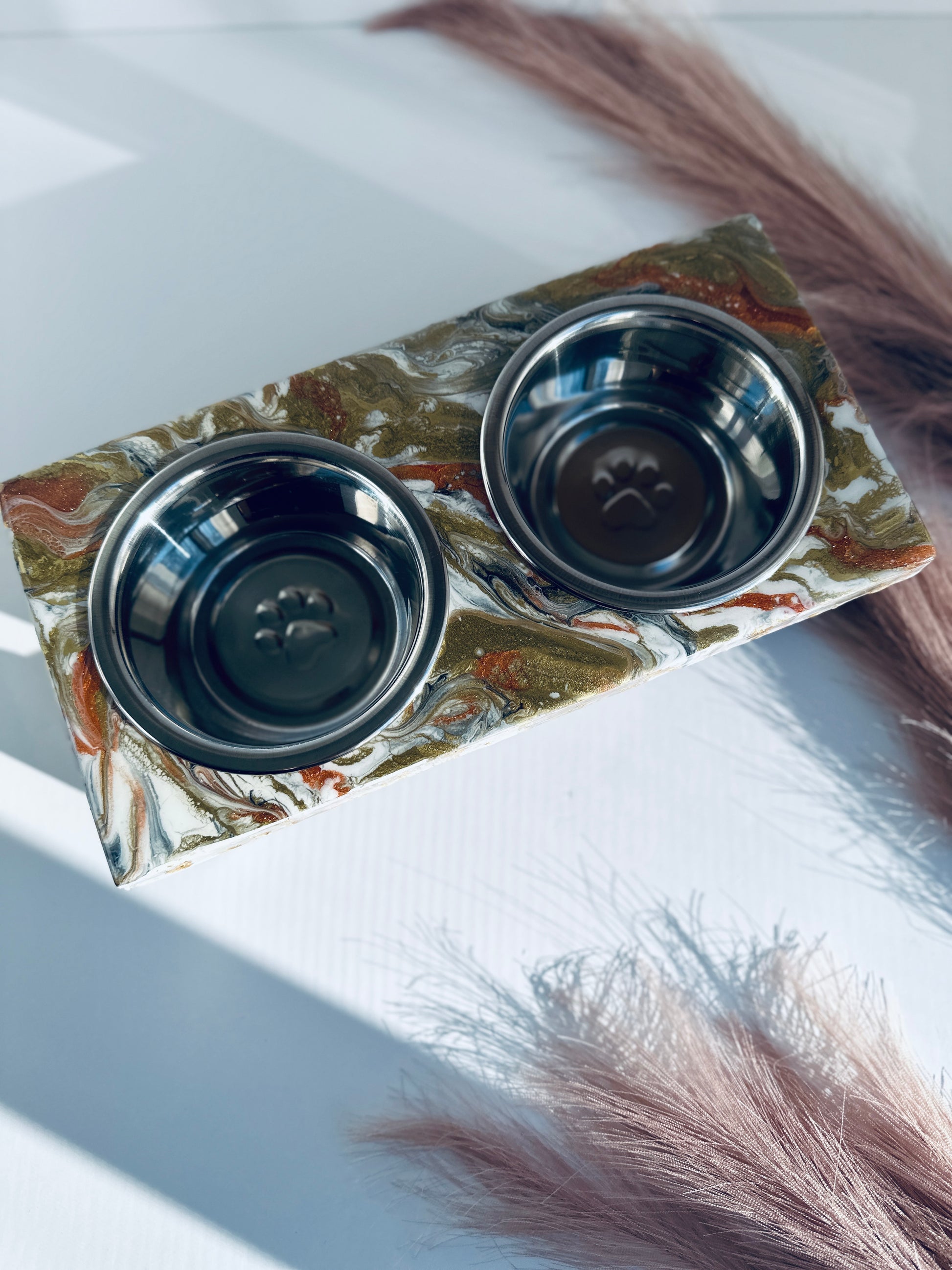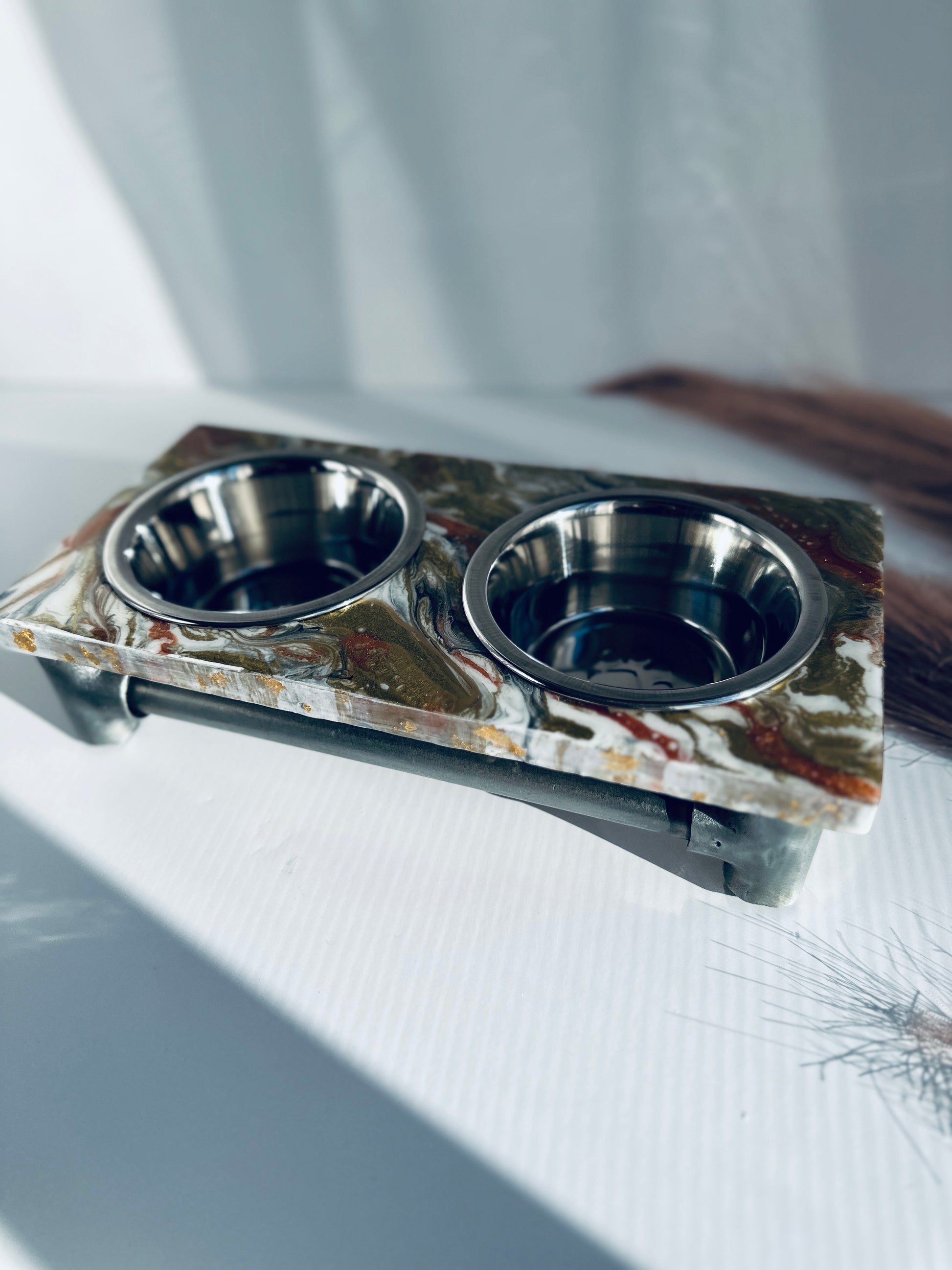 Looking for a unique pet feeder that is also high-quality and functional? Look no further than this handmade wooden pet feeder! Made with beautiful craftsmanship, this feeder is perfect for displaying your pet's food in a stylish way. The hand-poured resin design is food-safe and looks great, while the stainless steel bowl is durable and easy to clean.