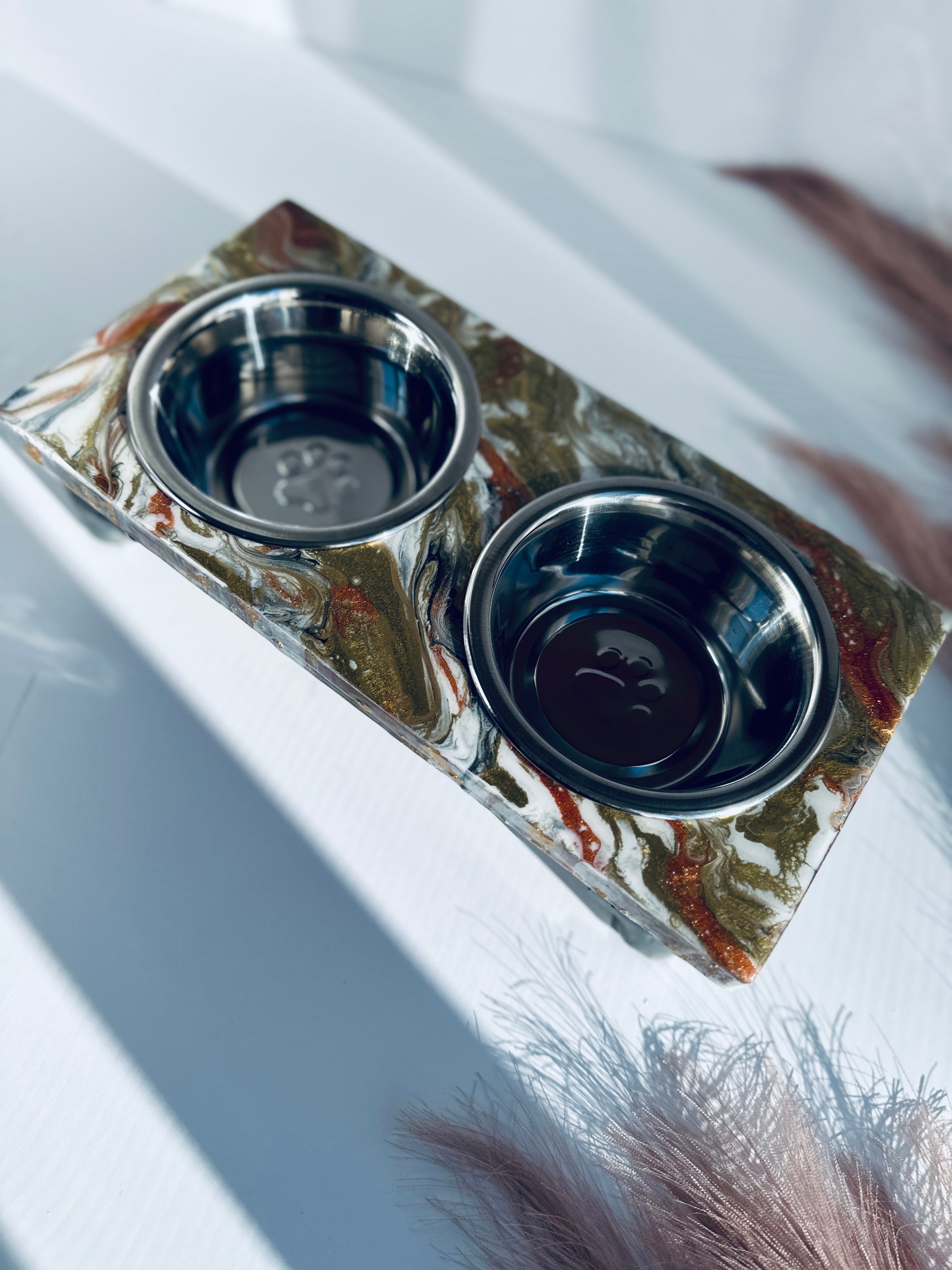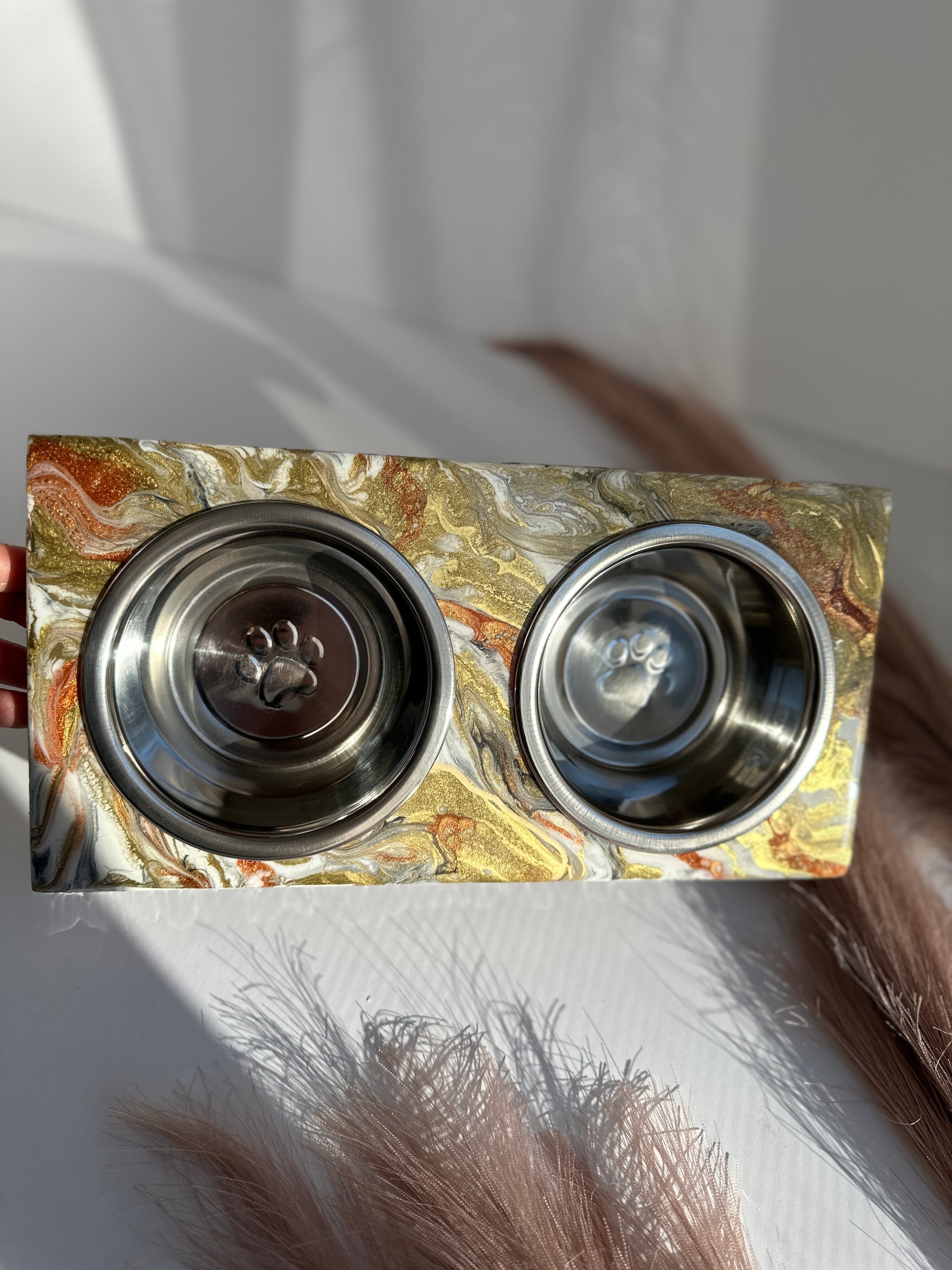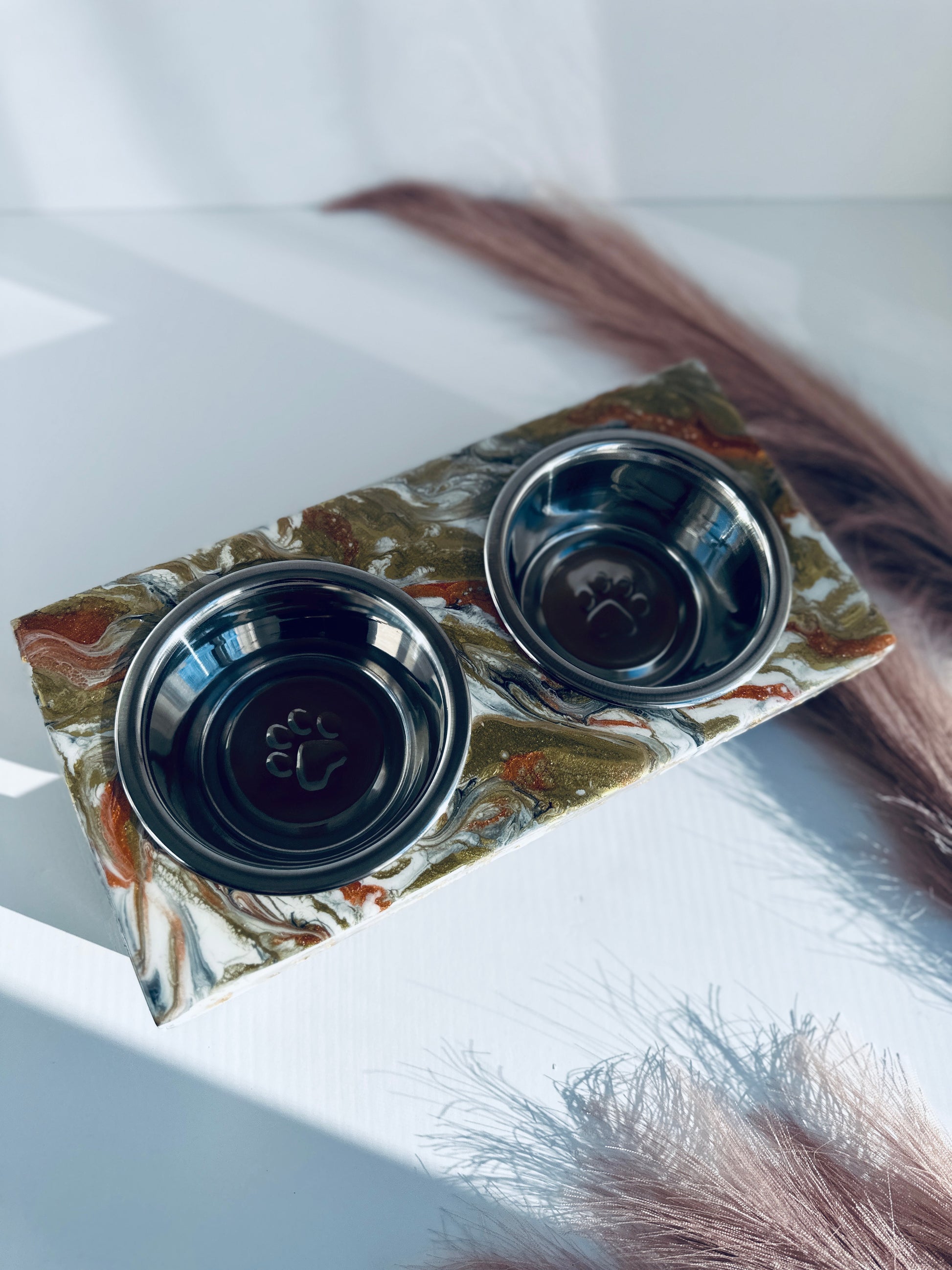 Looking for a unique pet feeder that is also high-quality and functional? Look no further than this handmade wooden pet feeder! Made with beautiful craftsmanship, this feeder is perfect for displaying your pet's food in a stylish way. The hand-poured resin design is food-safe and looks great, while the stainless steel bowl is durable and easy to clean.