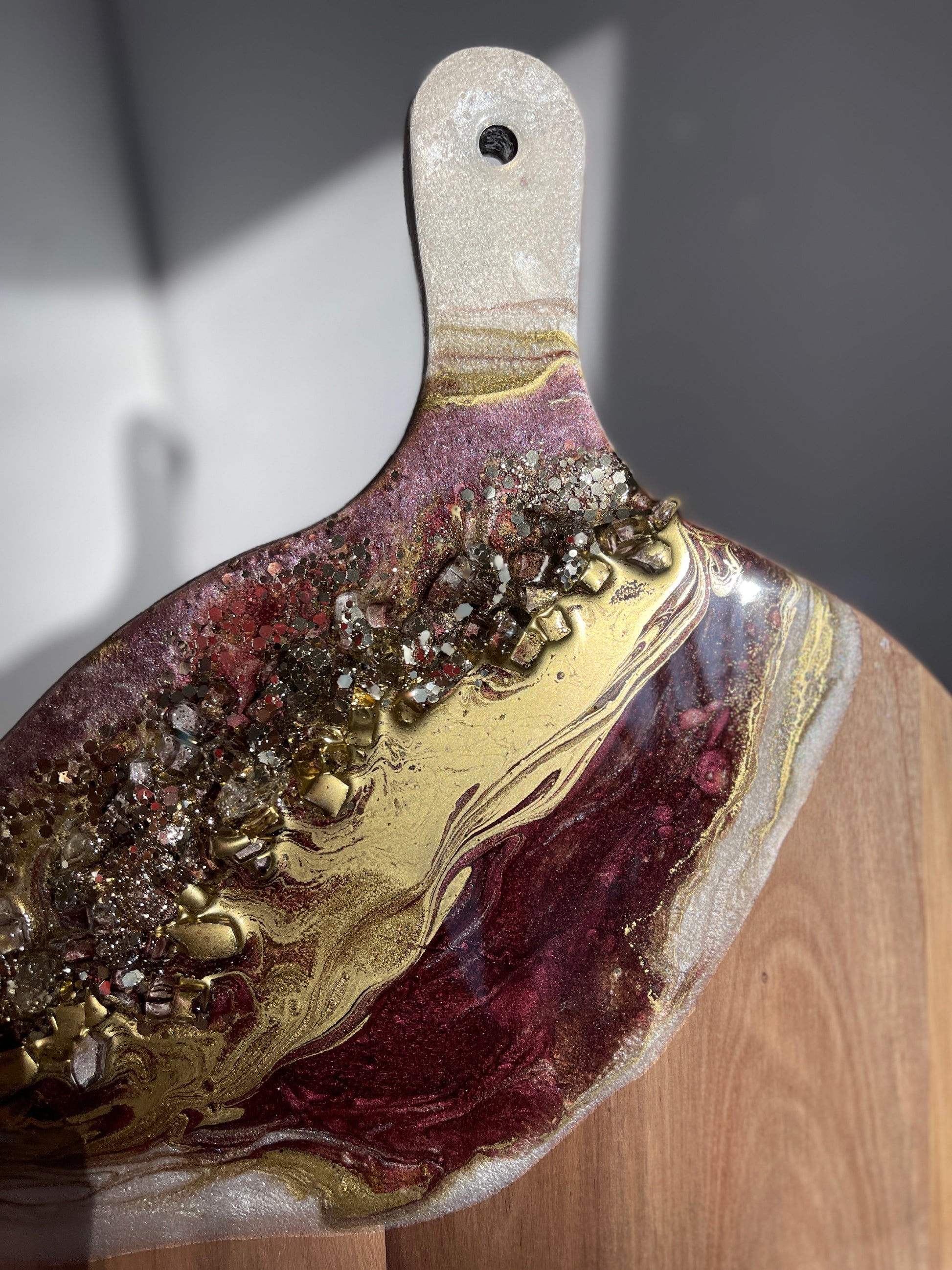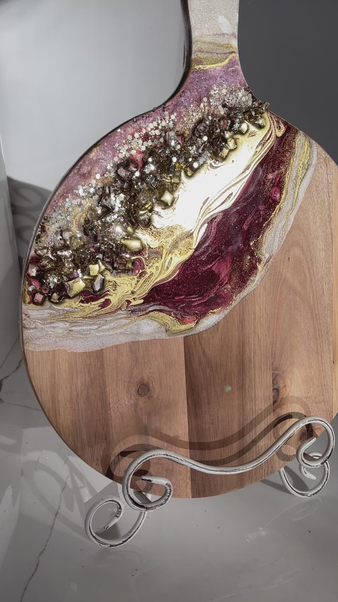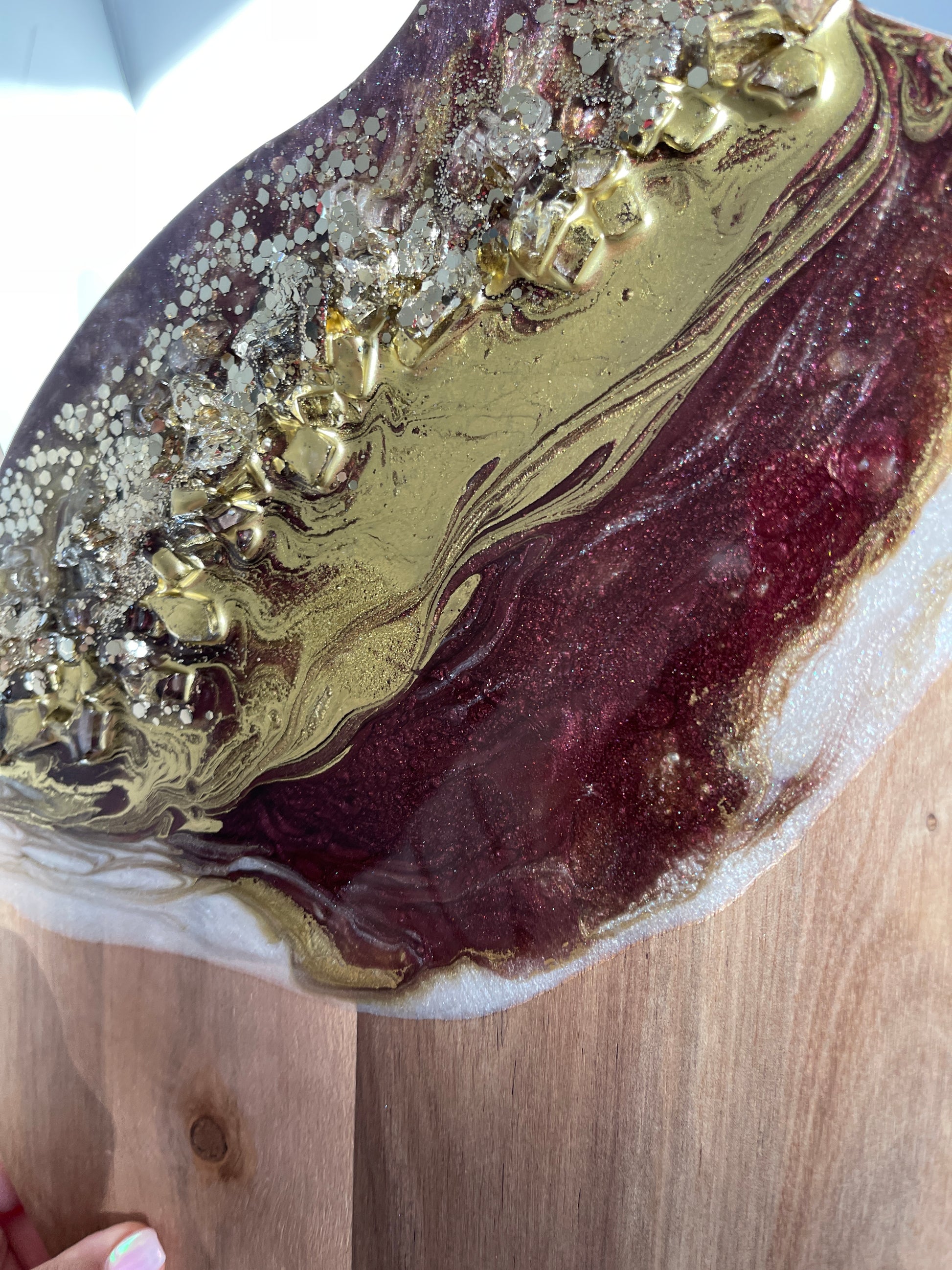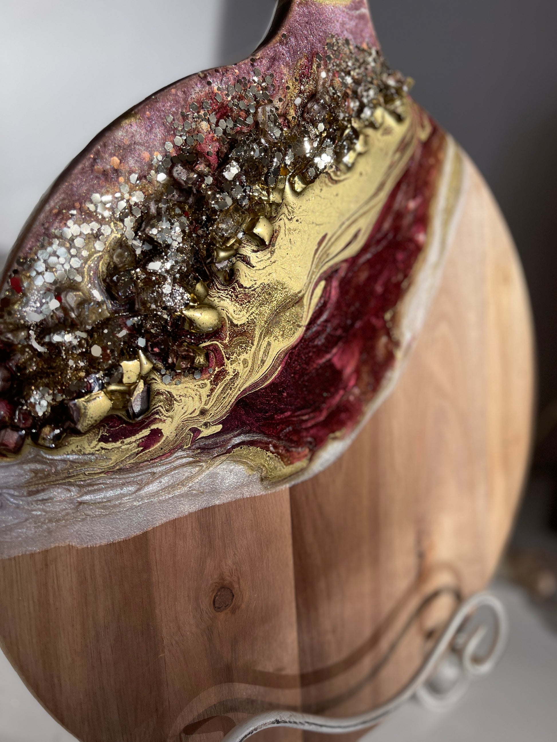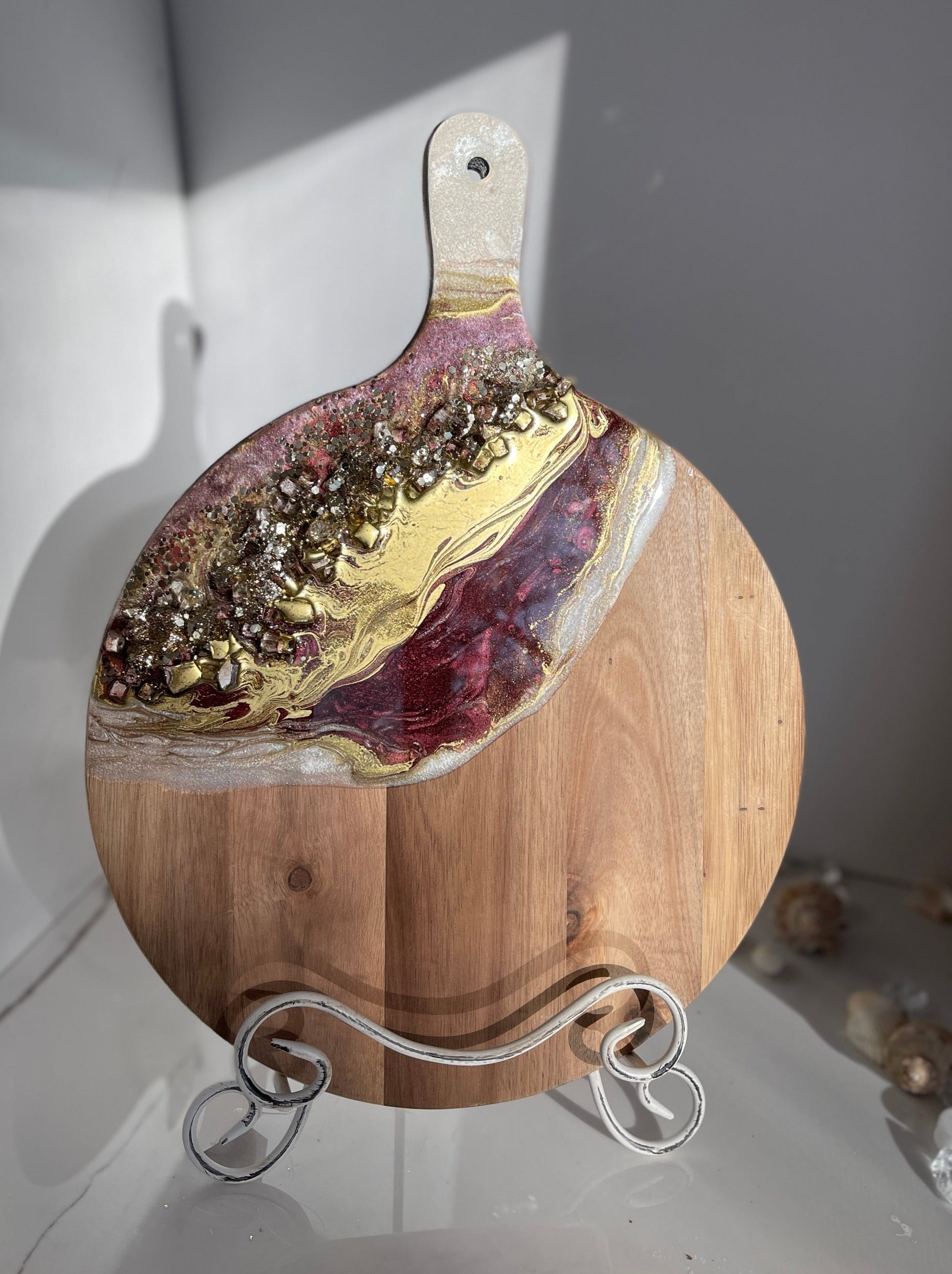 If you're looking for a one-of-a-kind cheeseboard set that will impress your guests, look no further than this Gold, Burgundy Geode Design Cheeseboard Set. The beautiful resin art is hand-poured in shades of gold, burgundy, & silver. The stone is handmade, making this set truly unique. Whether you're giving it as a wedding gift, a birthday gift, or a housewarming gift, this set is sure to please.