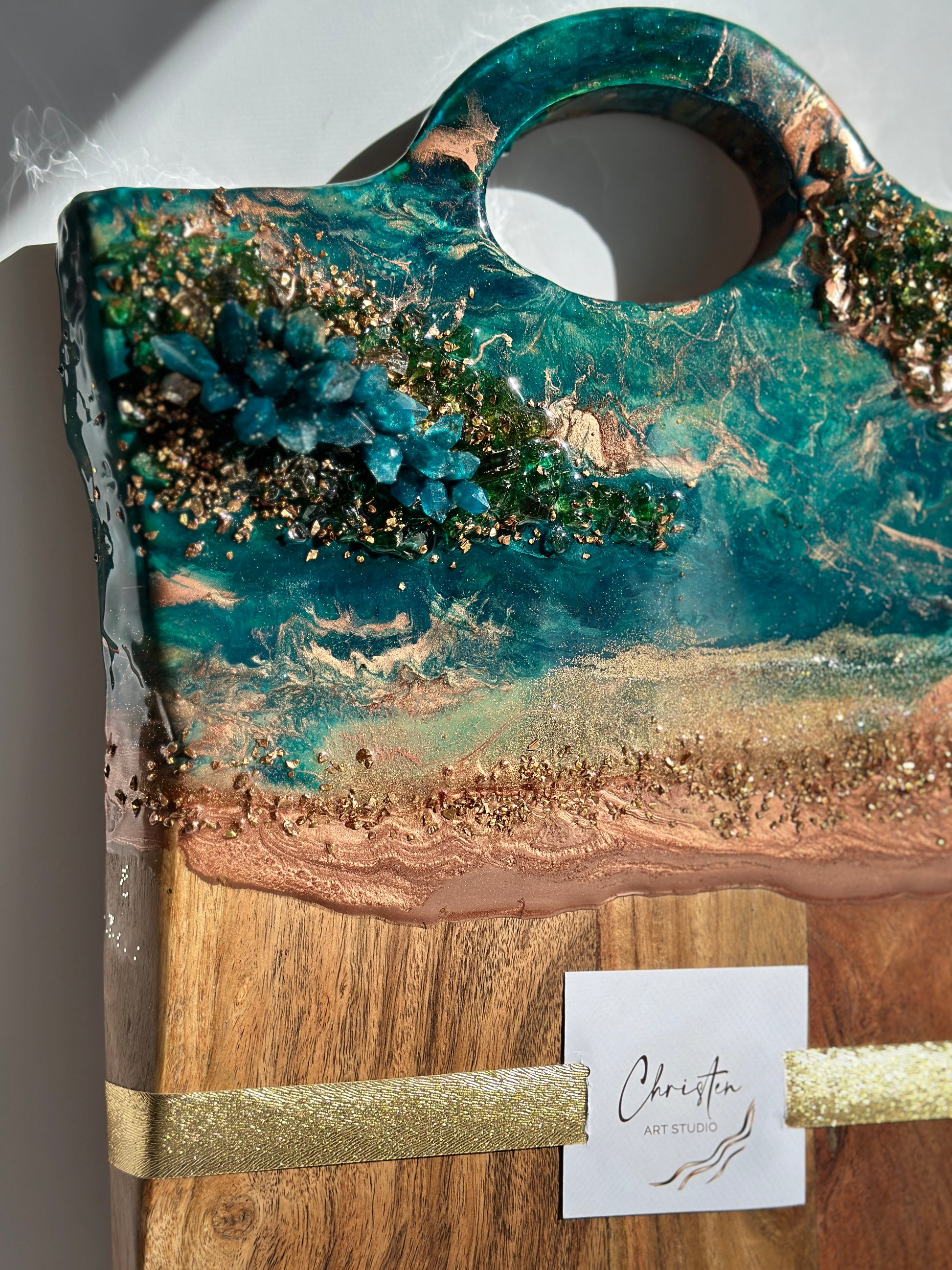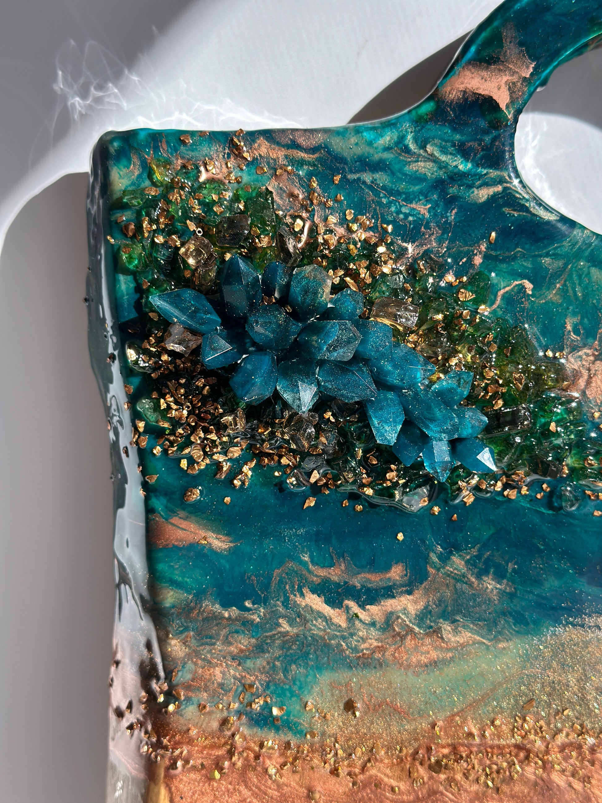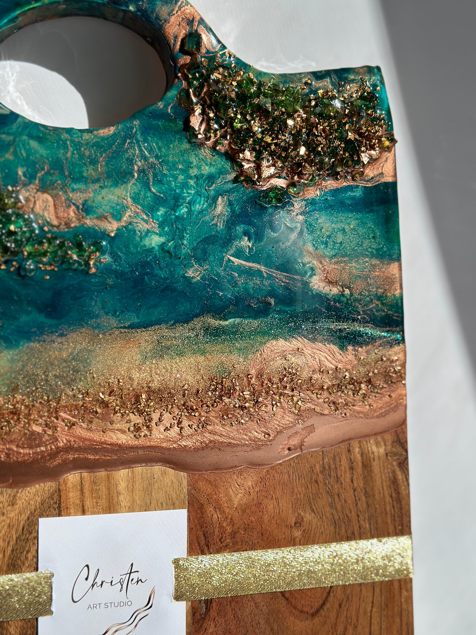 If you're looking for a one-of-a-kind cheeseboard set that will impress your guests, look no further than this Gold, Geode Design Cheeseboard. The beautiful resin art is hand-poured in shades of Green and Copper, making it unique whether you're giving it as a wedding gift, a birthday gift, or a housewarming gift; this set is sure to please.