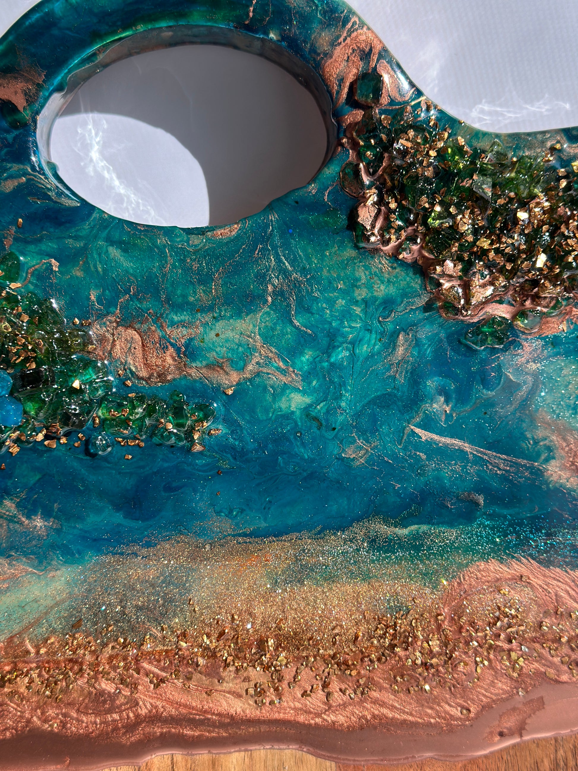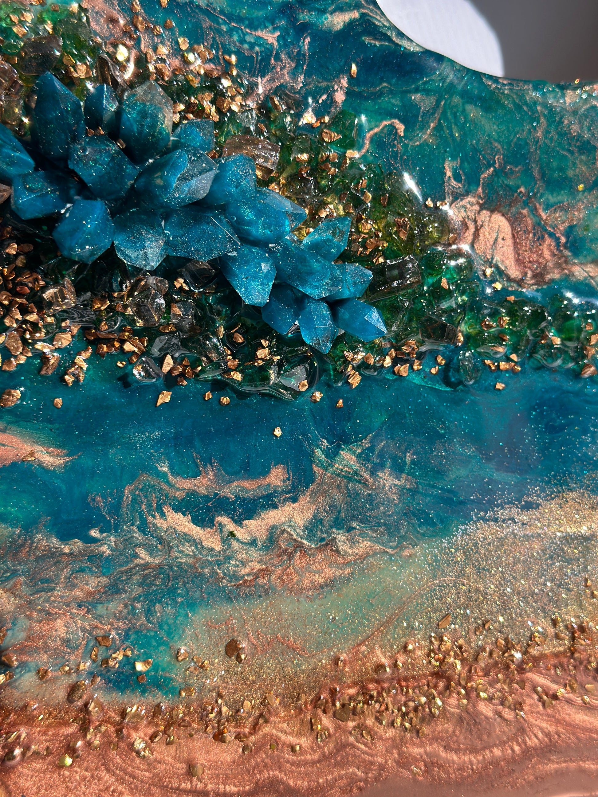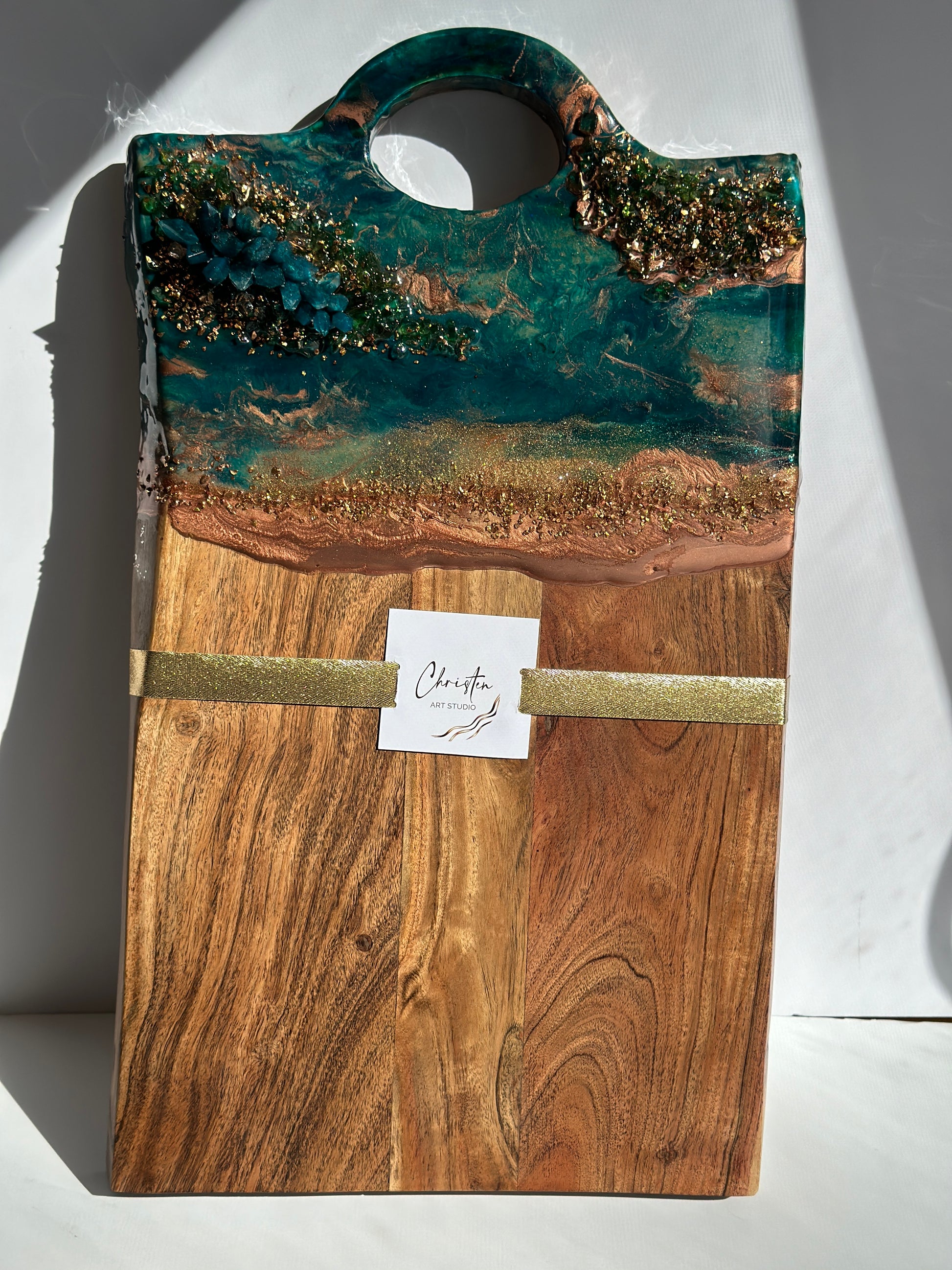 If you're looking for a one-of-a-kind cheeseboard set that will impress your guests, look no further than this Gold, Geode Design Cheeseboard. The beautiful resin art is hand-poured in shades of Green and Copper, making it unique whether you're giving it as a wedding gift, a birthday gift, or a housewarming gift; this set is sure to please.