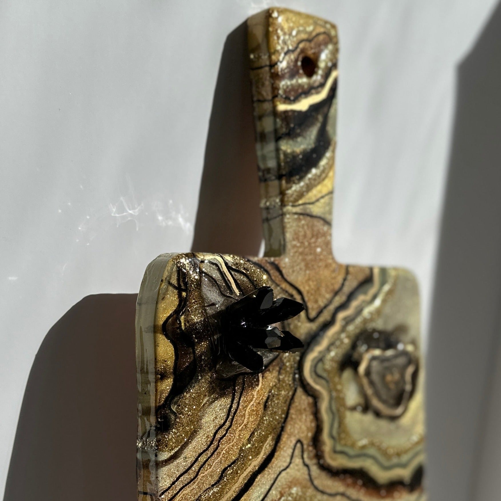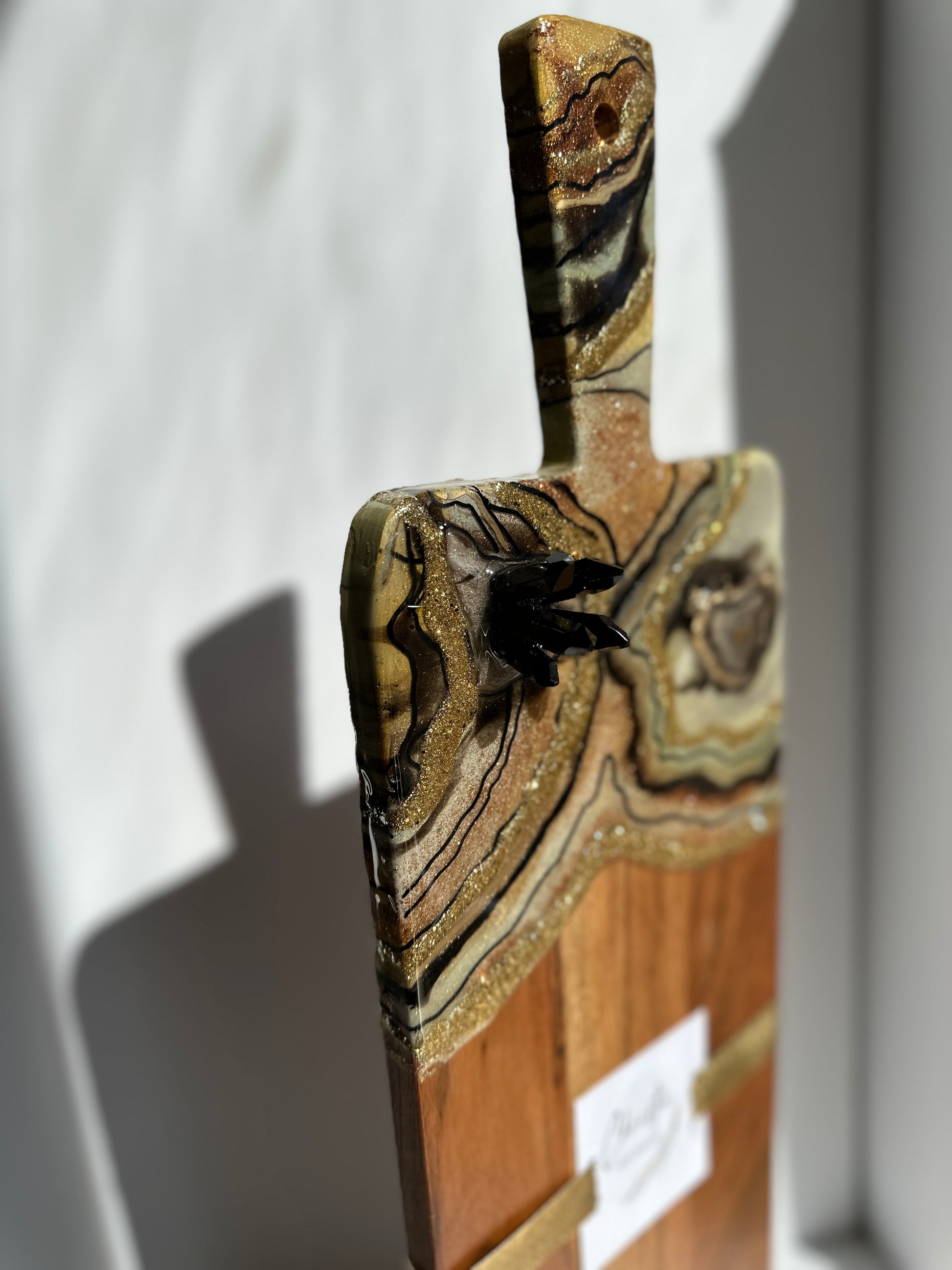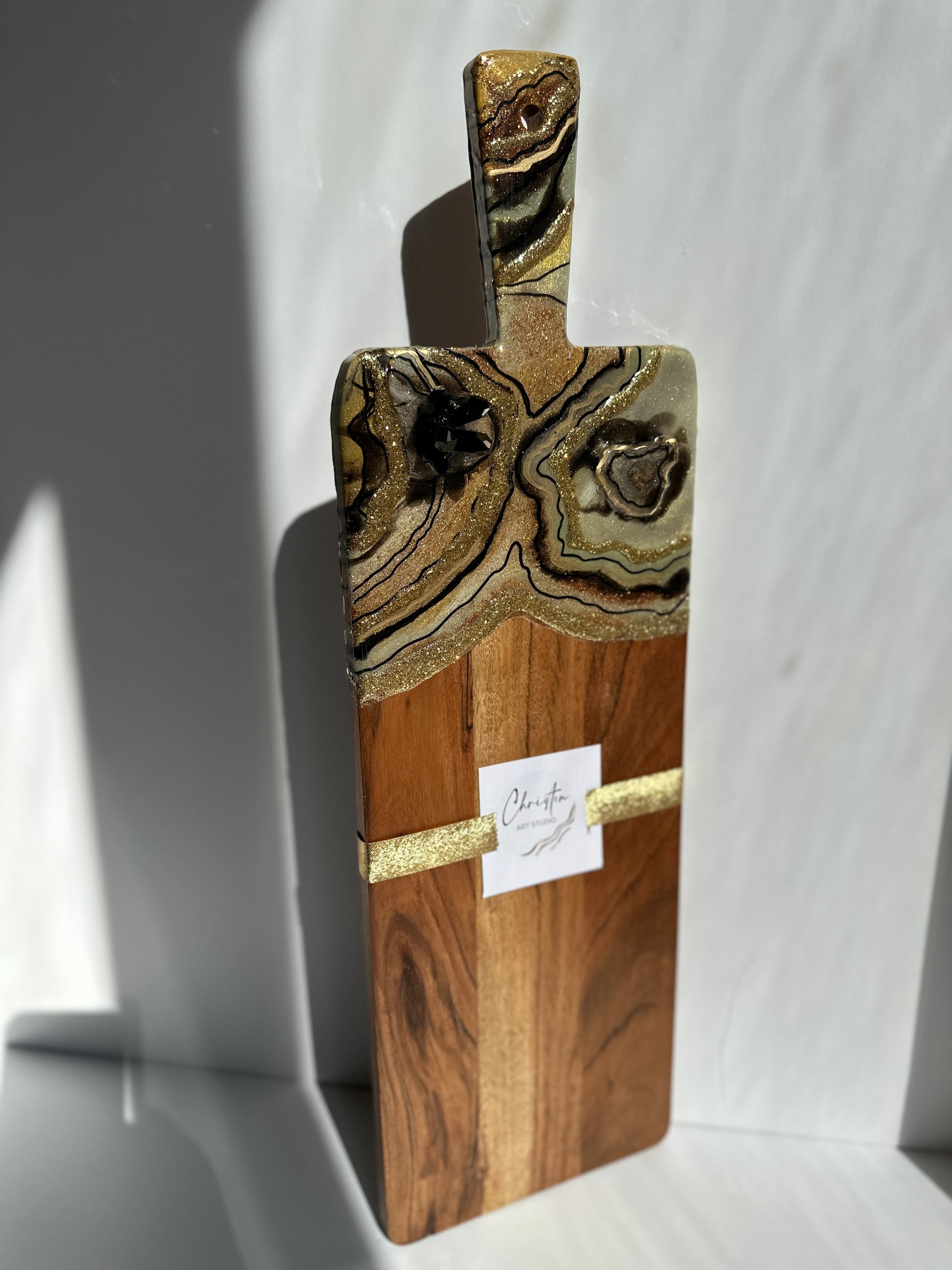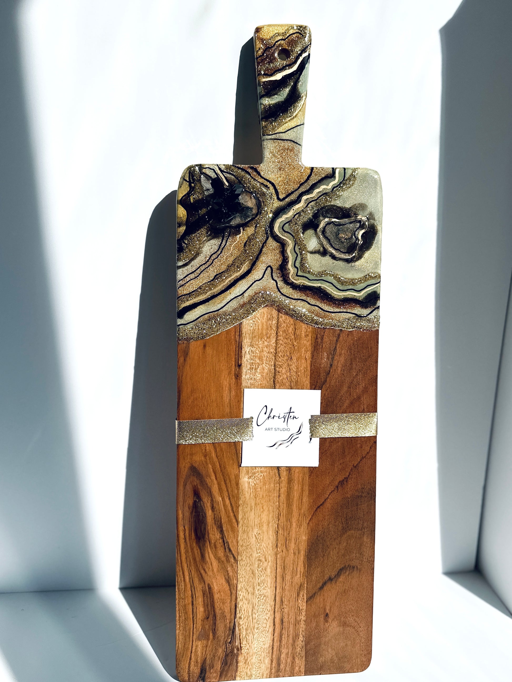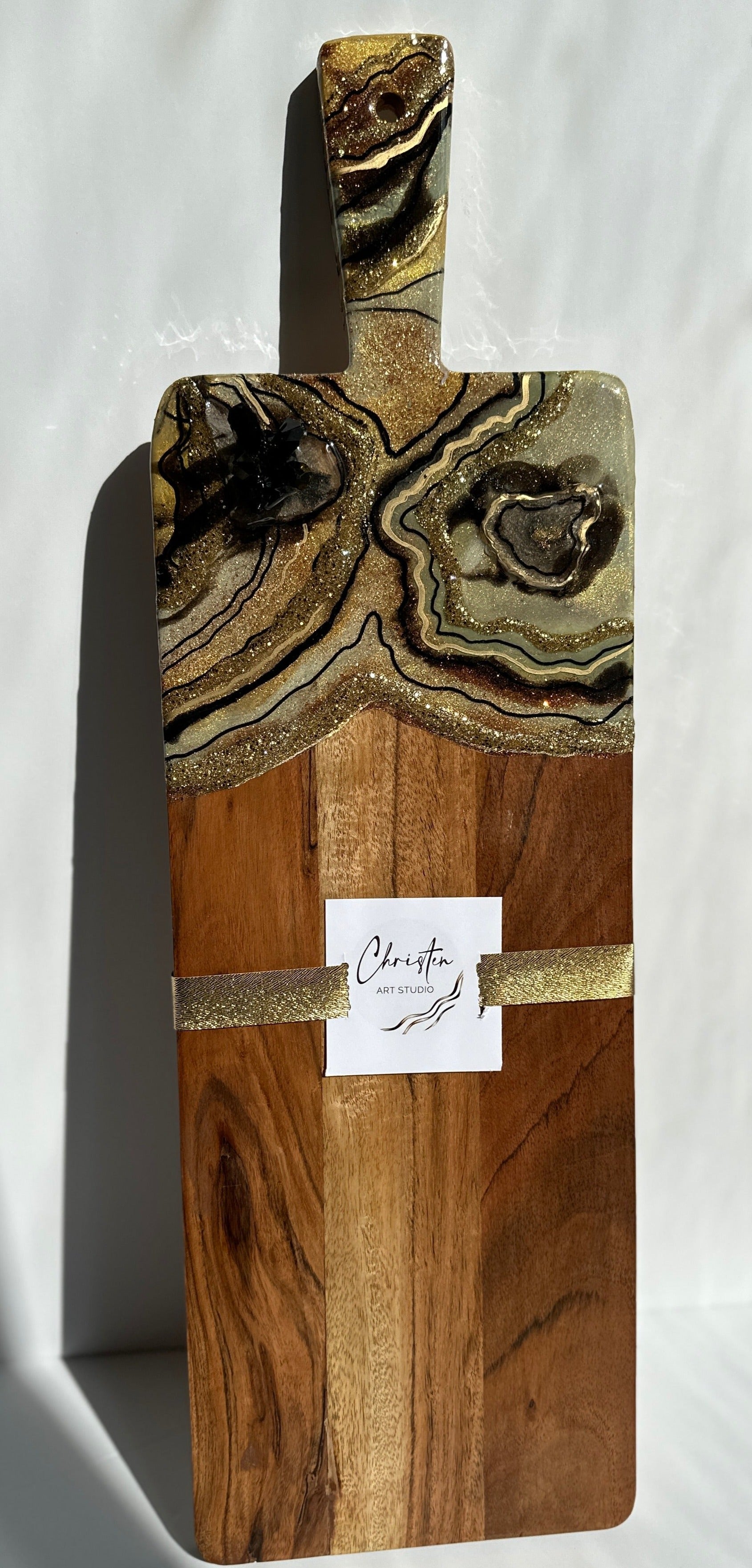 If you're looking for a one-of-a-kind cheeseboard set that will impress your guests, look no further than this Gold, Geode Design Cheeseboard. The beautiful resin art is hand-poured in shades of mint Green and Gold. The dark stone is handmade, making this set truly unique. Whether you're giving it as a wedding gift, a birthday gift, housewarming gift, this set is sure to please.