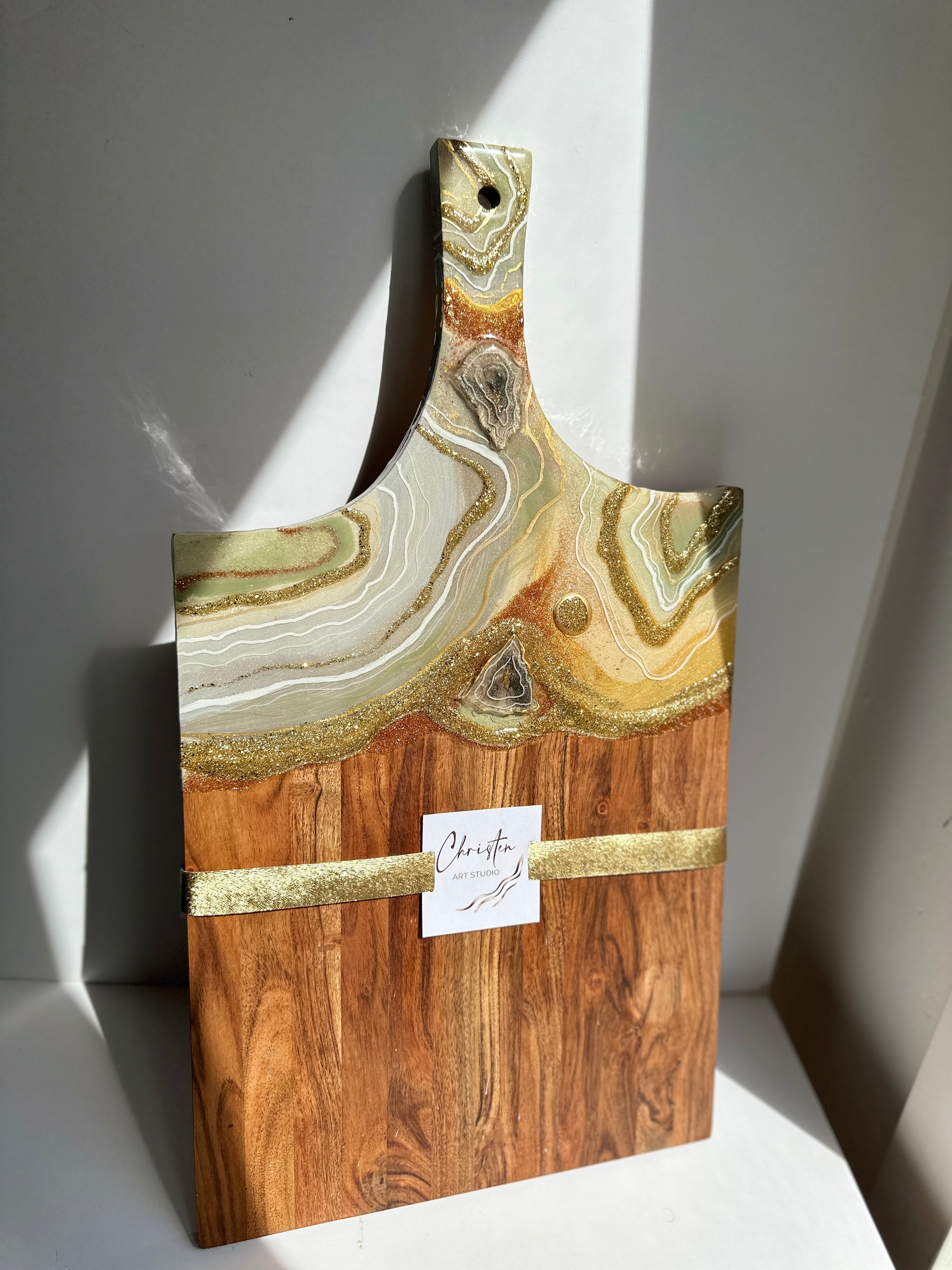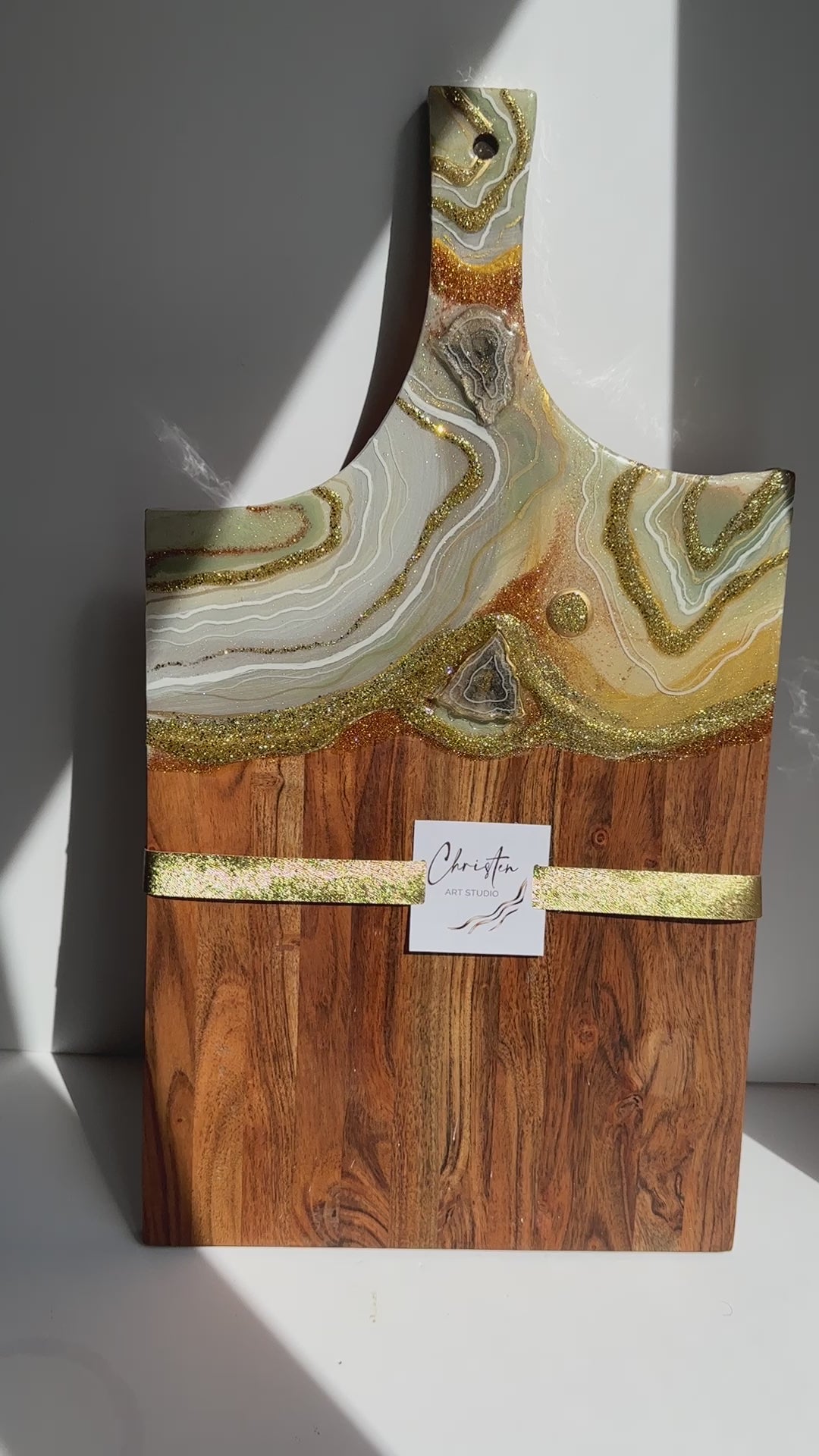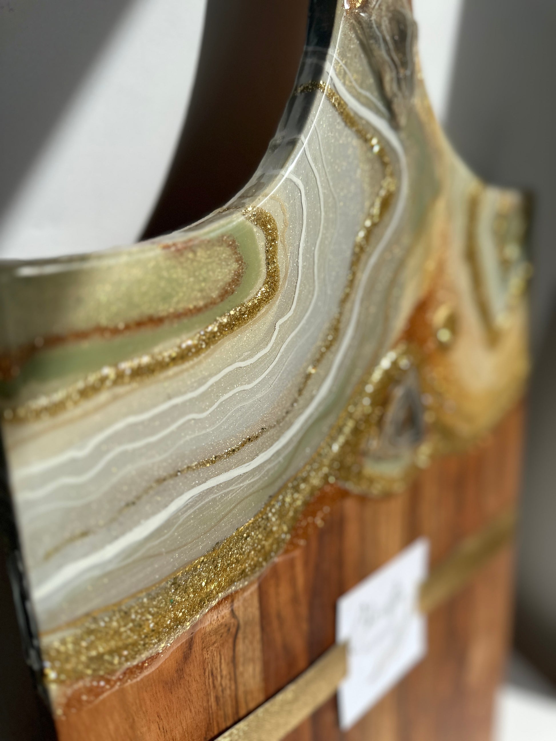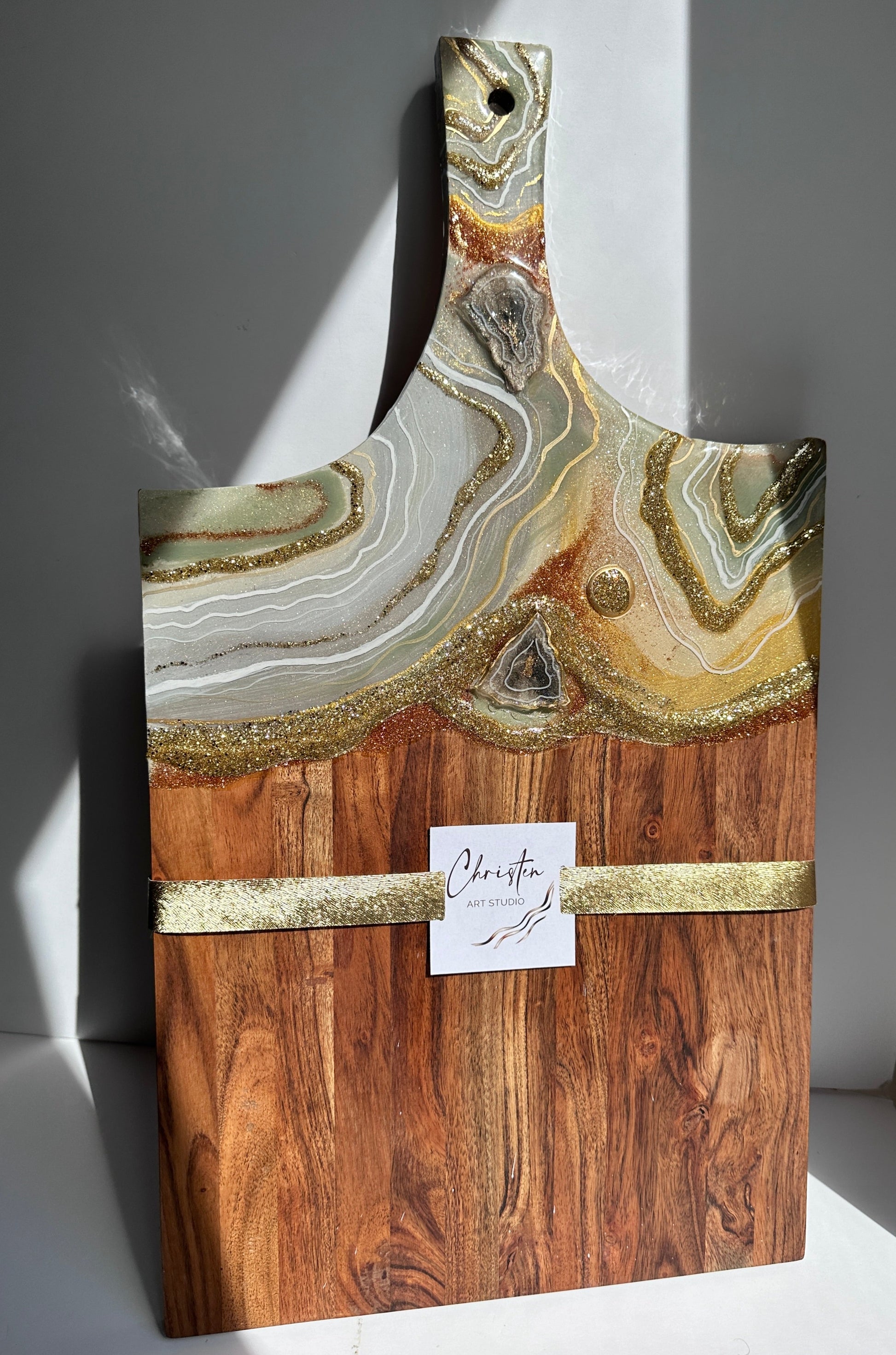 If you're looking for a one-of-a-kind cheeseboard set that will impress your guests, look no further than this Gold, Geode Design Cheeseboard. The beautiful resin art is hand-poured in shades of mint Green and Gold. The dark stone is handmade, making this set truly unique. Whether you're giving it as a wedding gift, a birthday gift, housewarming gift, this set is sure to please.