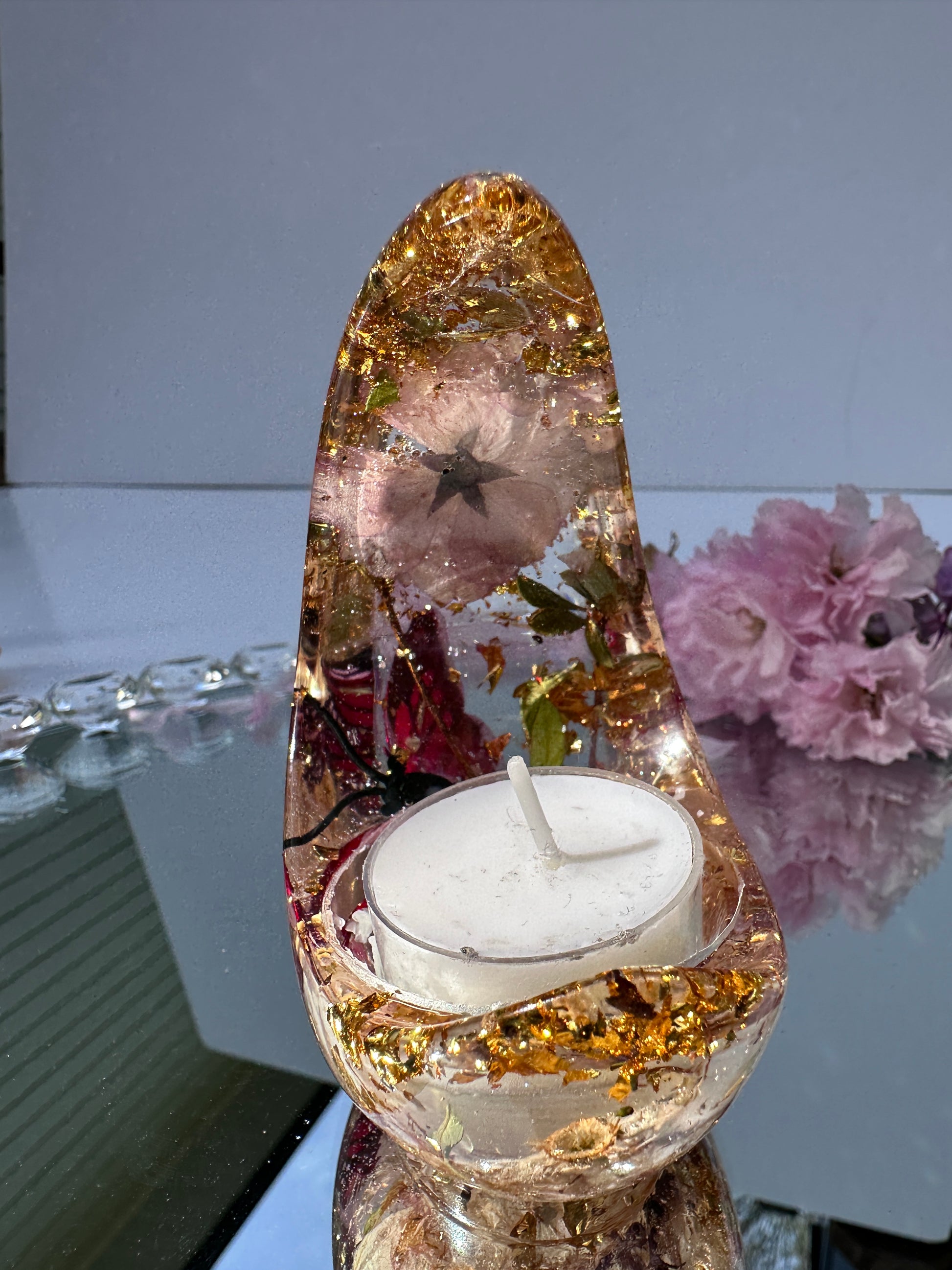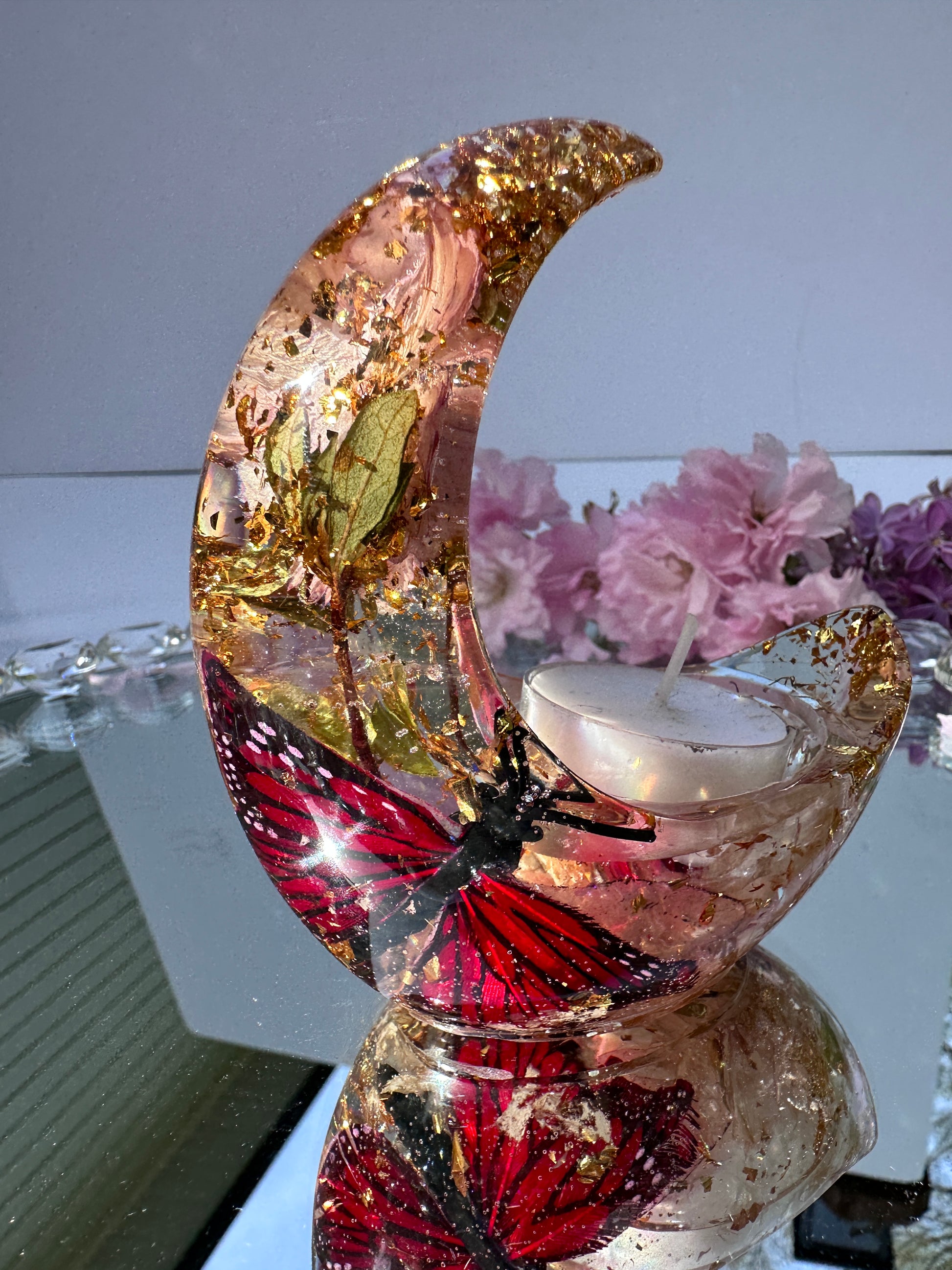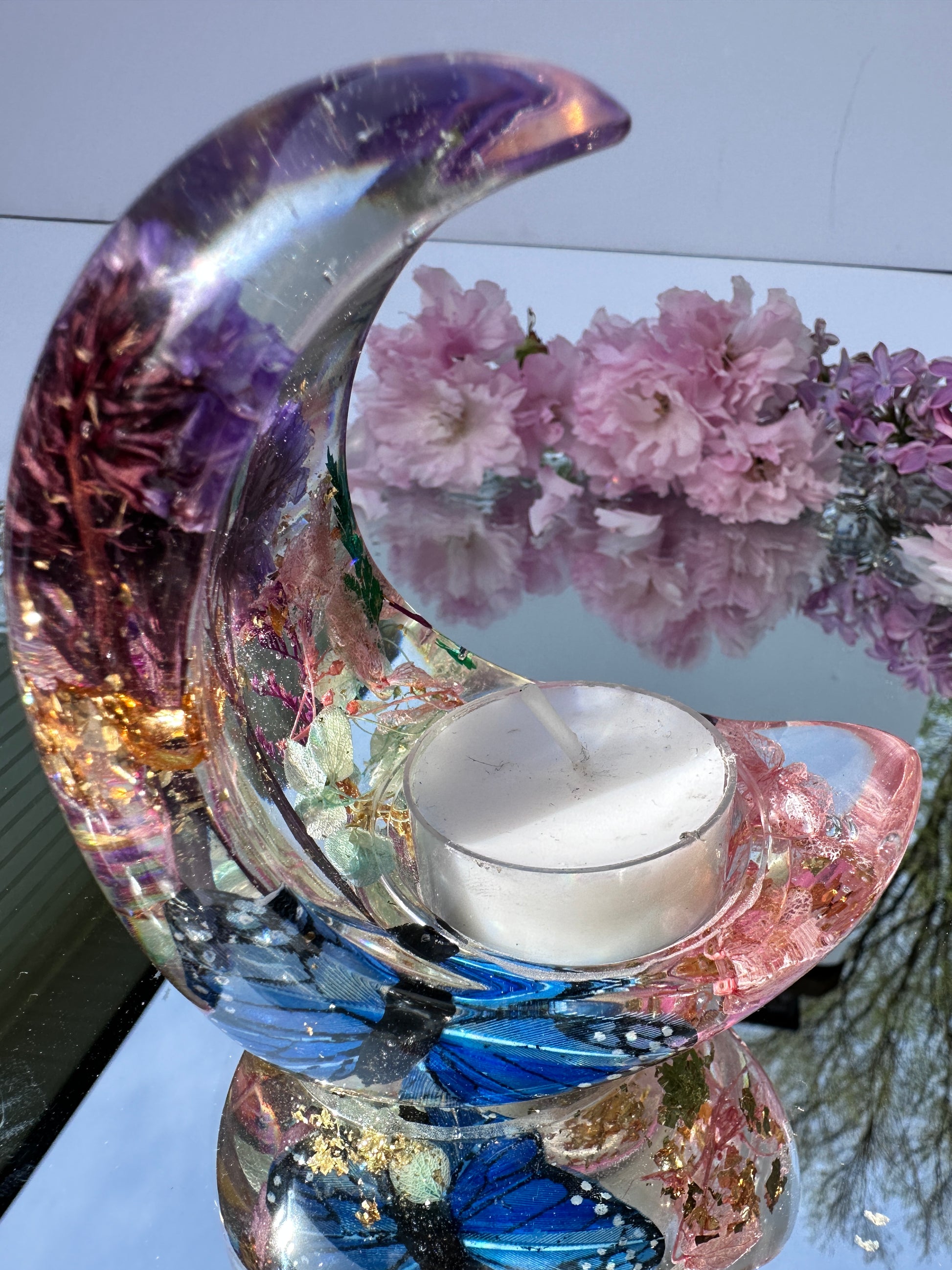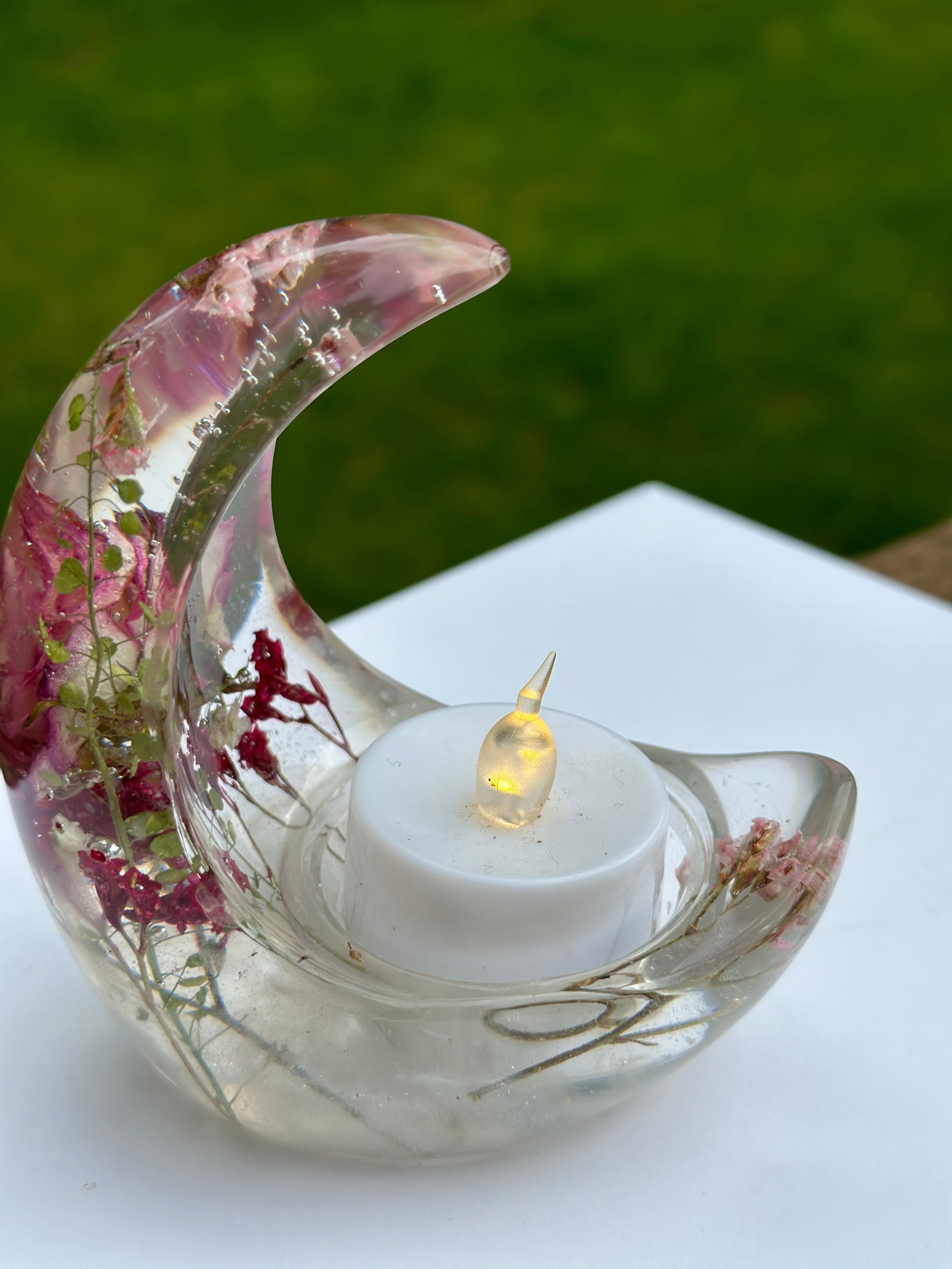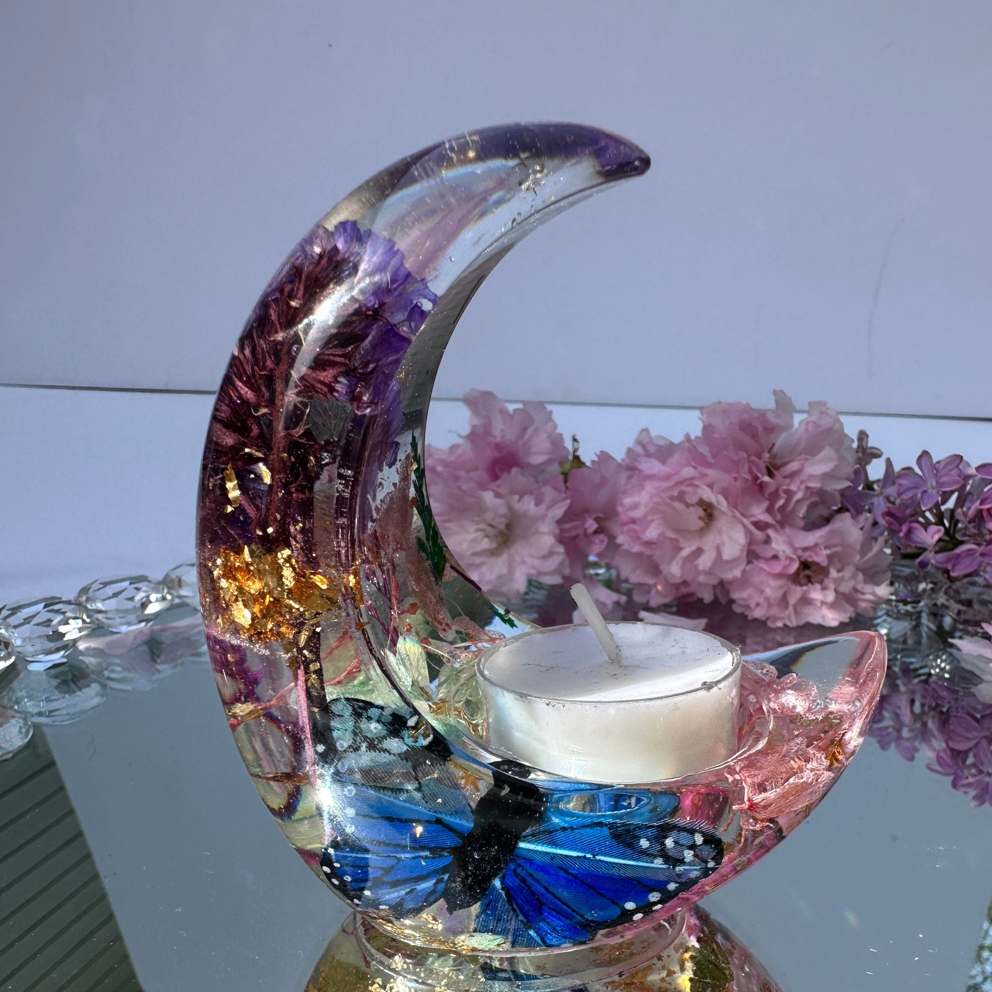 Embrace the enchanting glow of our Moon Flower Tea Light Candle Holder, meticulously handcrafted from epoxy resin and adorned with real dry flowers and gold flakes. This mesmerizing moon-shaped candle holder brings a touch of nature-inspired elegance to any space.