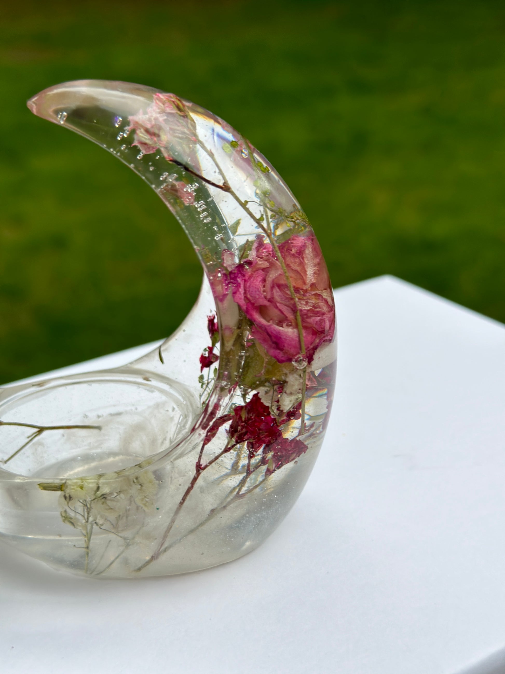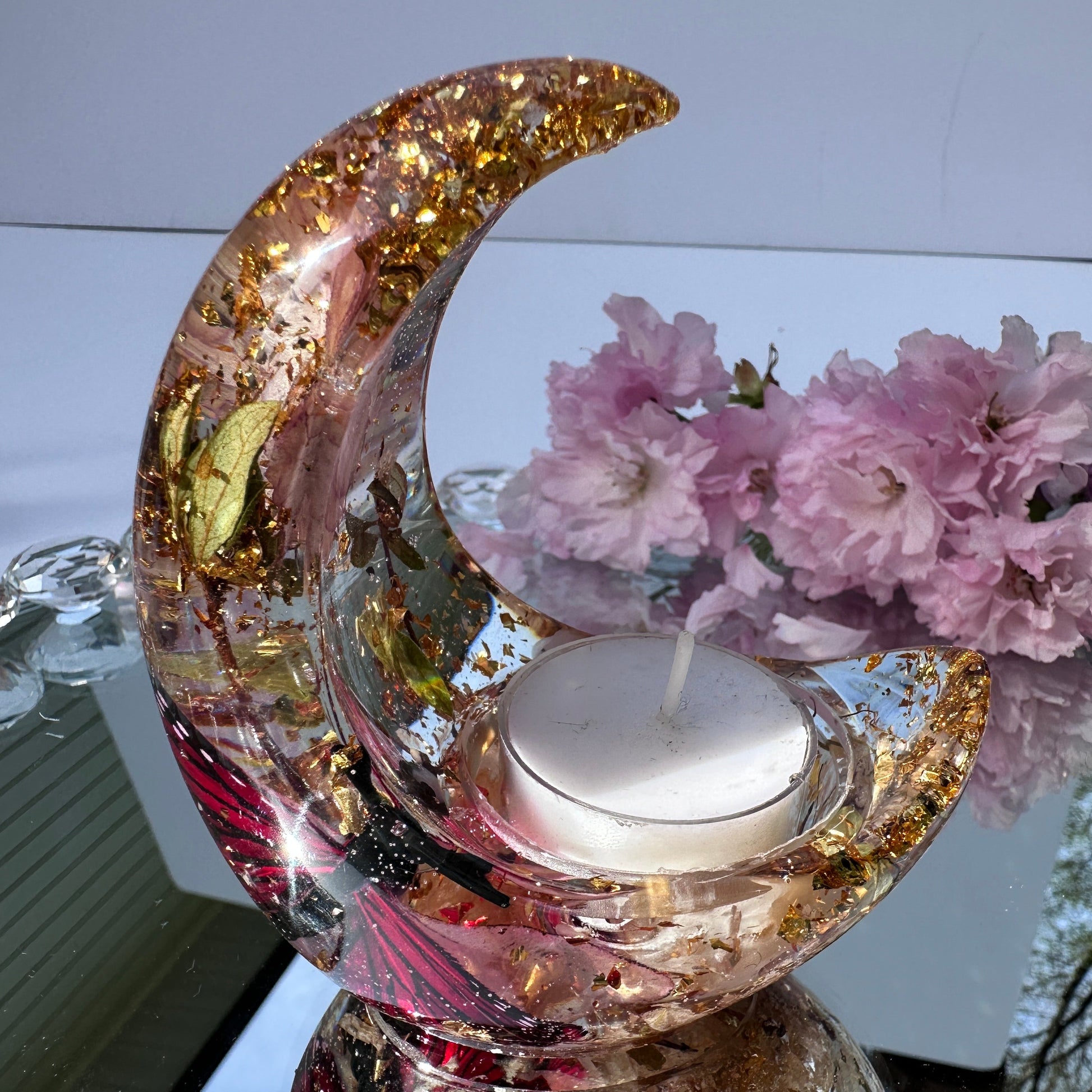 #MoonFlowerTeaLightHolder #HandmadeCandleHolder #DryFlowerDesign #GoldFlakes #EpoxyResin #HeatResistant #HomeDecor #NatureInspired #UniqueGiftIdea #MoonShapedCandleHolder