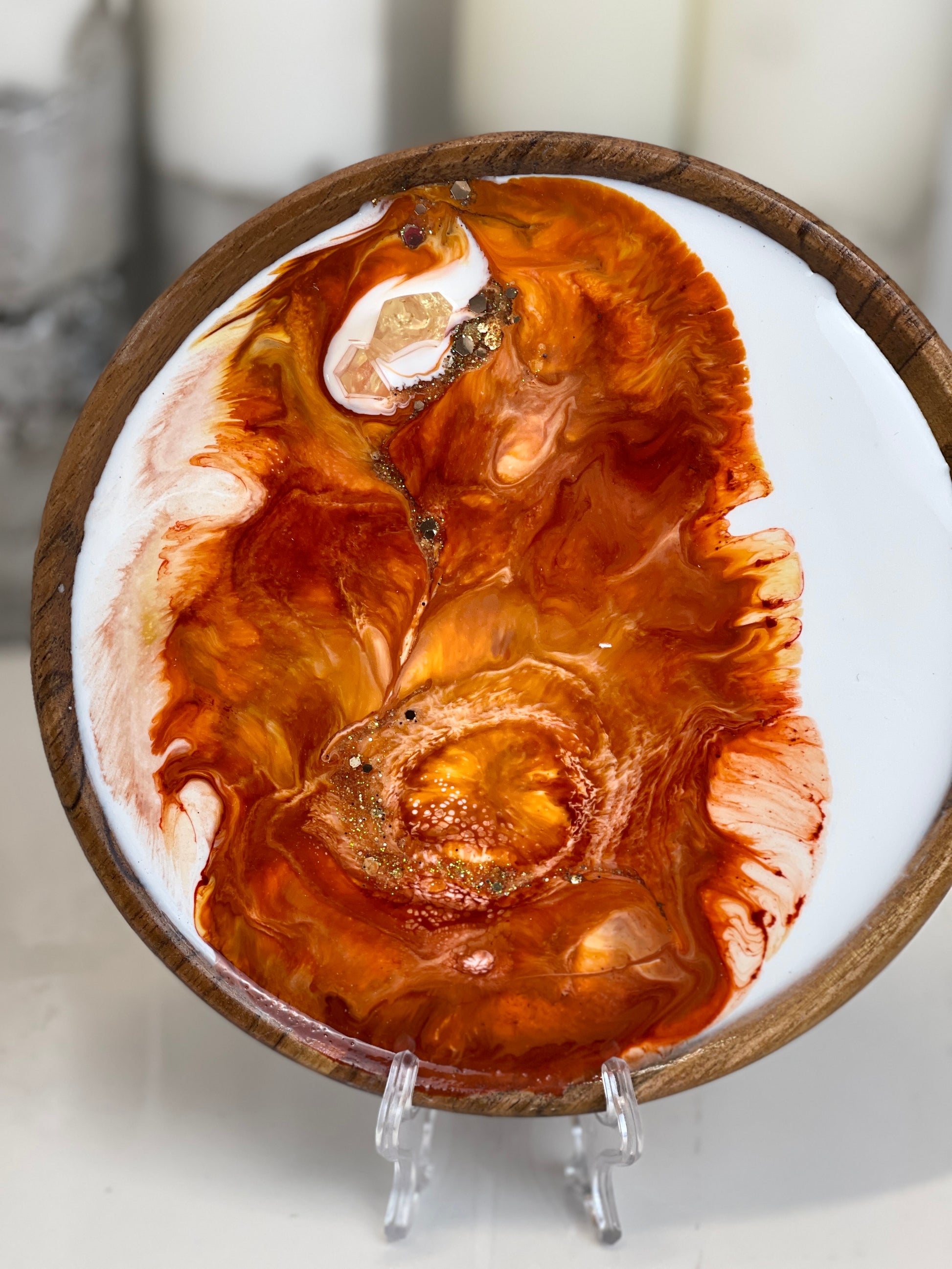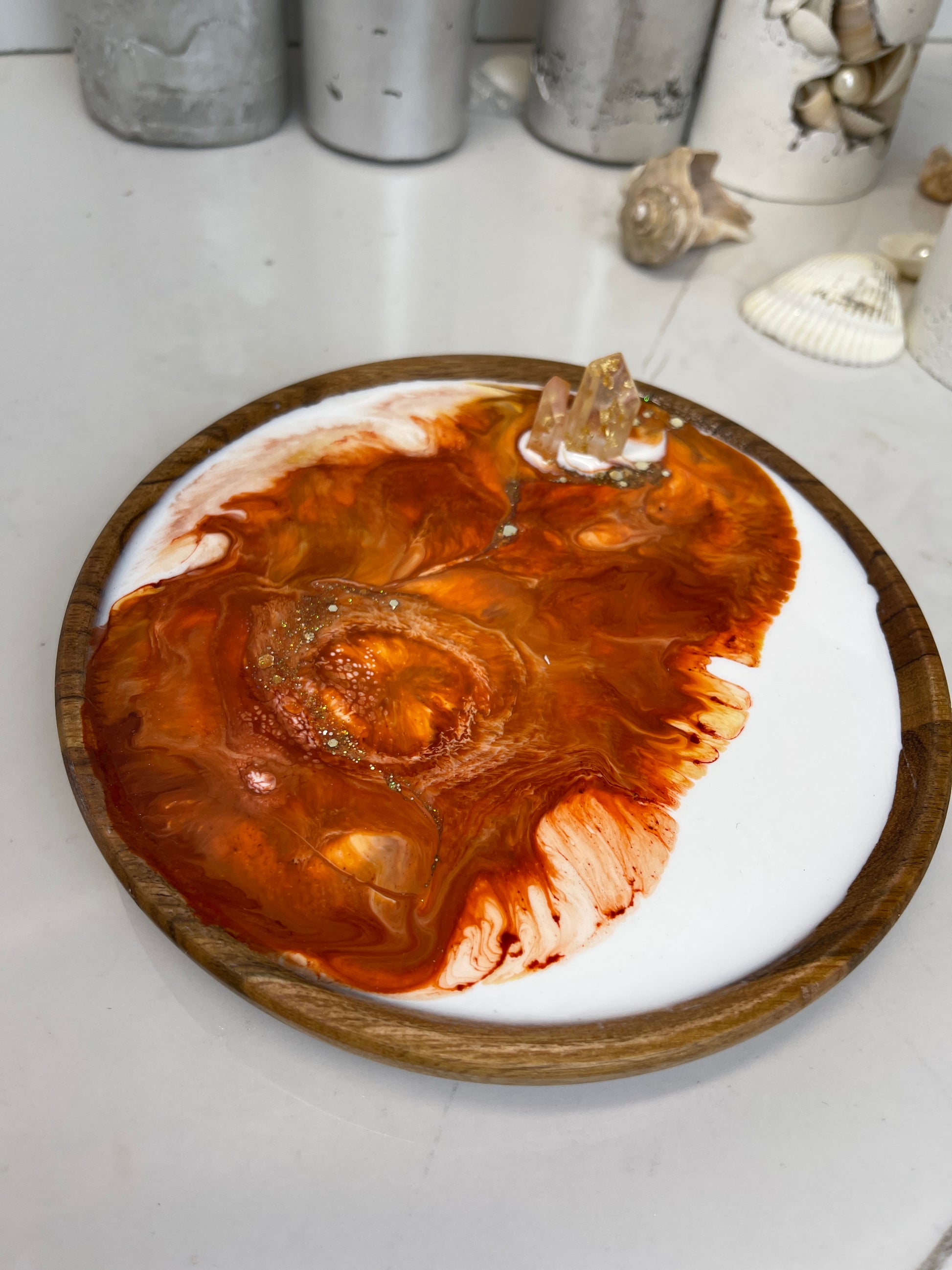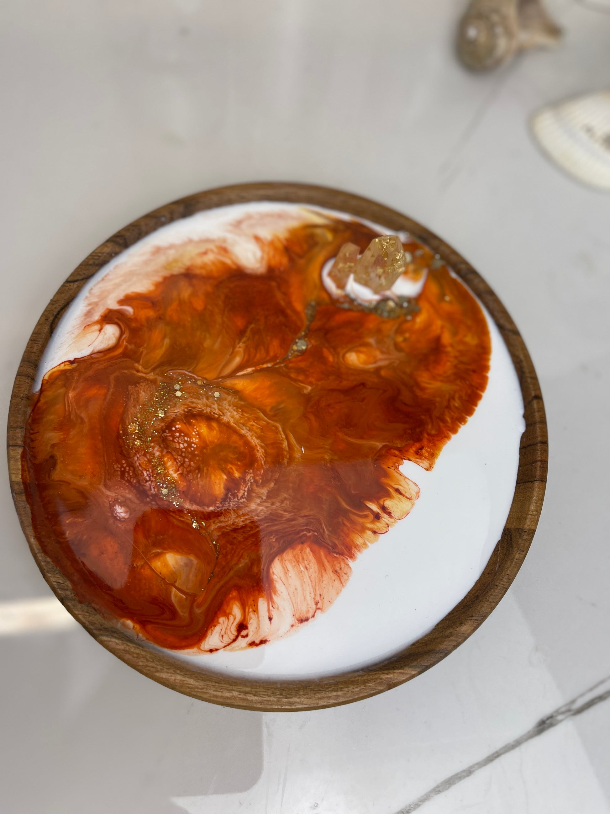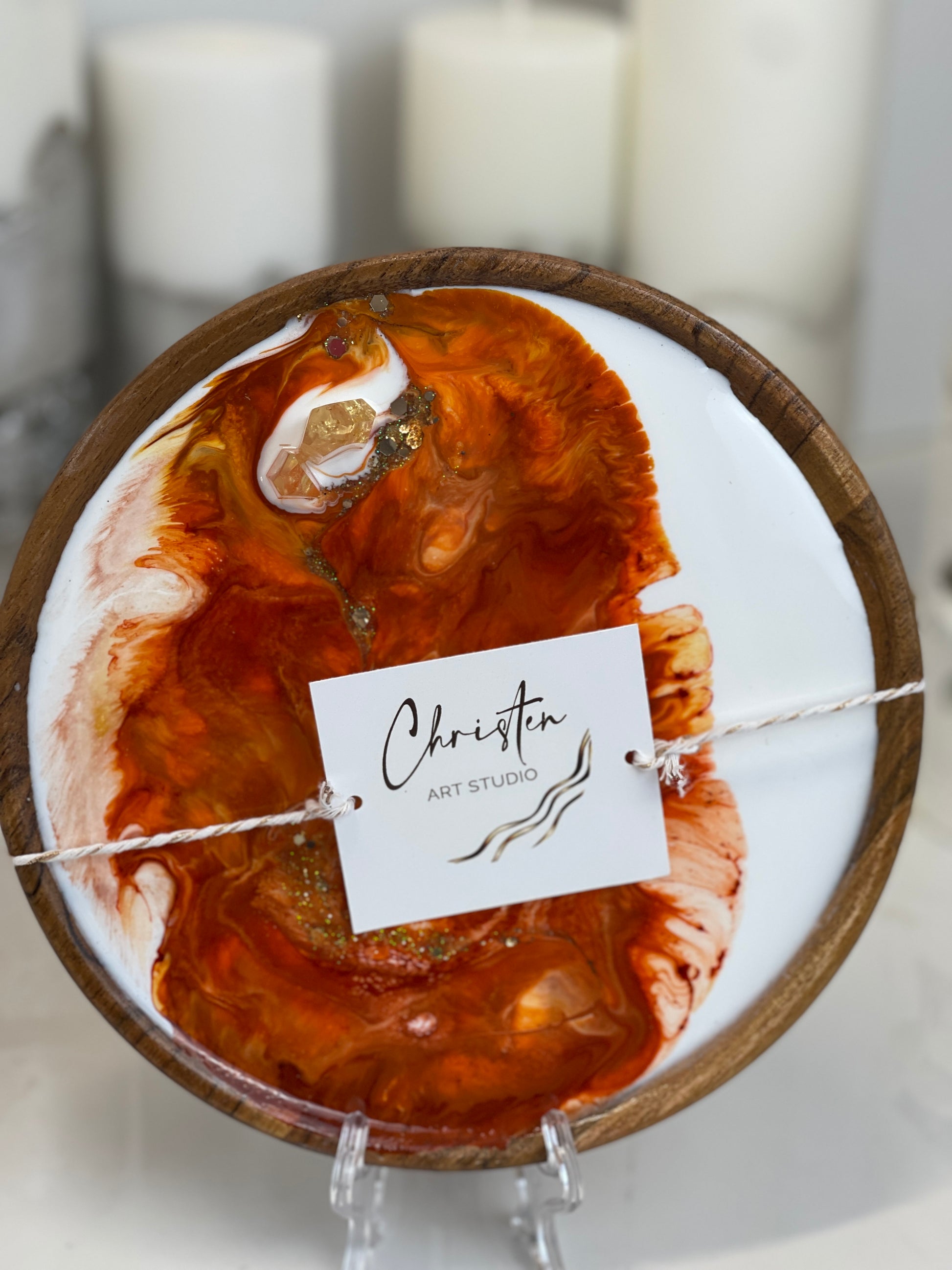 The round Crystal resin wooden tray is the perfect addition to your home! The tray was hand-poured in different shades of white, and dark orange making it a beautiful piece perfect for your keys. Plus, the tray can even be placed on display in your kitchen interior styling! It would also make a great wedding gift, birthday gift, or housewarming gift.