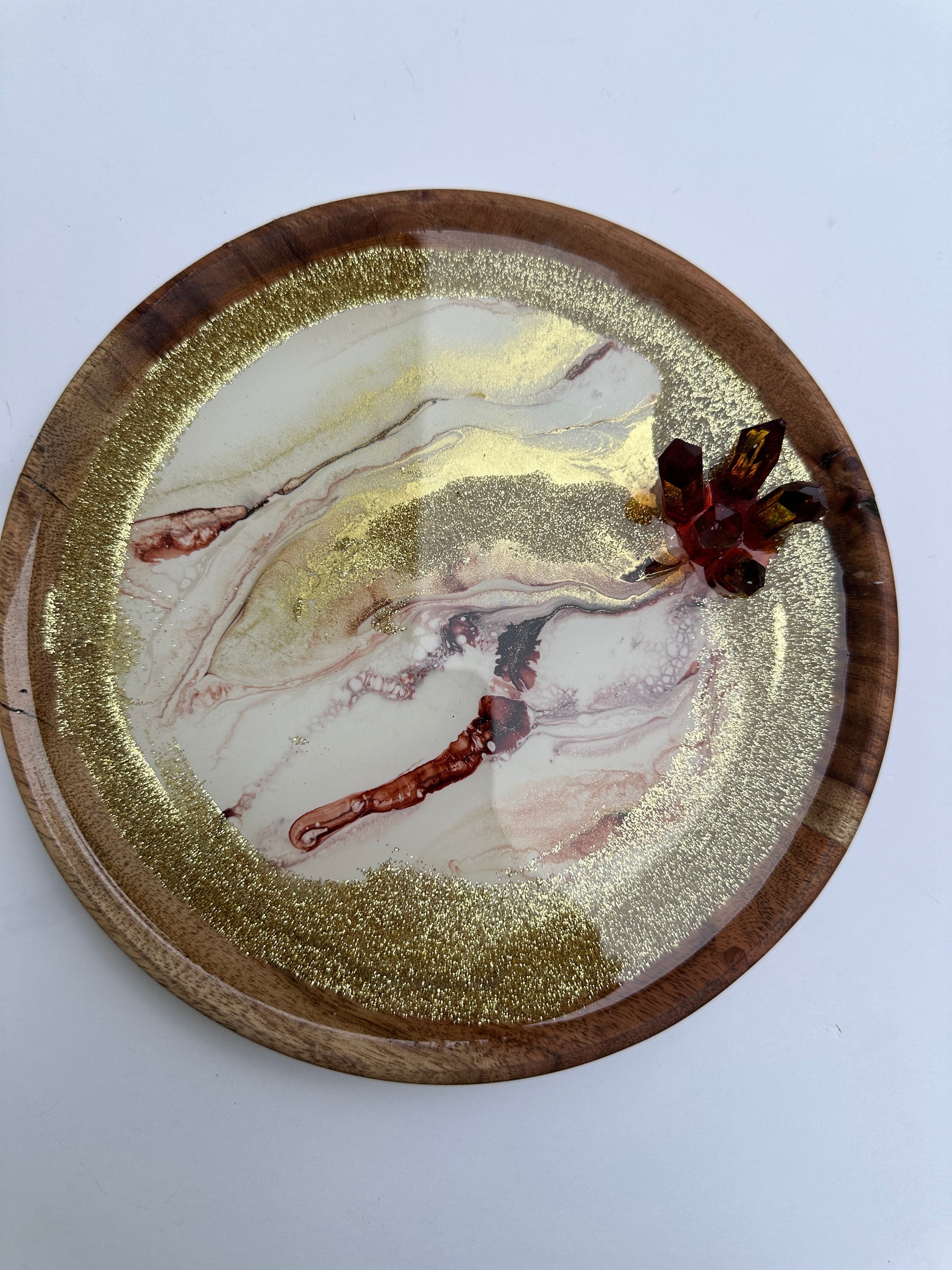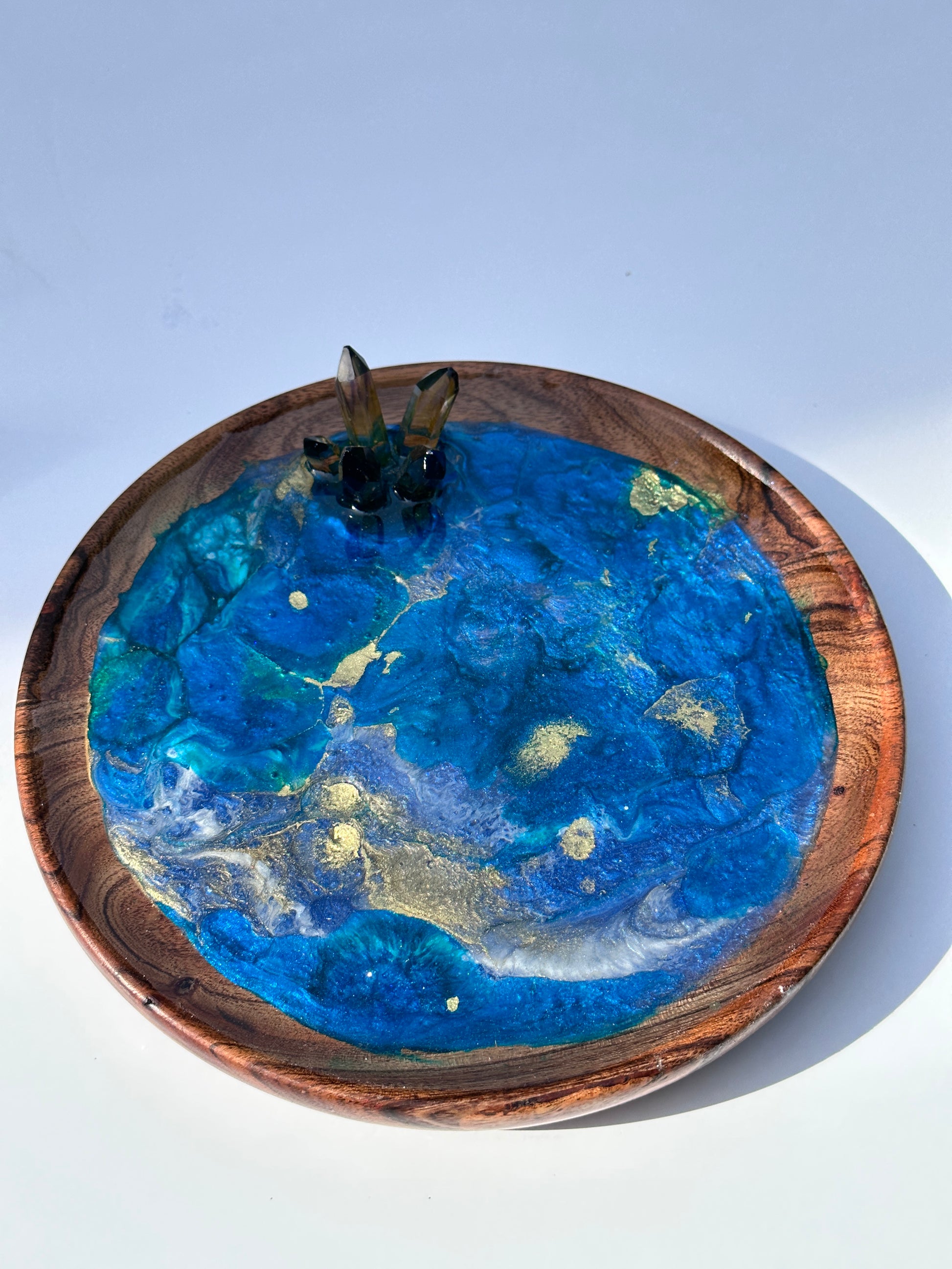 The round Crystal resin wooden tray is the perfect addition to your home! The tray was hand-poured in shades of blues and gold, making it a beautiful piece perfect for your keys. Plus, the tray can be displayed in your kitchen interior styling! It would also make a great wedding, birthday, or housewarming gift.