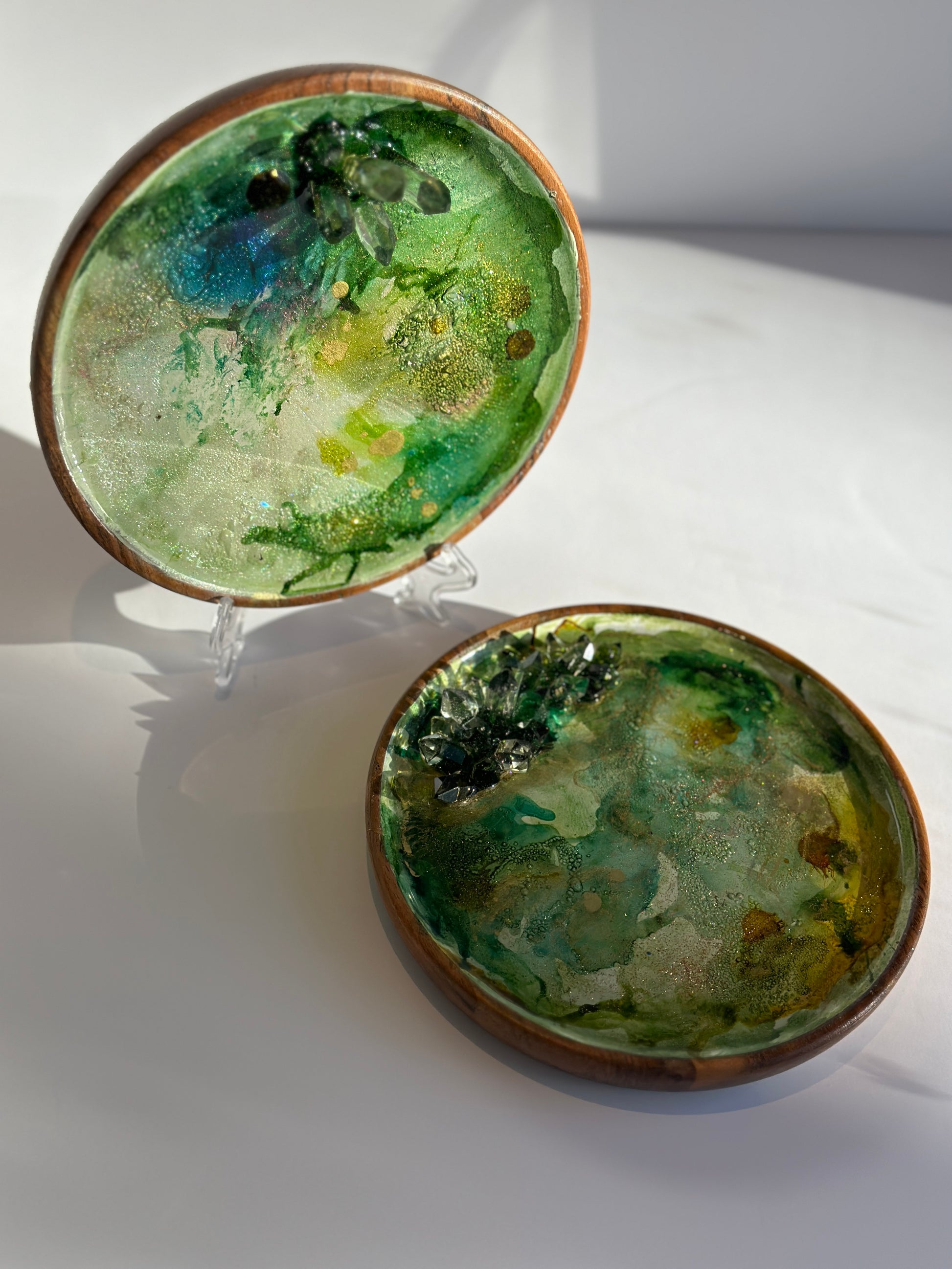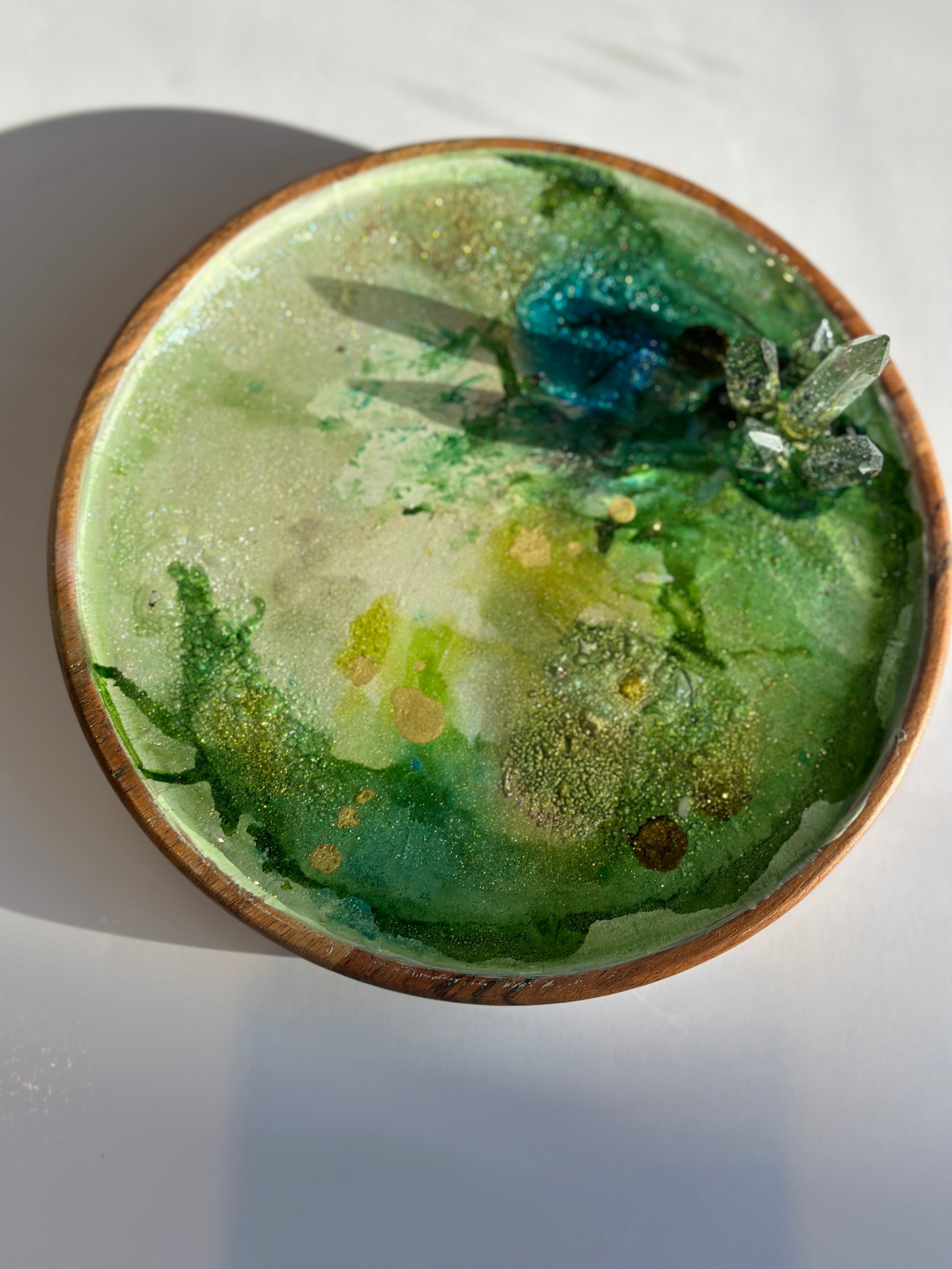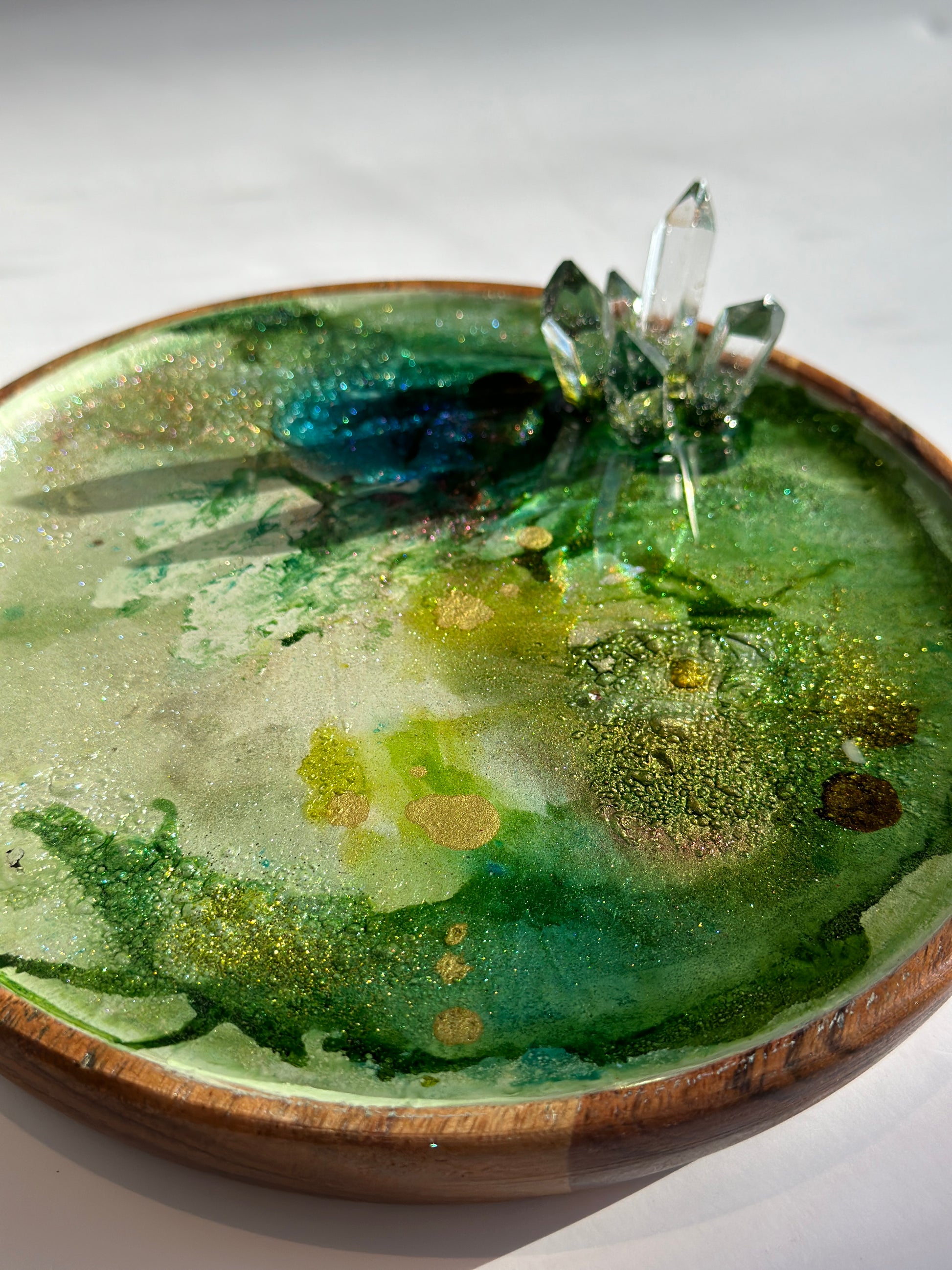 The round Crystal resin wooden tray is the perfect addition to your home! The tray was hand-poured in shades of greens and gold, making it a beautiful piece perfect for your keys. Plus, the tray can be displayed in your kitchen interior styling! It would also make a great wedding, birthday, or housewarming gift.