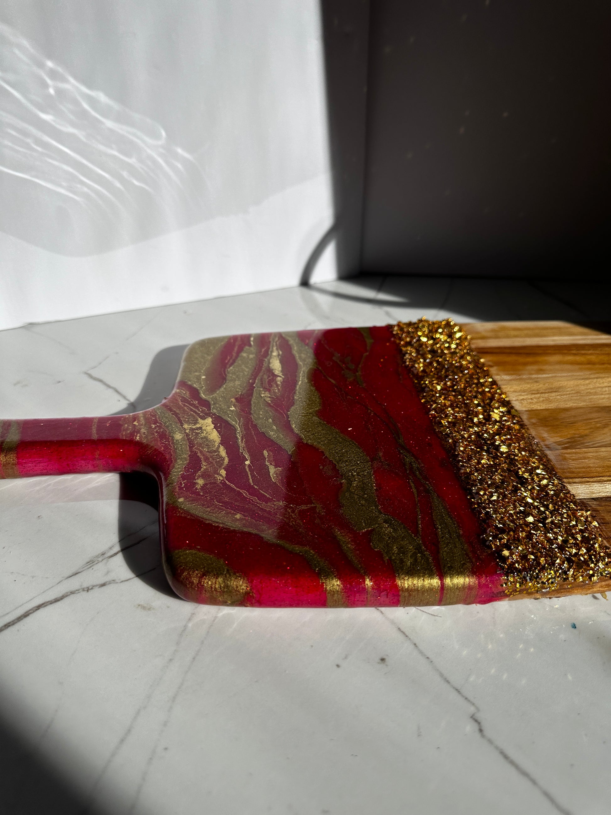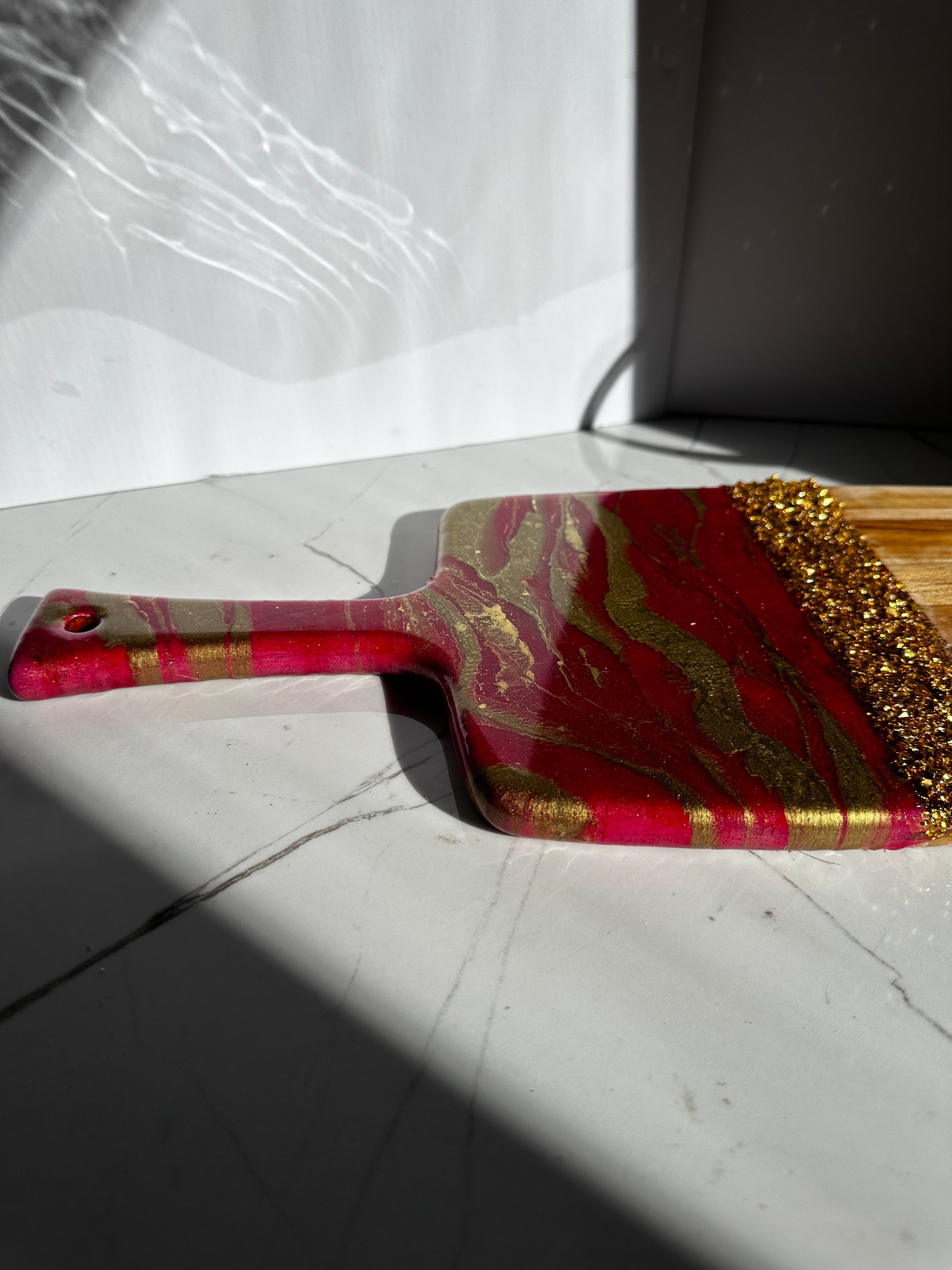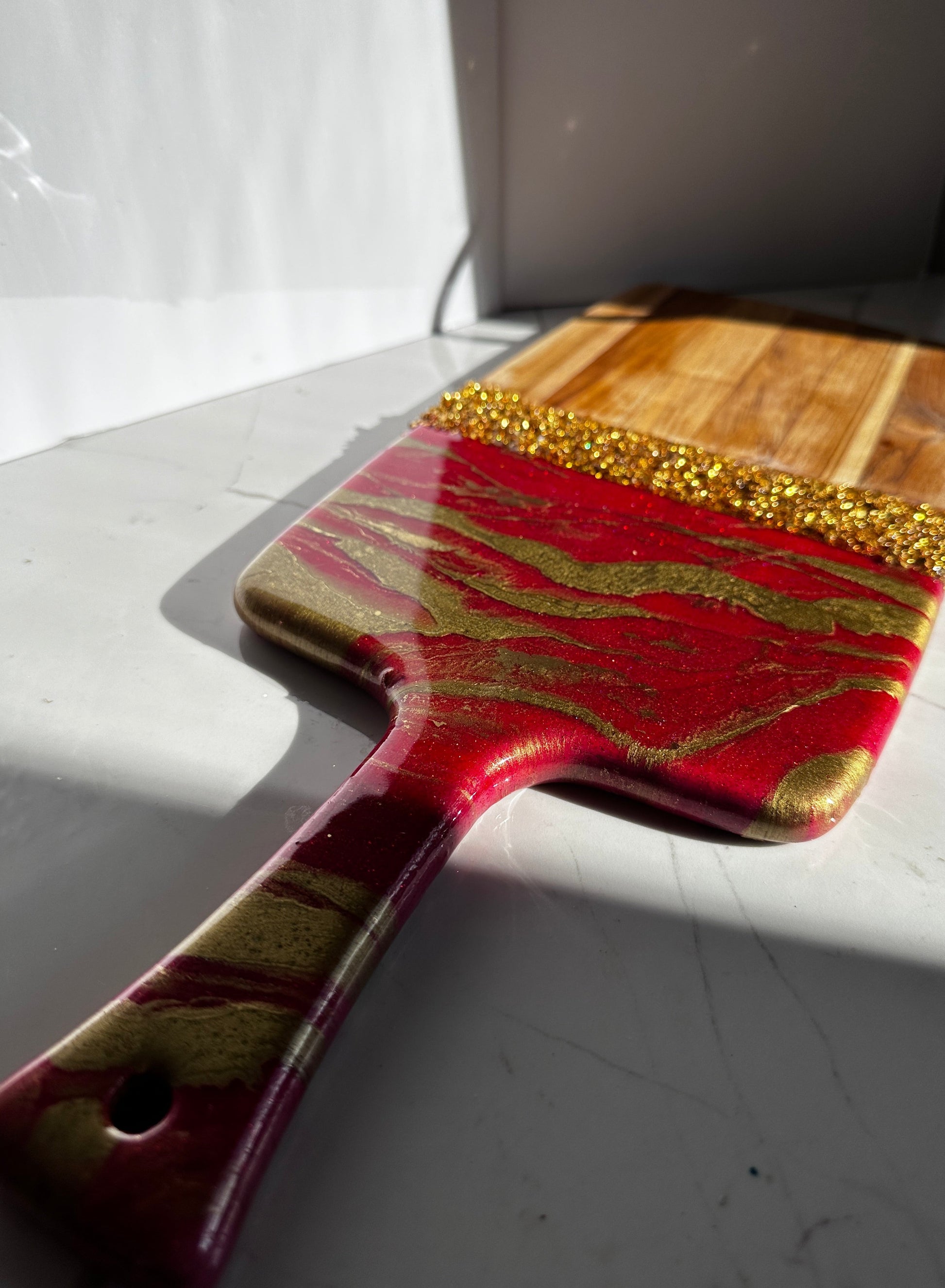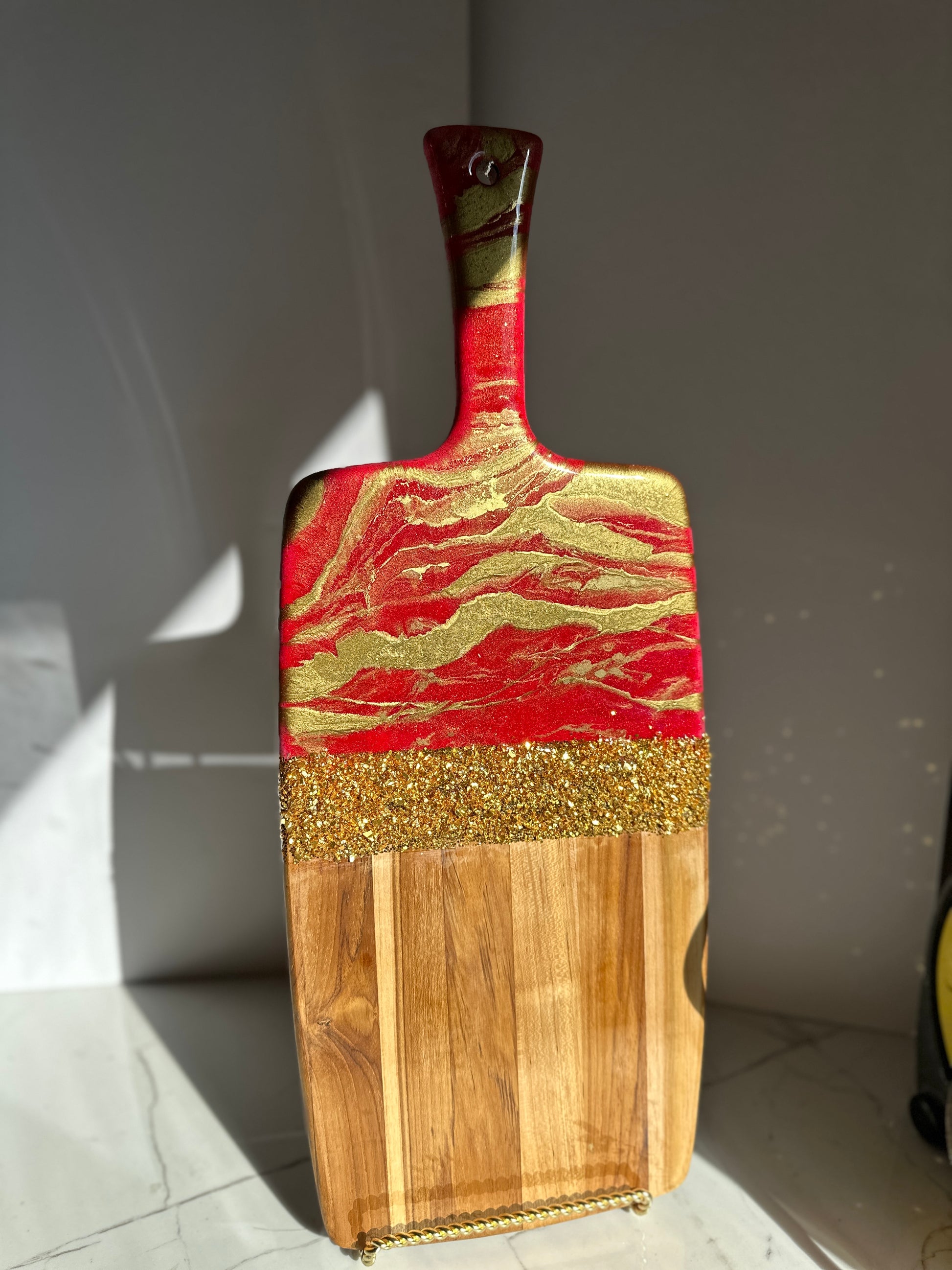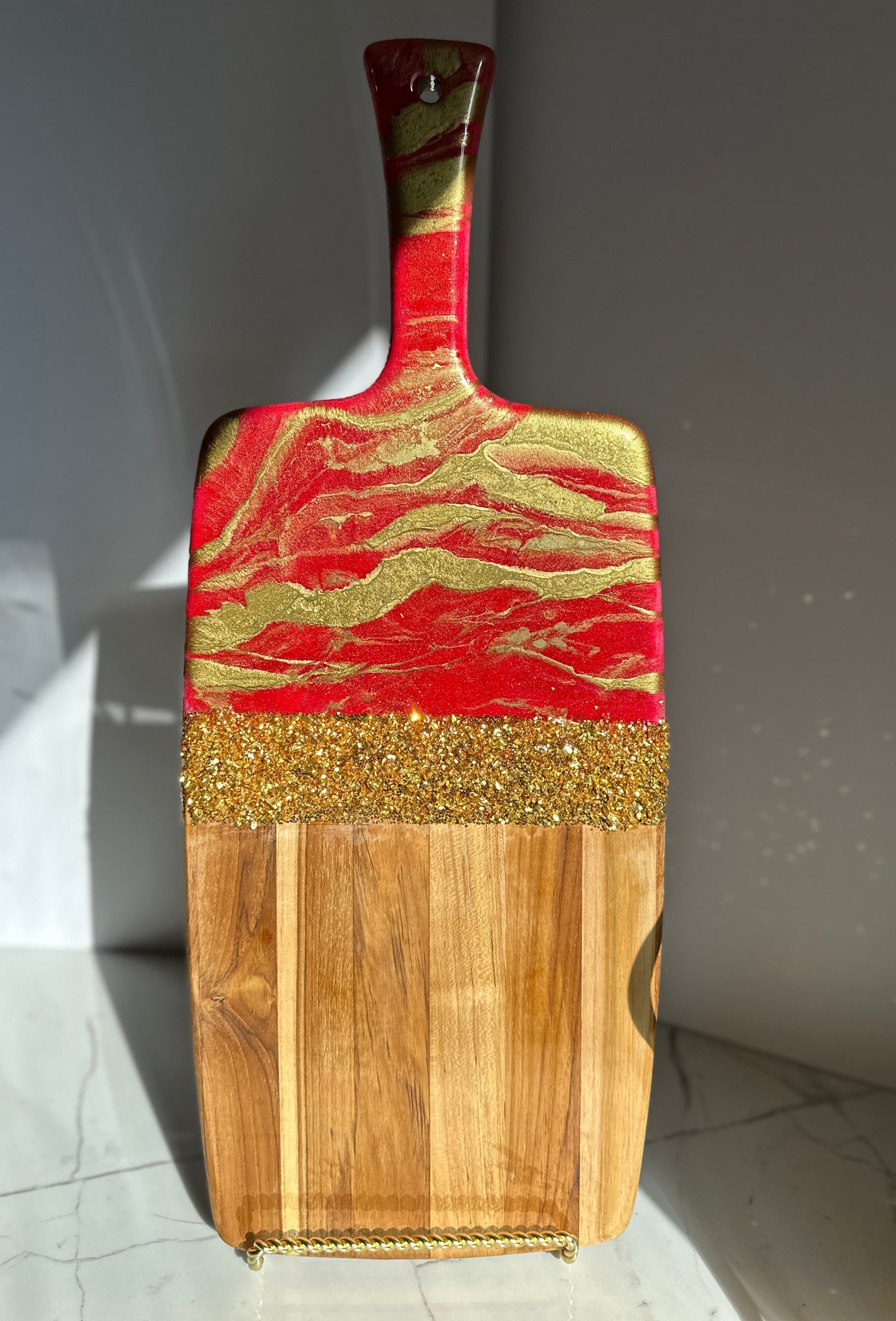 Looking for a unique and stylish cheese board? This Ruby Red Geode Design Resin Cheese Board is perfect for entertaining. The hand-poured resin art is a beautiful mix of gold, red, teal, and colors in a geode design. The stones add a touch of elegance and make this cheese board one-of-a-kind. It also makes an excellent present for weddings, birthdays, or housewarmings.