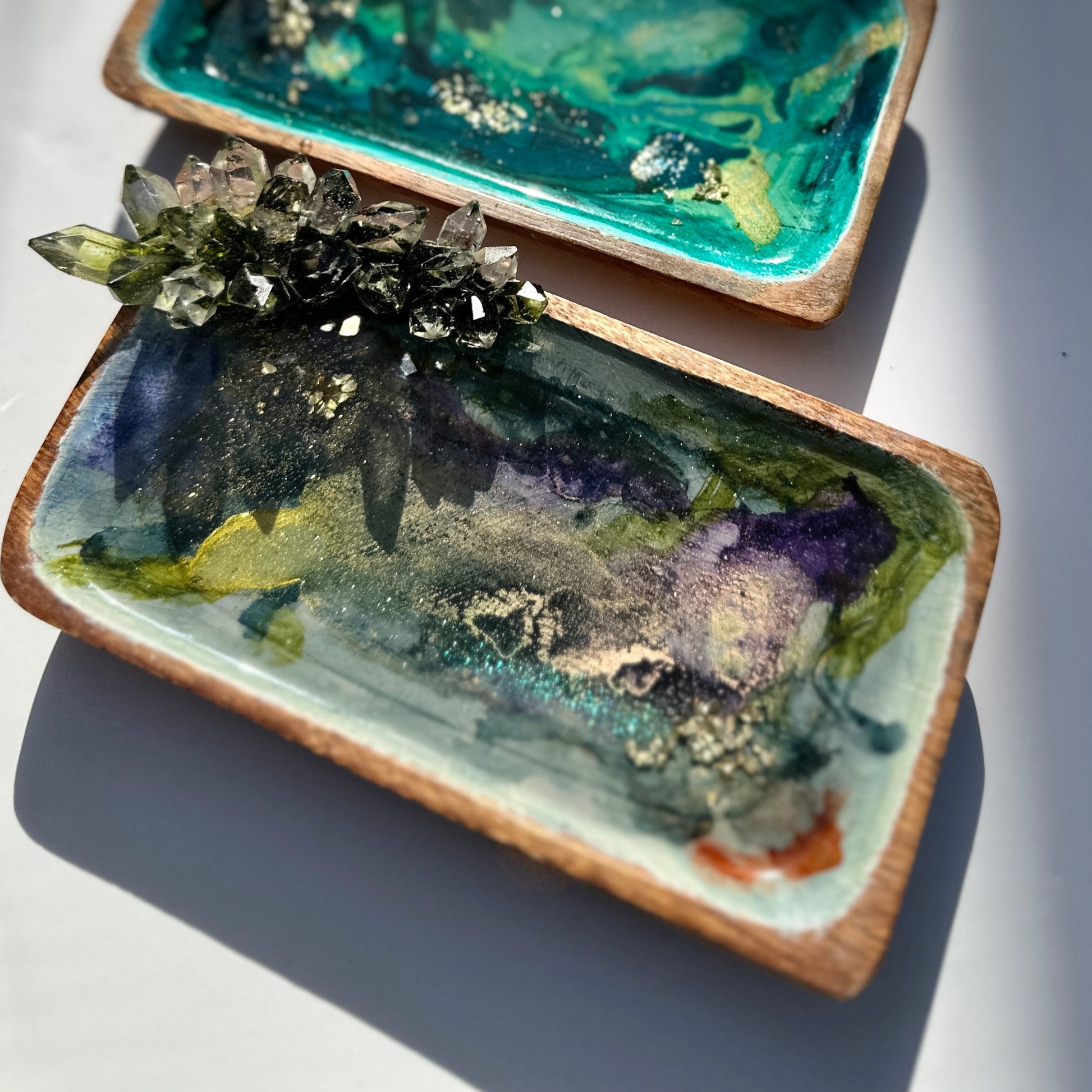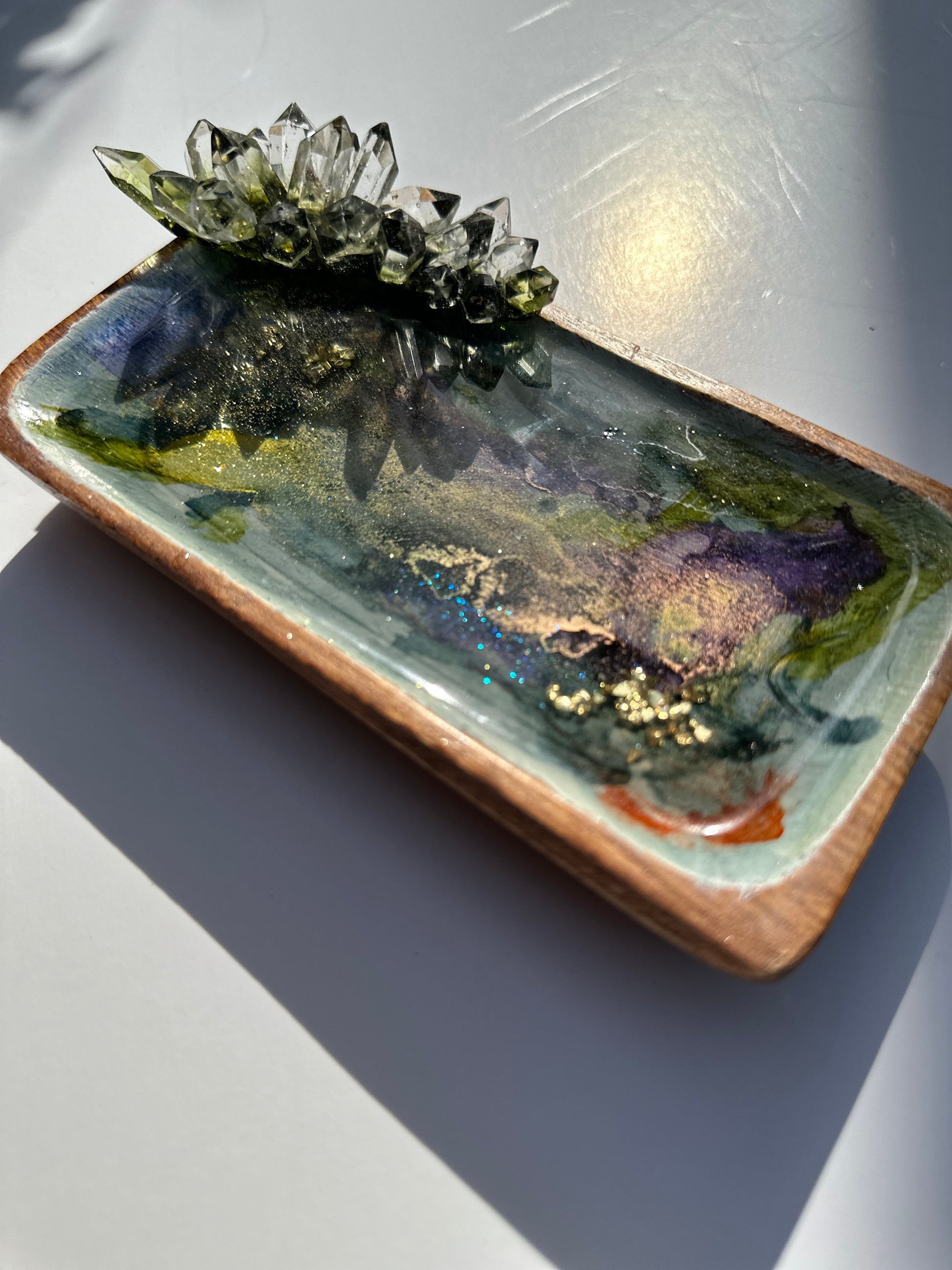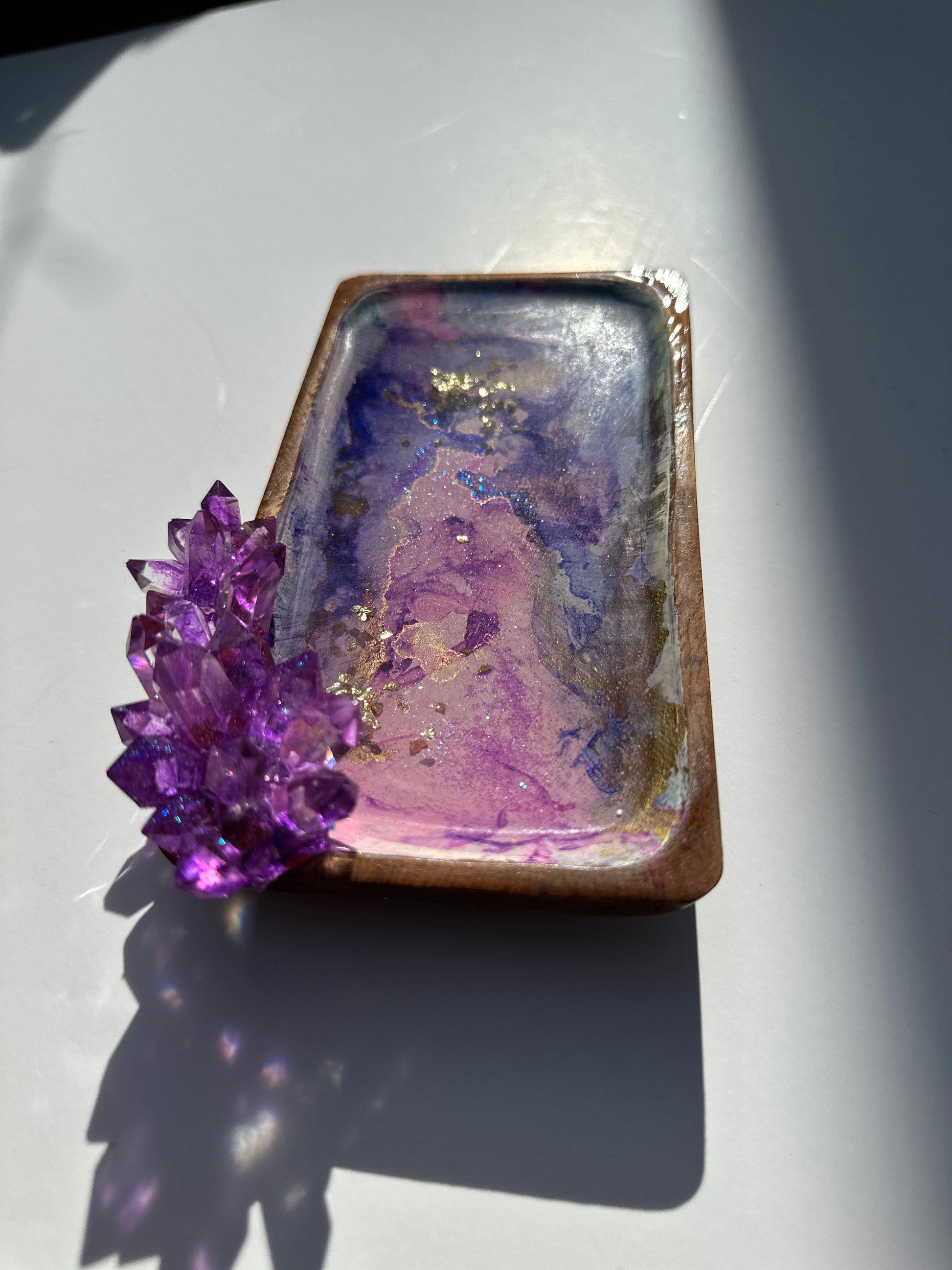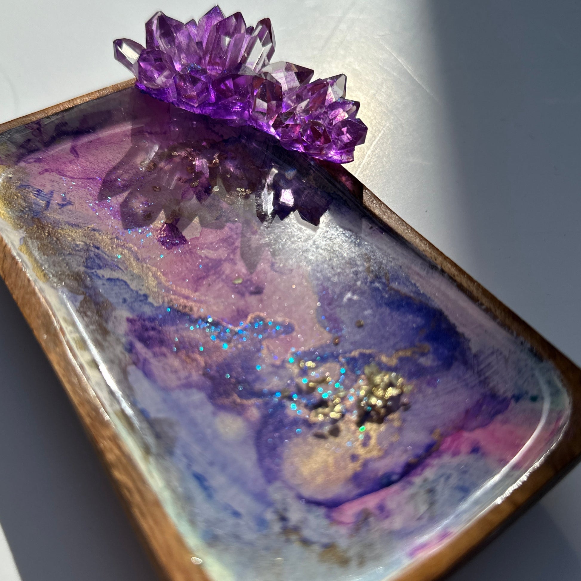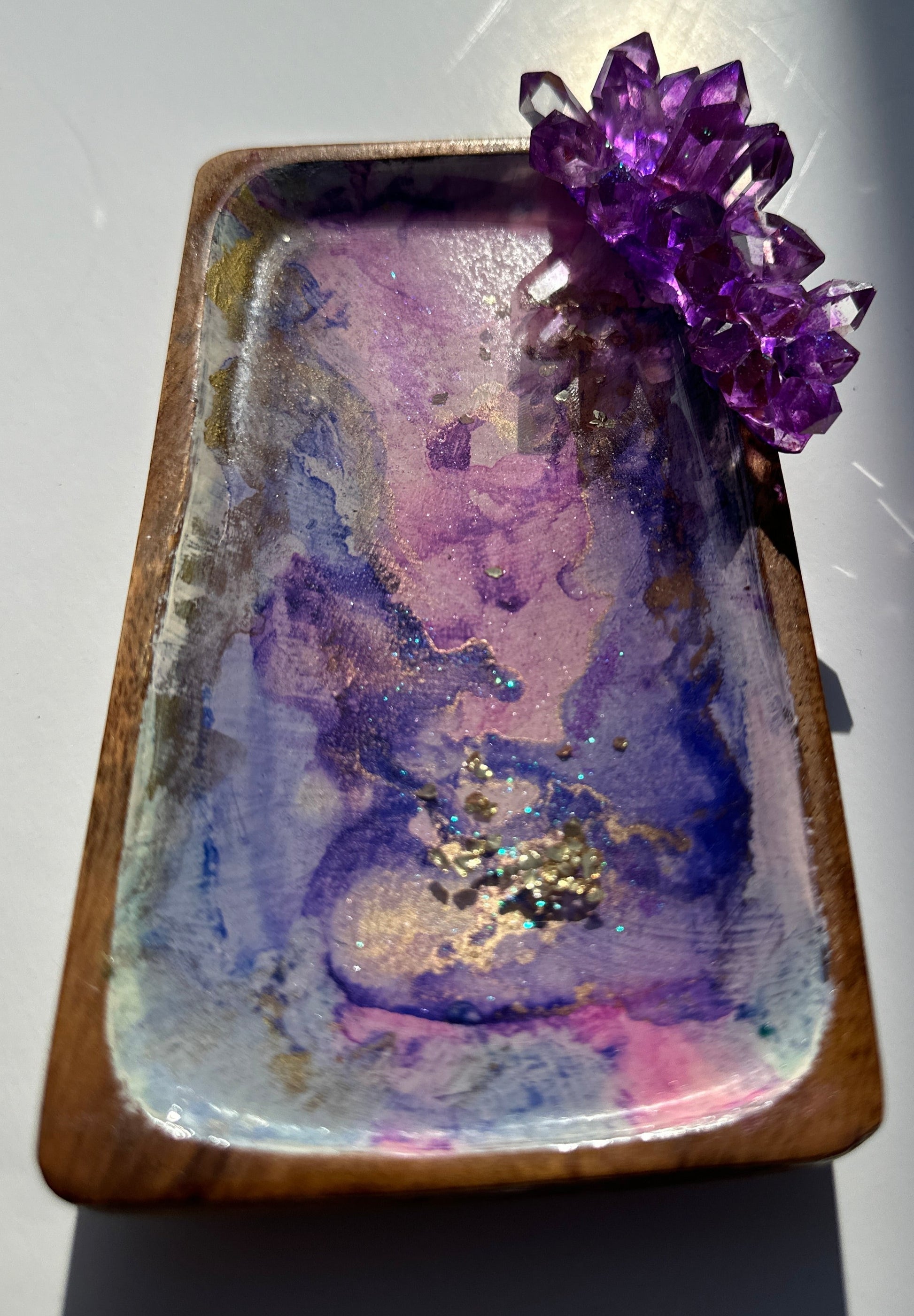 Introducing the Vibrant Crystal Cluster Trinket Tray, meticulously handcrafted from epoxy resin, real dry flowers, gold flakes, and a stunning crystal cluster. This colorful and unique tray adds a touch of nature-inspired charm to your space while serving as a stylish storage solution.