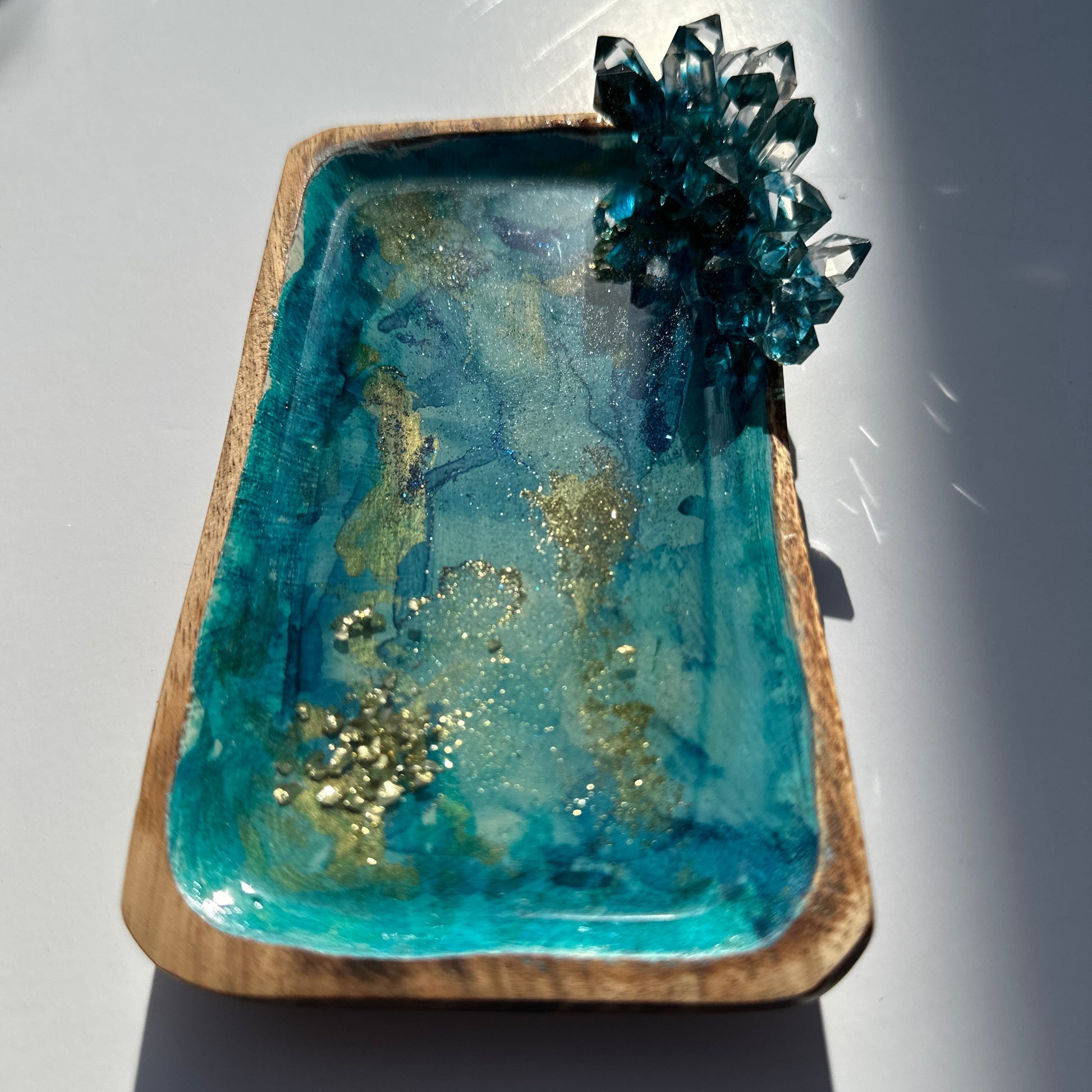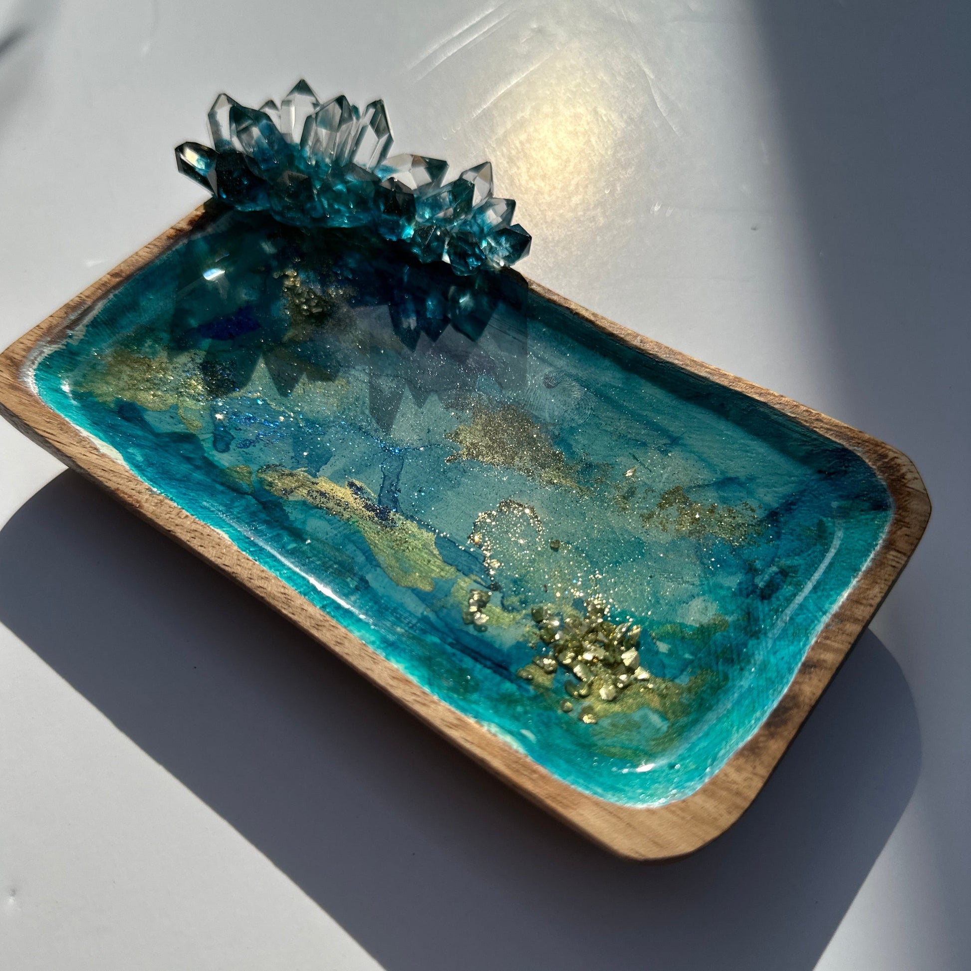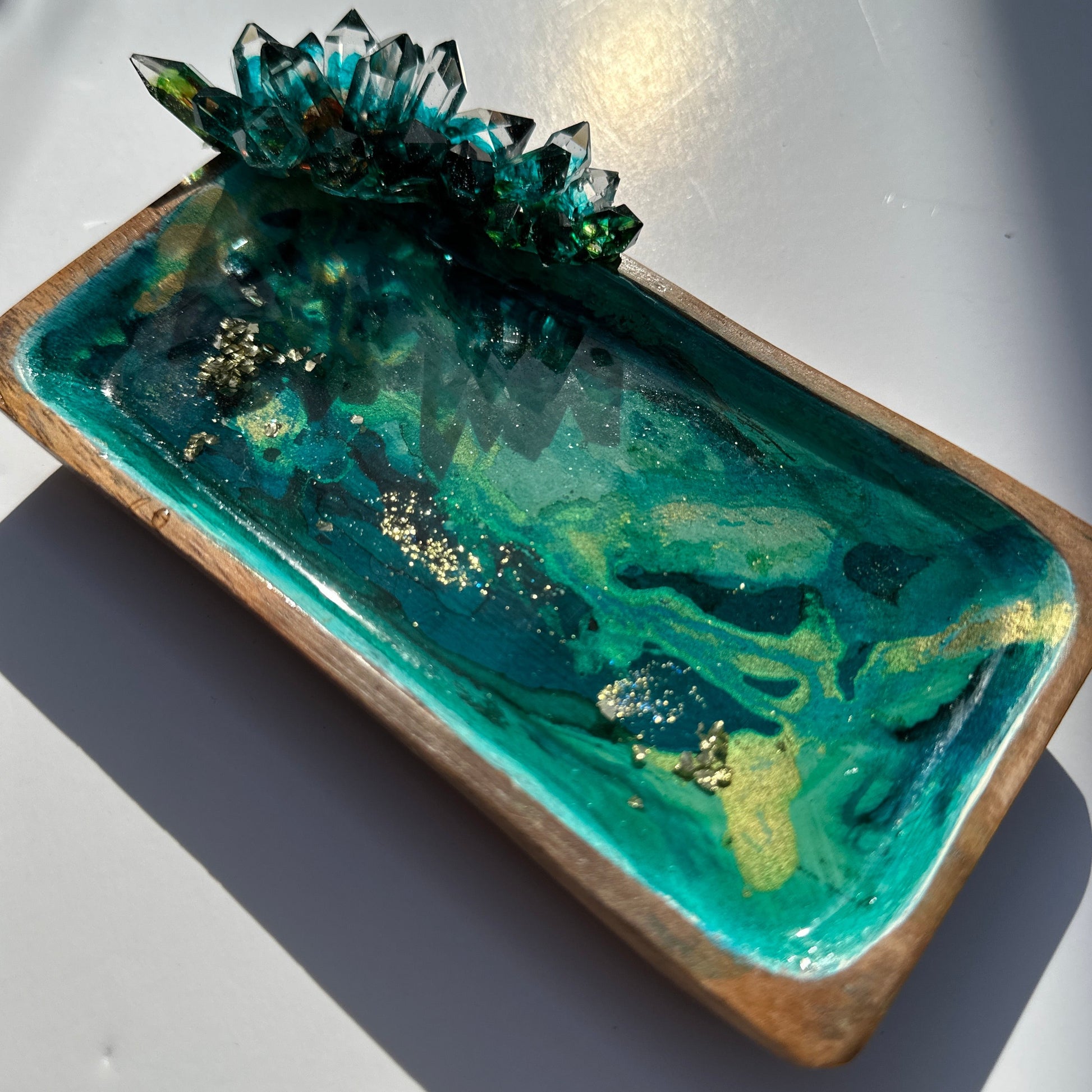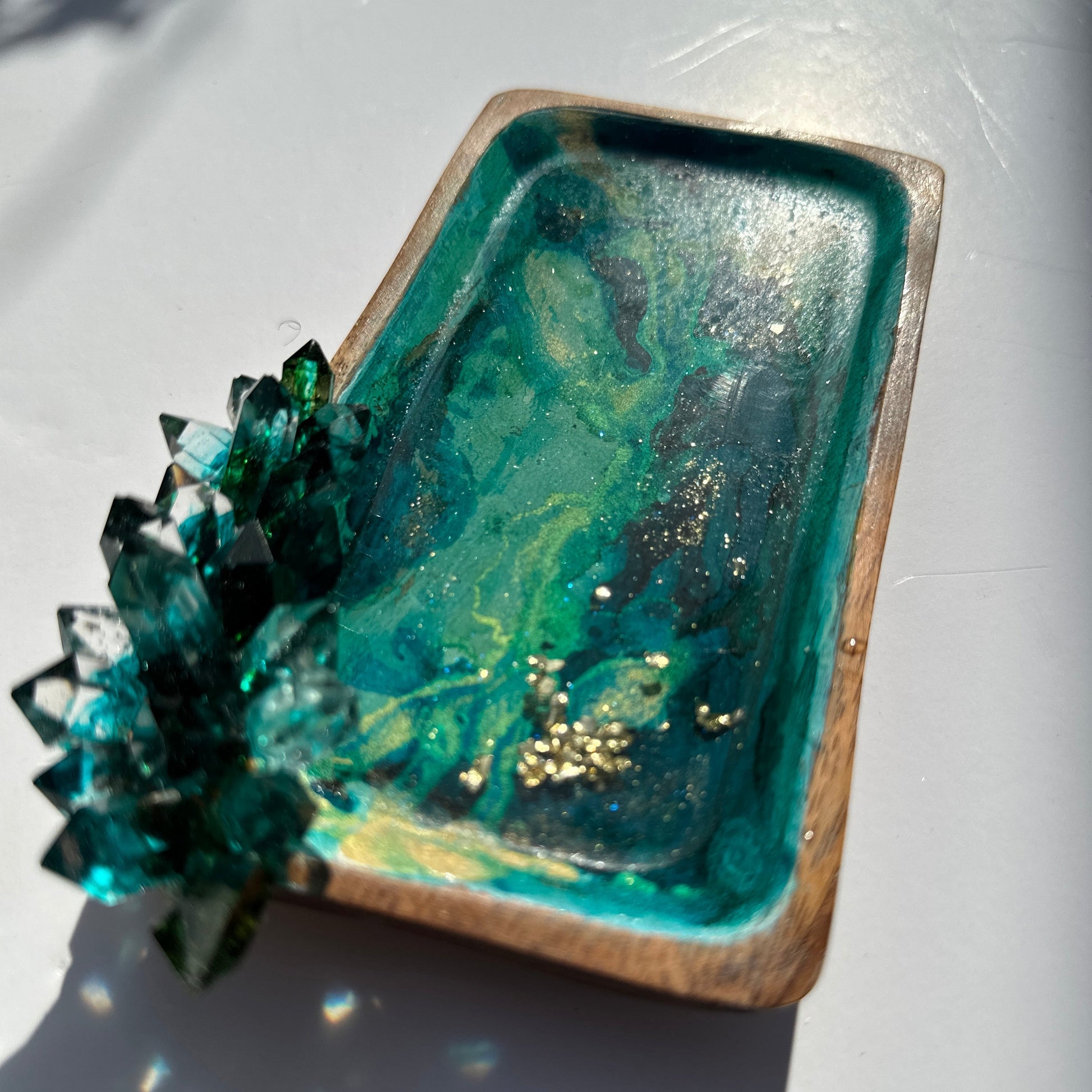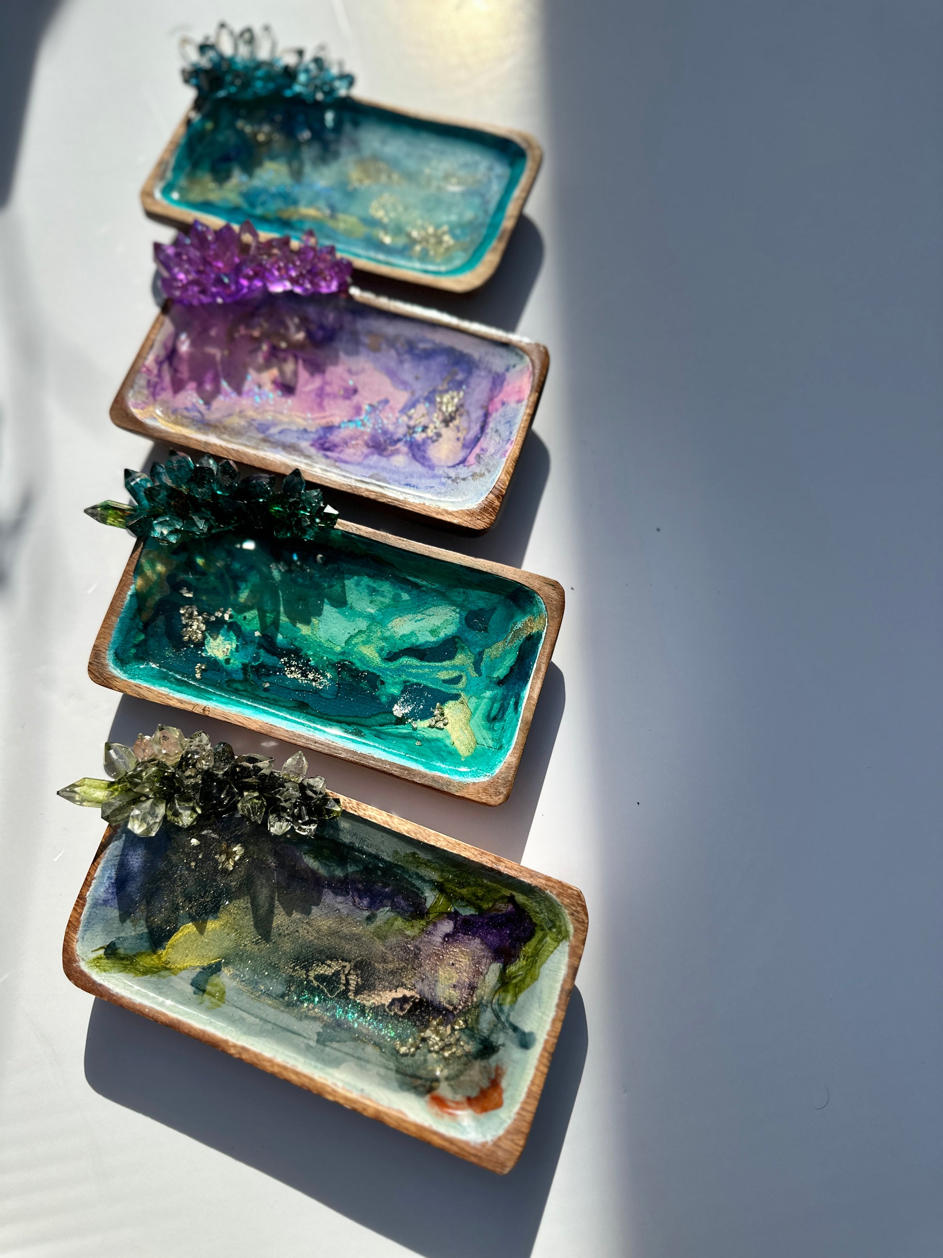 #VibrantCrystalClusterTrinketTray #HandmadeTrinketTray #DryFlowerDesign #GoldFlakes #EpoxyResin #HeatResistant #HomeDecor #NatureInspired #UniqueGiftIdea #ColorfulTray #CrystalCluster