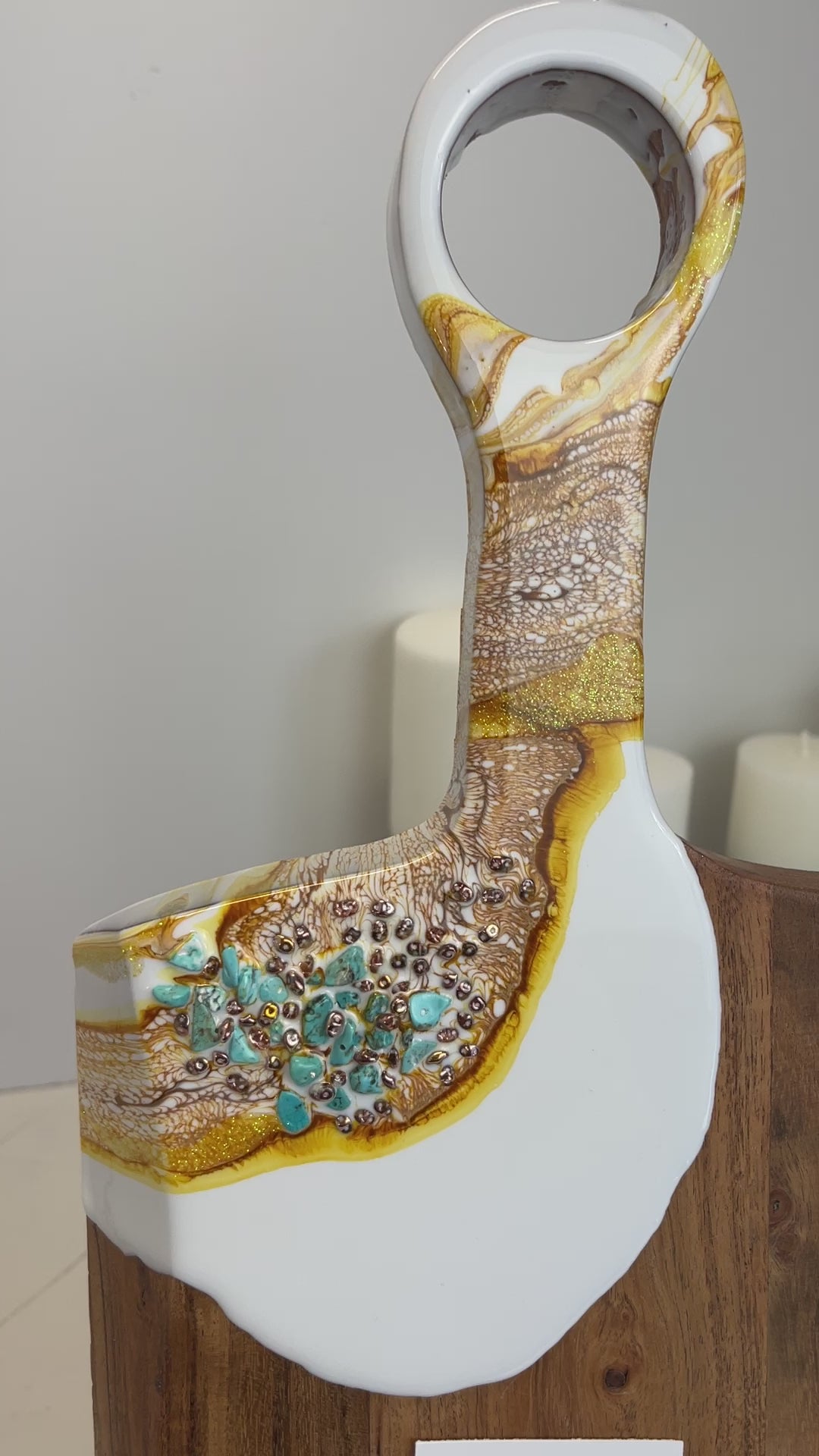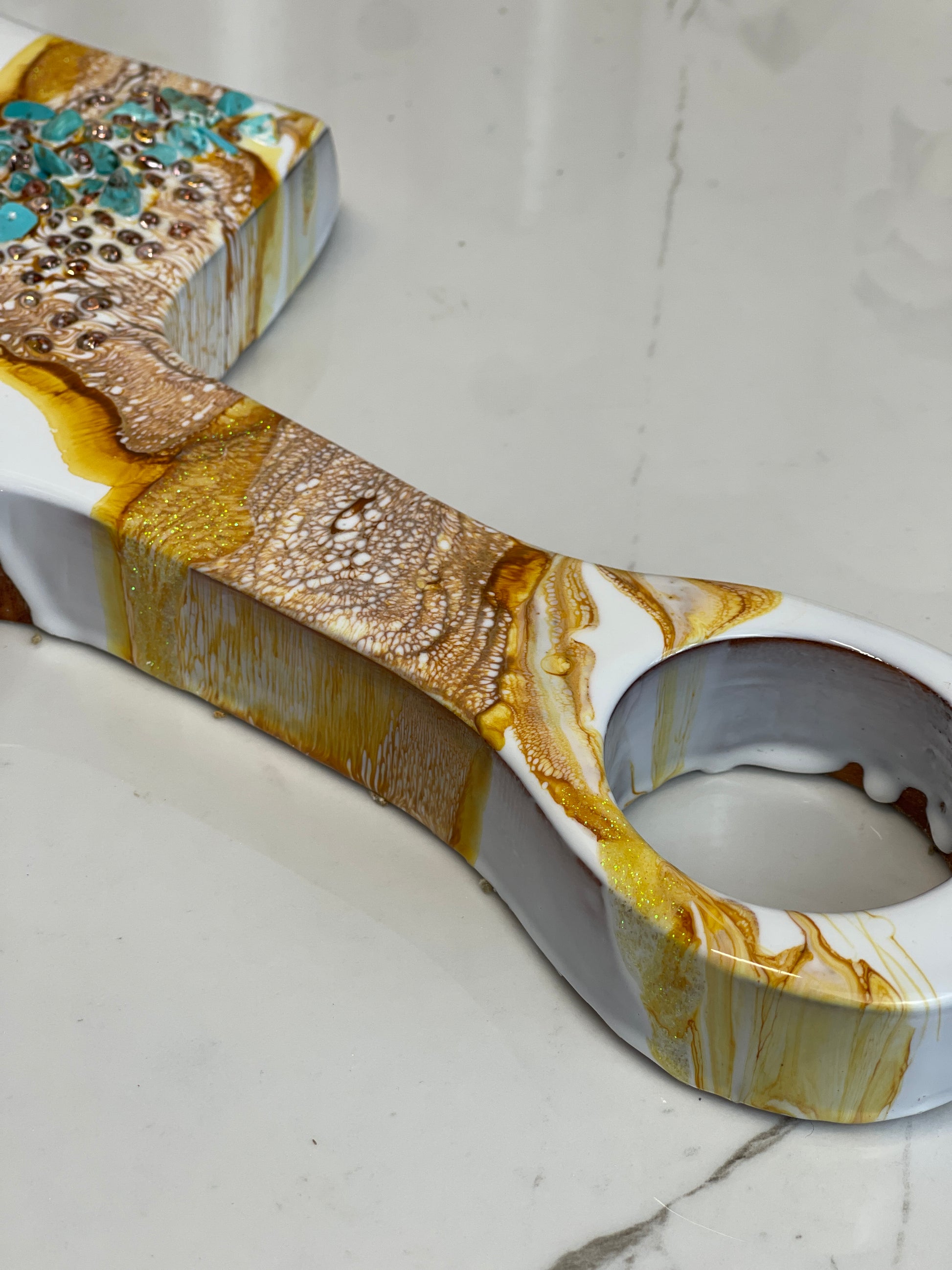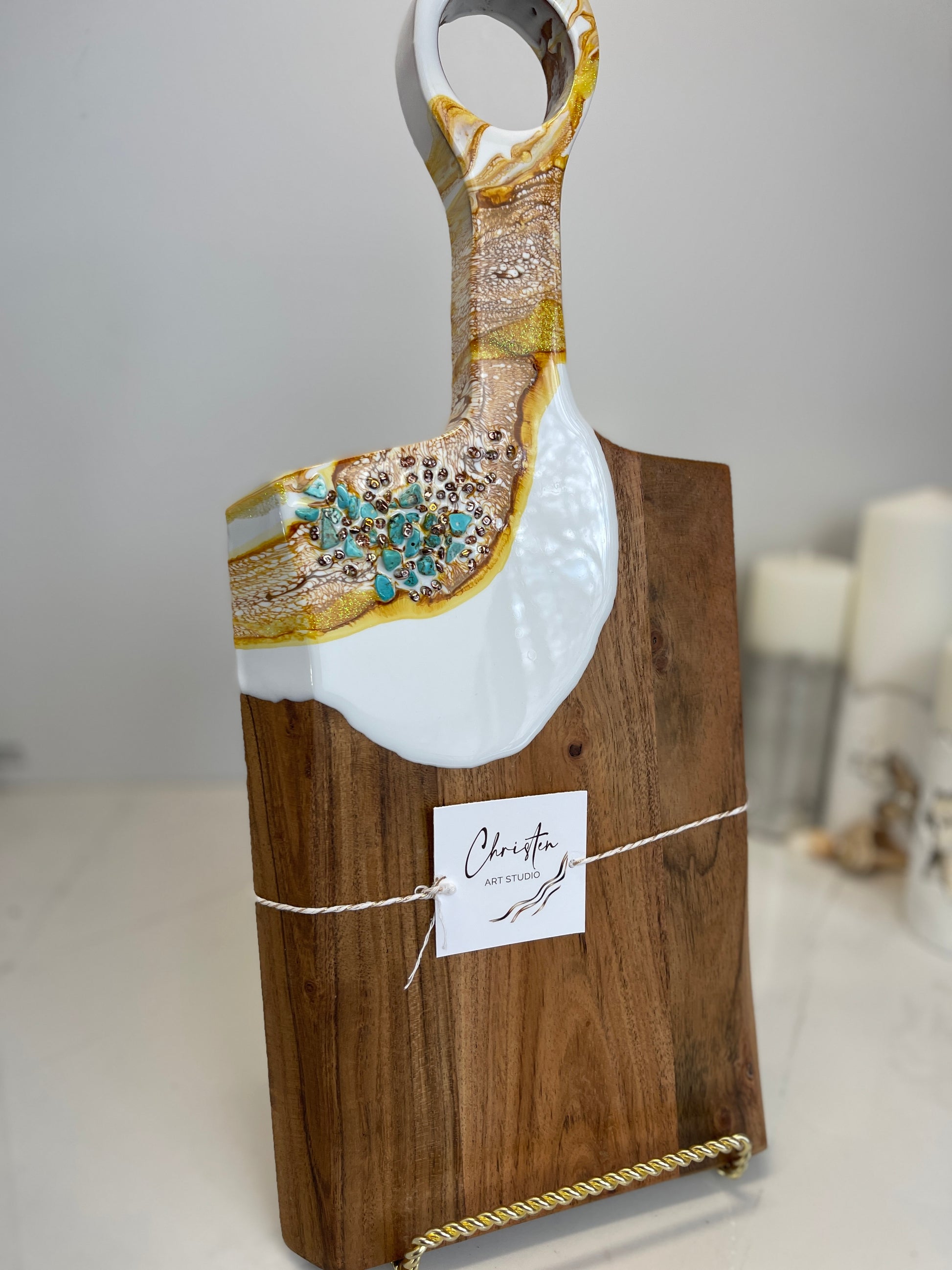 Looking for a unique and stylish cheese board? This variety of Geode Design Resin Cheese Board is perfect for entertaining. The hand-poured resin art is a beautiful mix color in a geode design. The stones add a touch of elegance and make this cheese board one-of-a-kind. It also makes a great present for weddings, birthdays, or housewarming