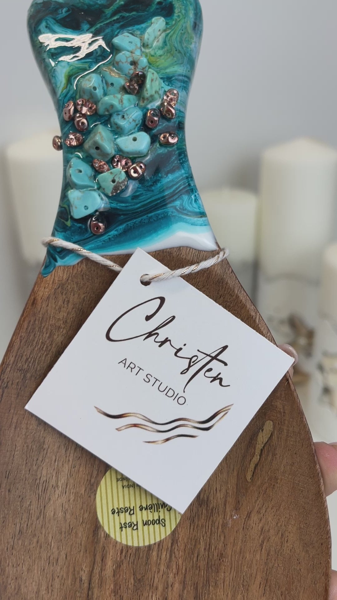 Looking for a unique and stylish Spoon Rest? This Geode Design Resin spoon rest is perfect for cooking. The hand-poured resin art is a beautiful mix of color in a geode design. The stones add a touch of elegance and make this spoon rest one-of-a-kind. It also makes a great present for weddings, birthdays, or housewarming.