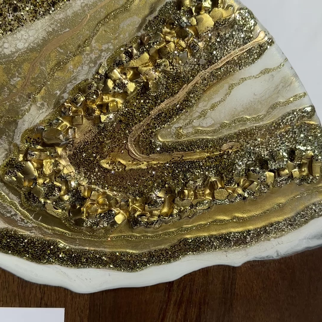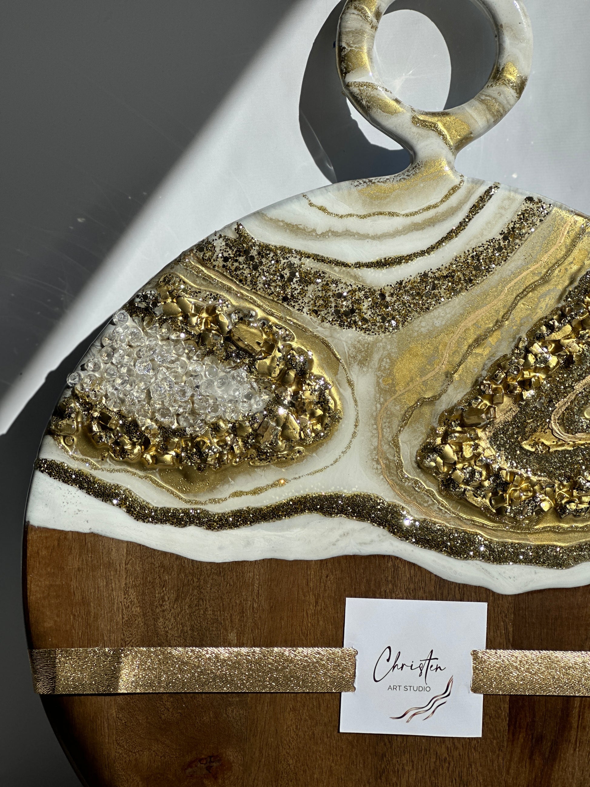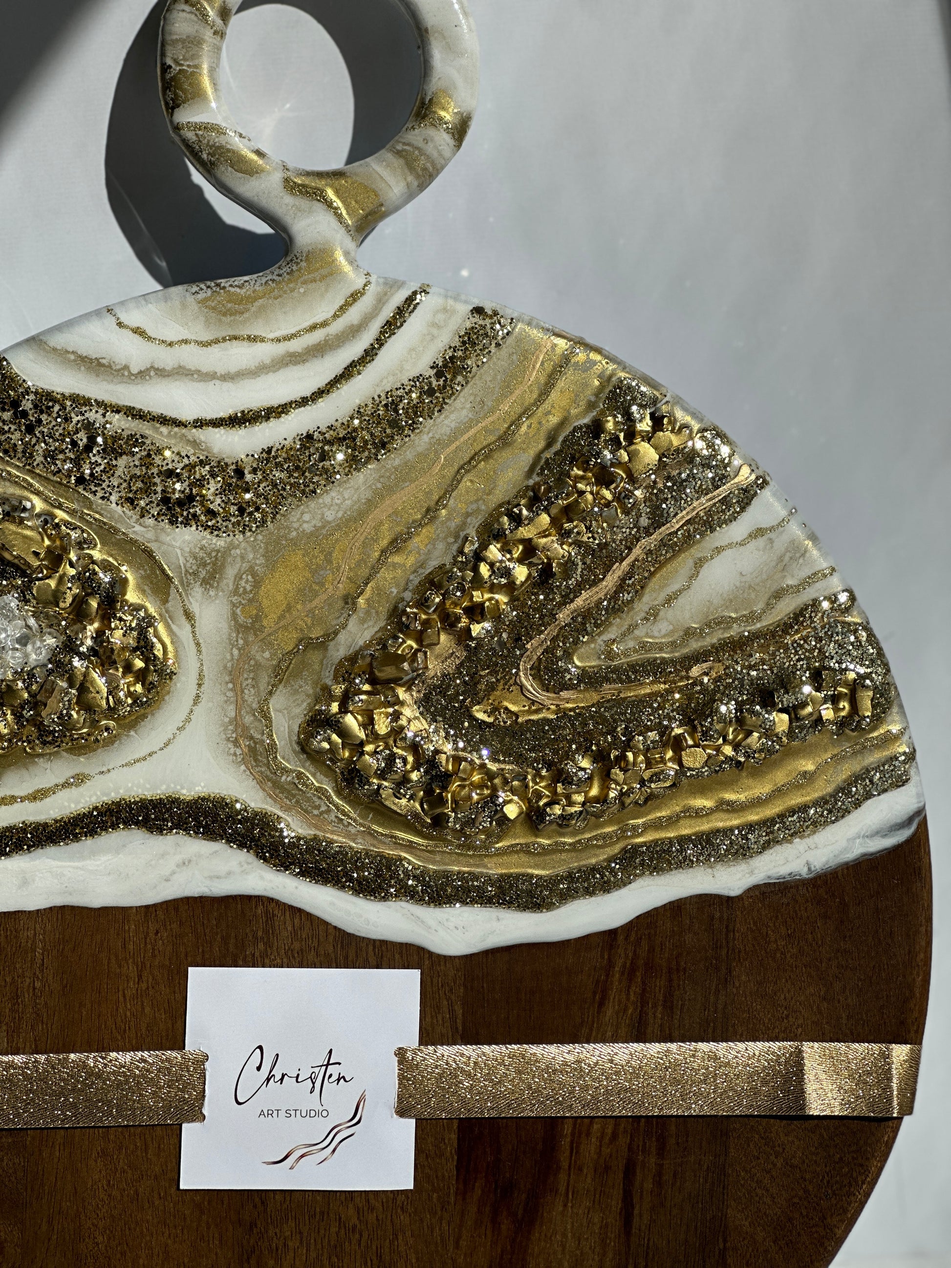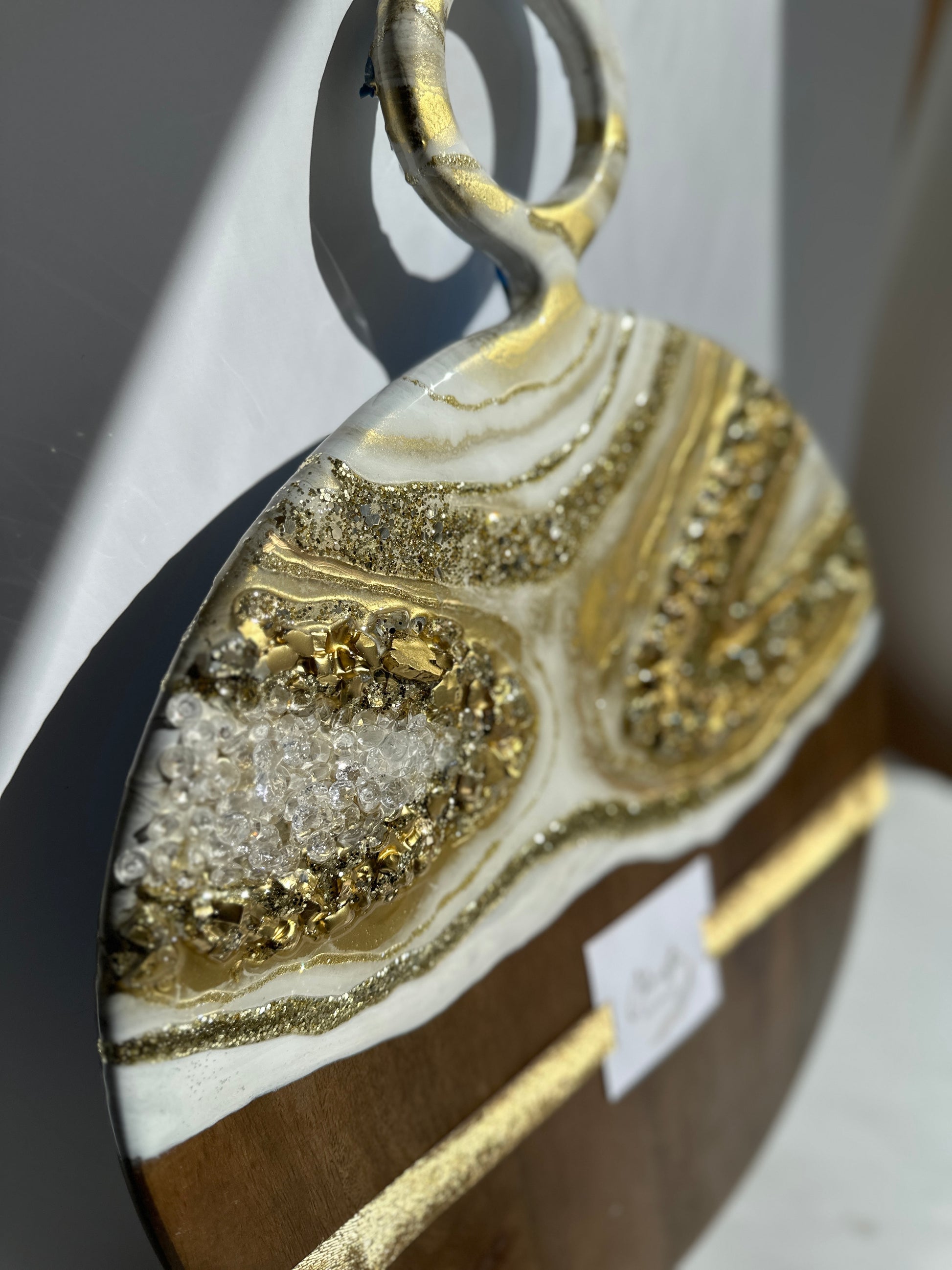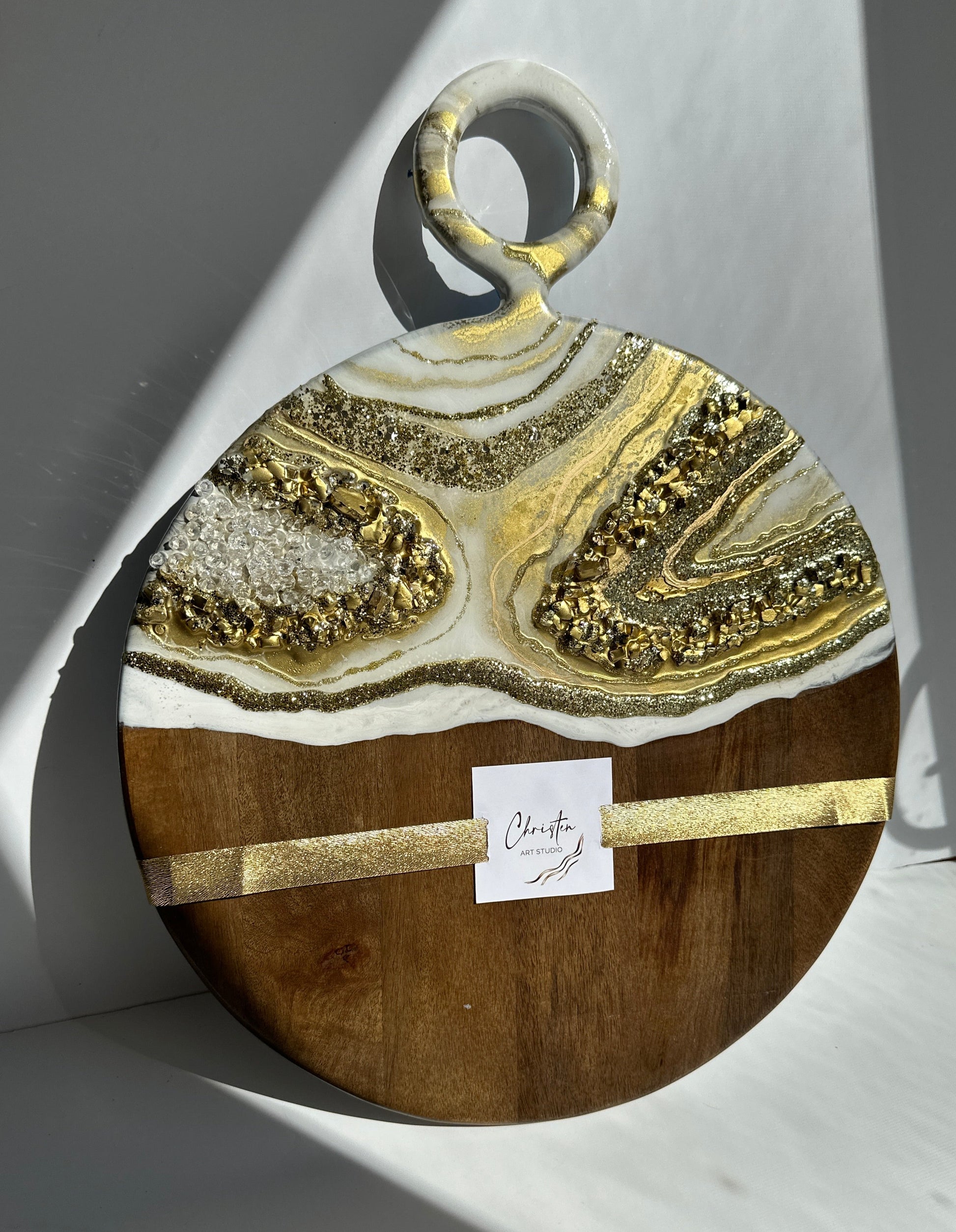 Round White & Gold Color Geode Marble Design Cheeseboard